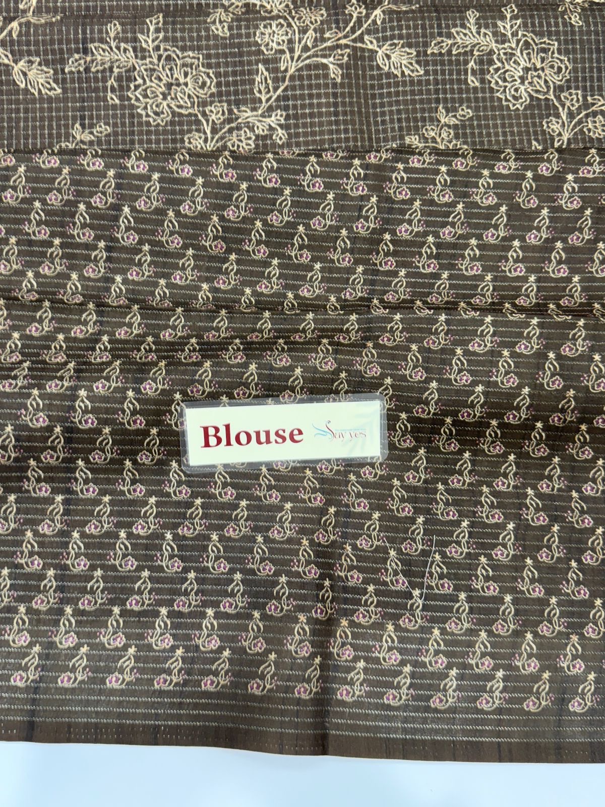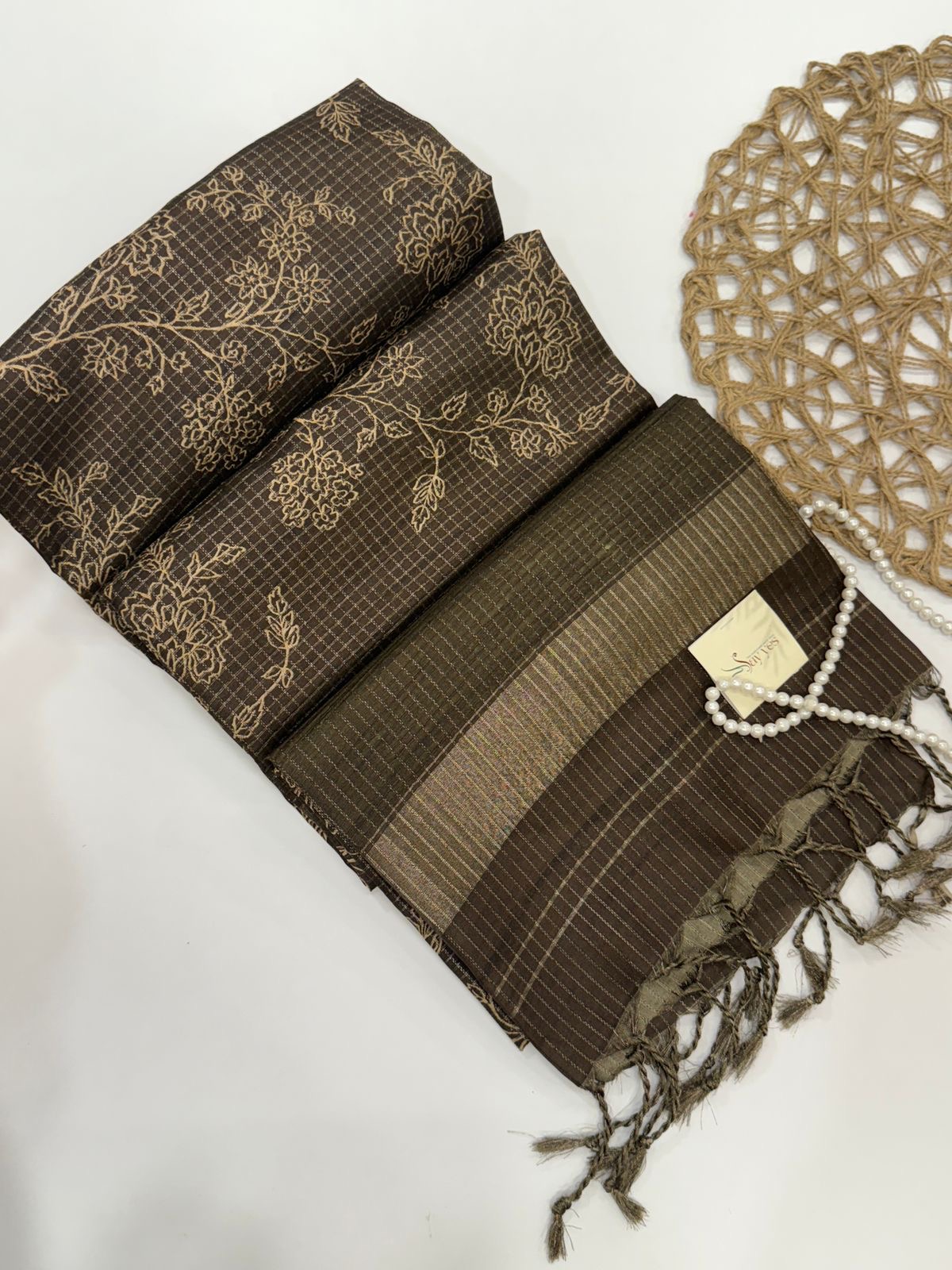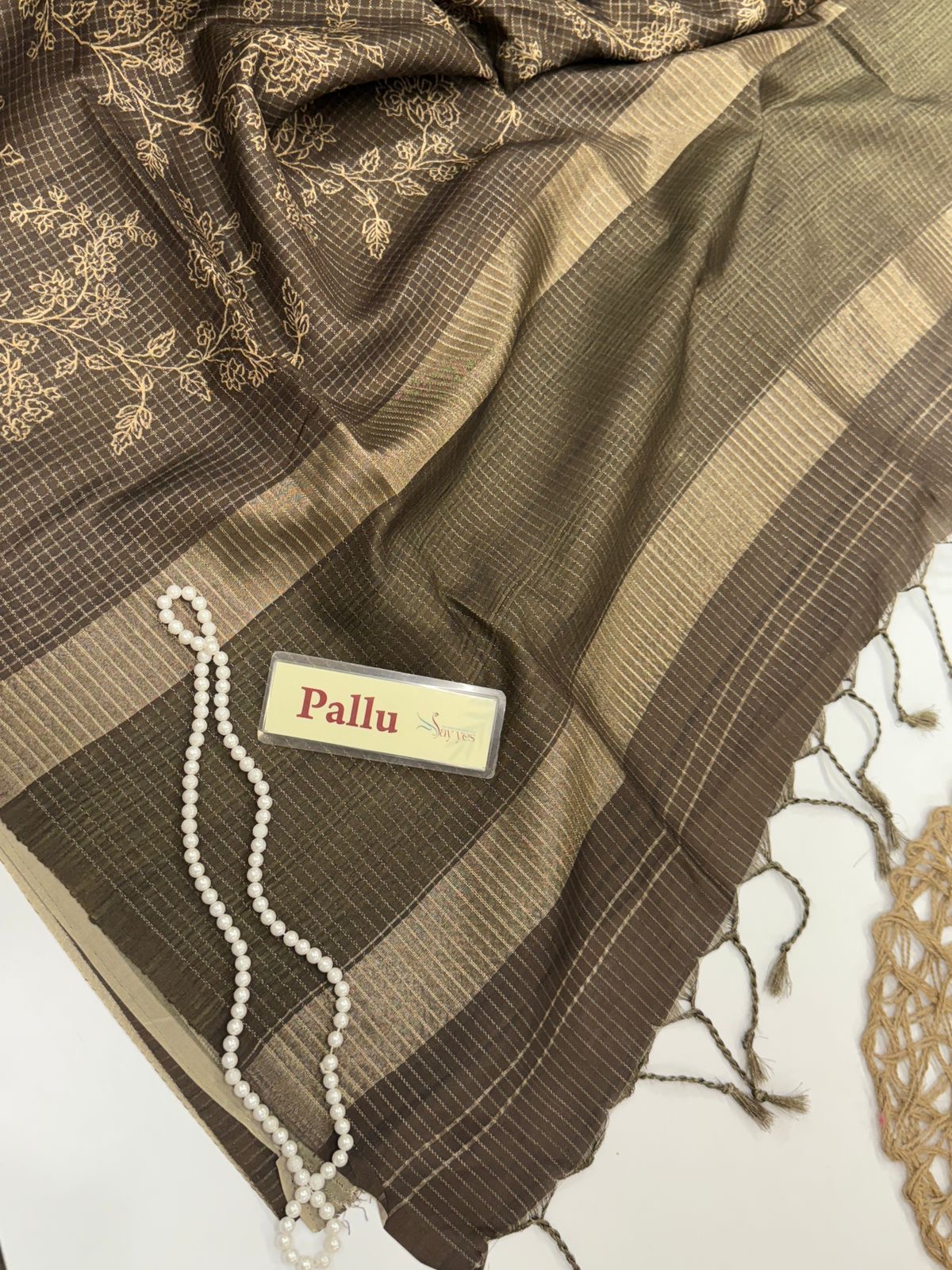 This elegant Tussar silk saree is a celebration of quiet luxury and refined craftsmanship. Set in a deep, muted green-grey base, the saree is adorned with delicate, hand-inspired floral motifs that flow organically across the body, creating a soft, artistic movement.