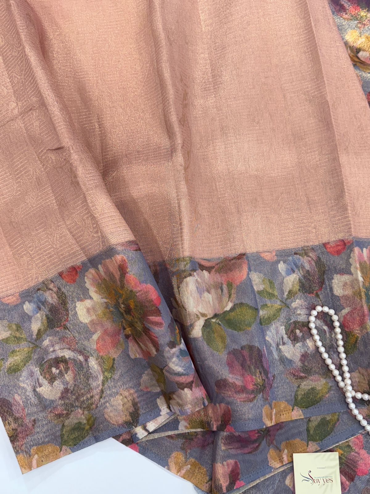 Color Palette: Peach body with Slaye grey floral pallu