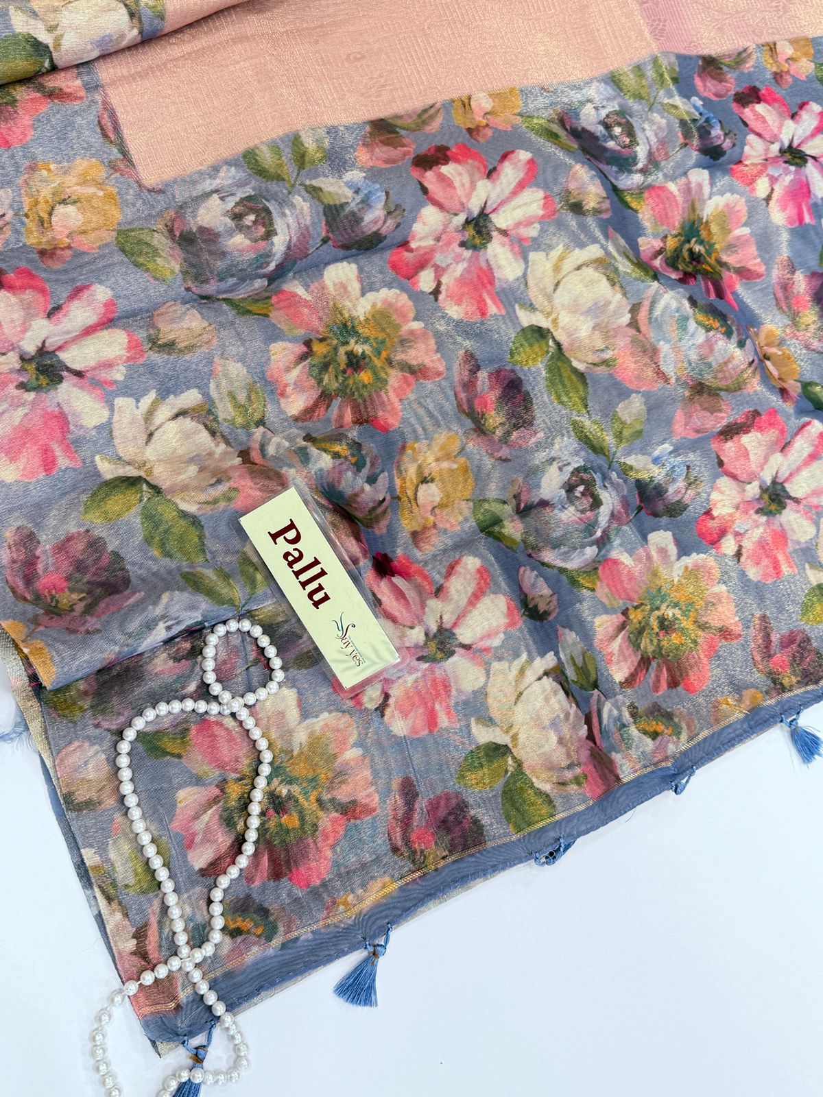 The pallu unfurls in a misty slate grey canvas, adorned with impressionist floral motifs in blush, ivory, and moss tones — an artistic interplay of color and texture that evokes serene elegance. Delicate hand-tied tassels trace the hem, lending a refined artisanal finish.