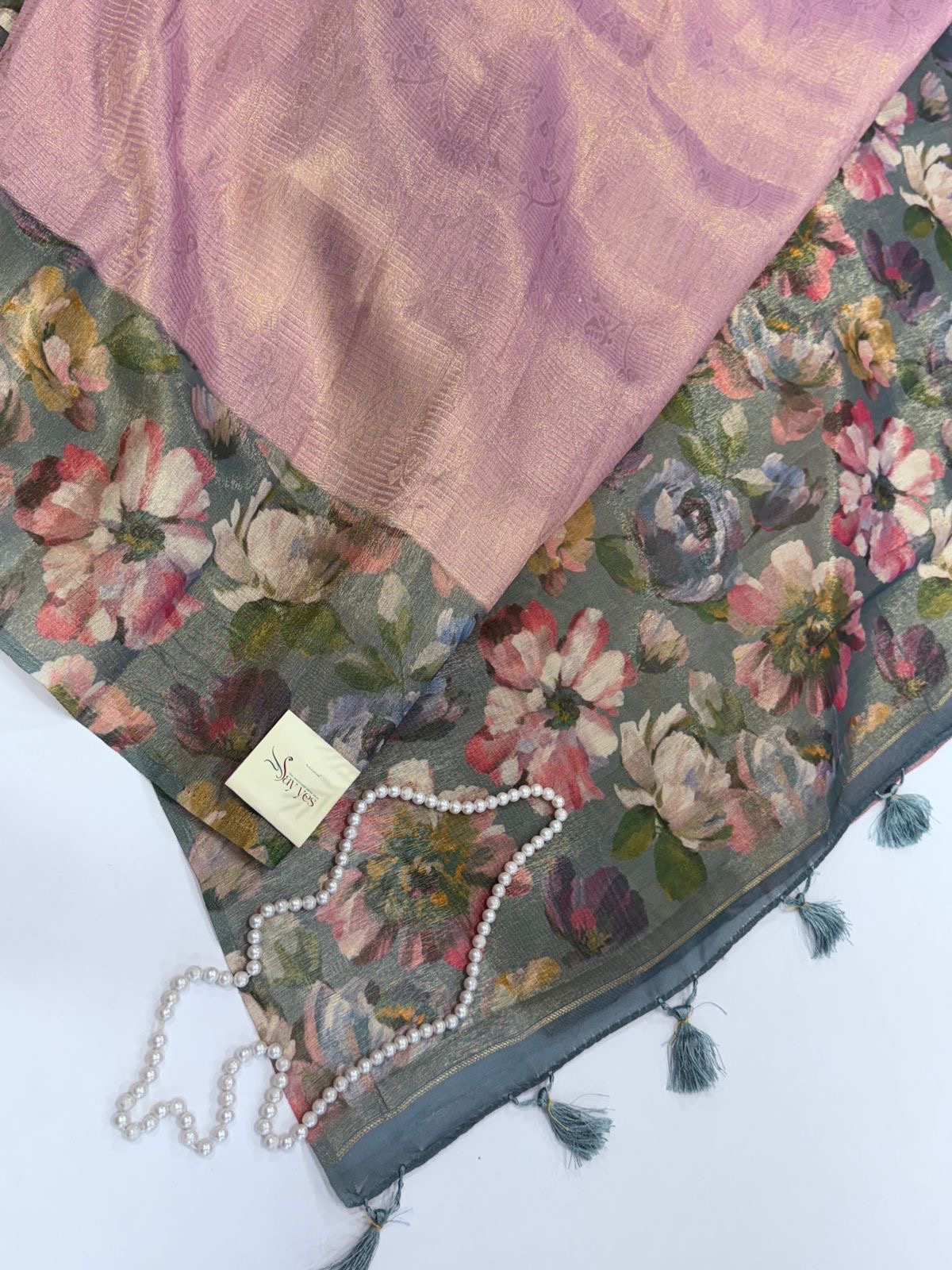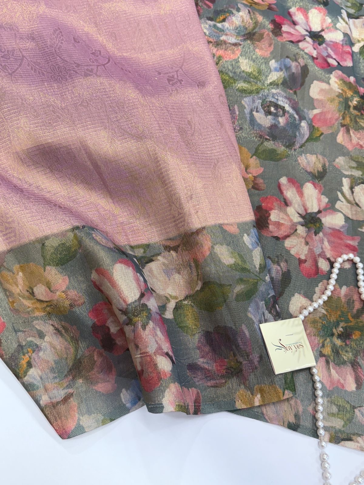 A symphony of grace and refinement, Pink Whisper captures the quiet luxury of understated beauty. Crafted in Silk by linen, this saree features a lustrous lavender body woven with subtle self-patterns that exude timeless sophistication.