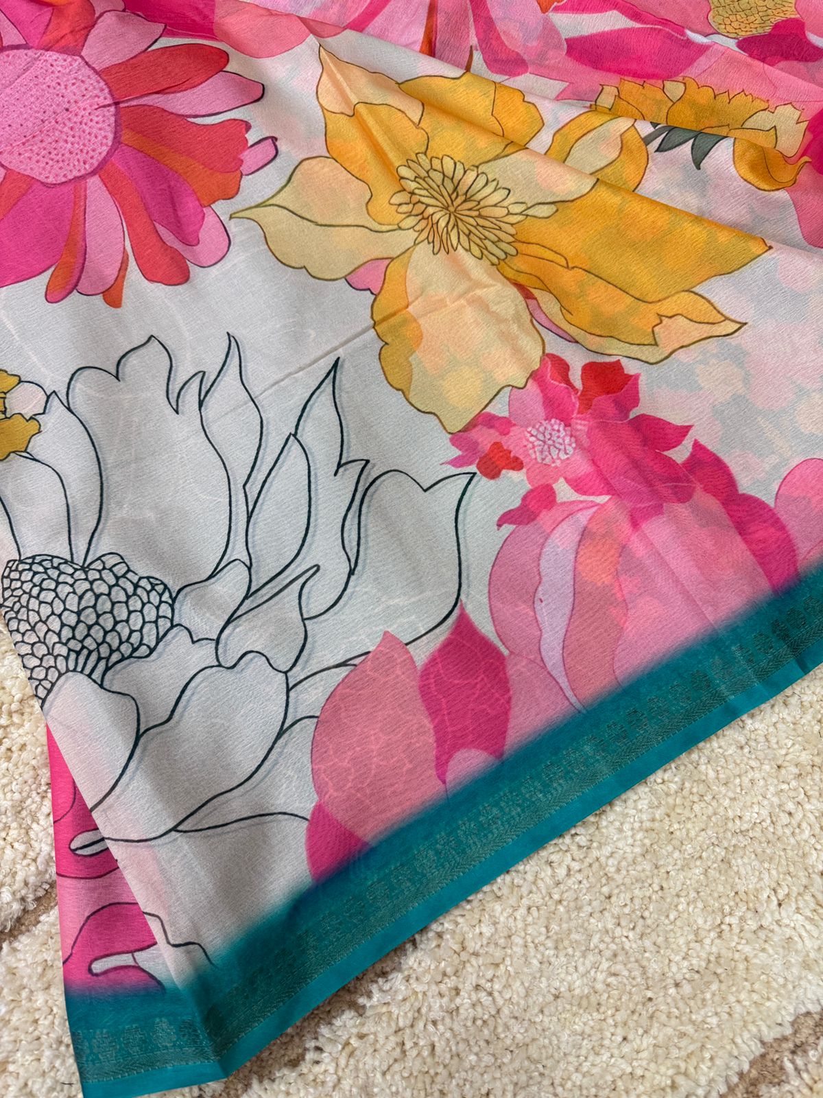 Florals on georgette (Saree) – Teal blue