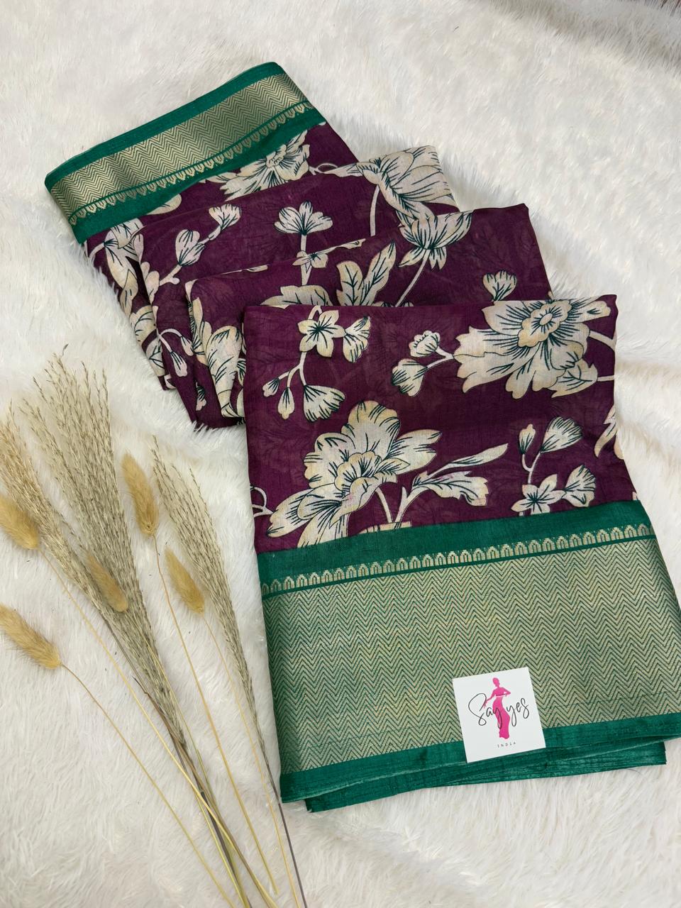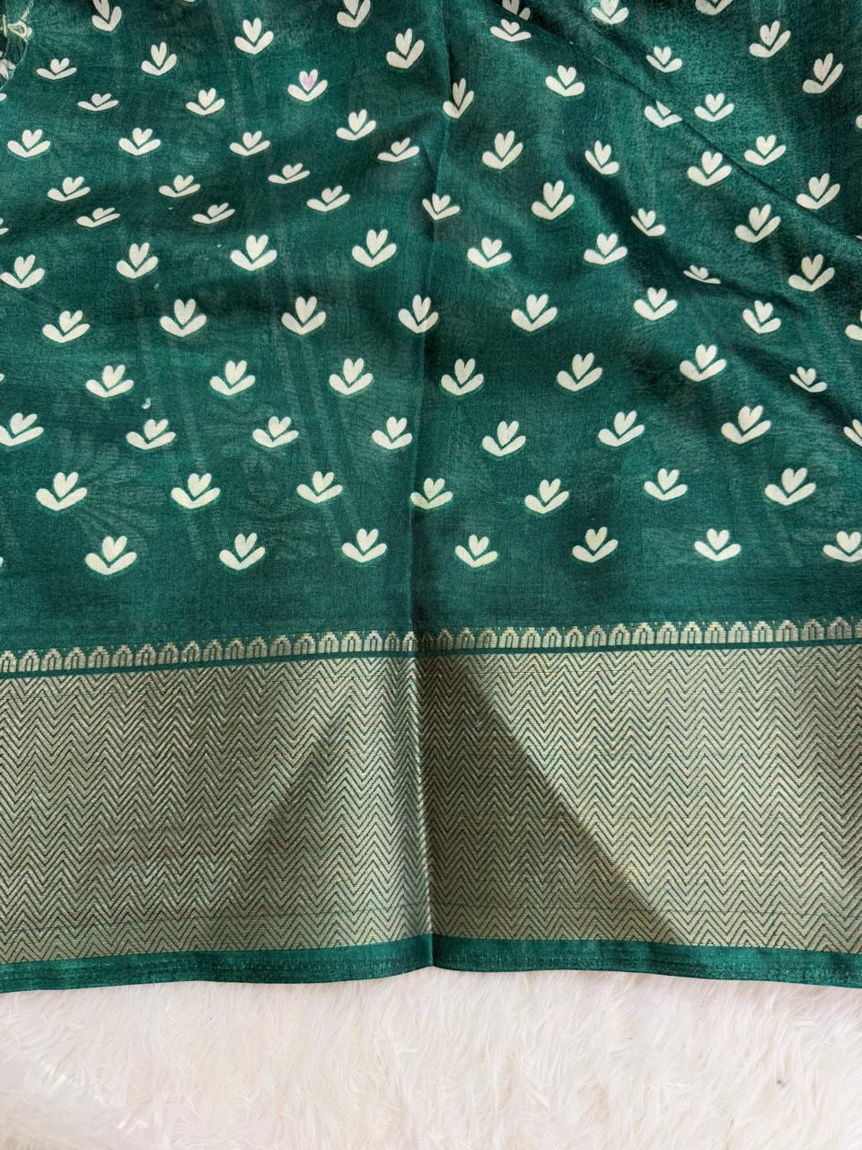Step into the world of traditional charm with this exquisite florals printed semi dola silk saree.  Enhancing the overall appeal. Crafted from semi dola silk, this saree is lightweight yet offers a luxurious sheen and a soft drape, making it perfect for festive occasions and cultural events. Pair it with ethnic jewelry to elevate your traditional look!
