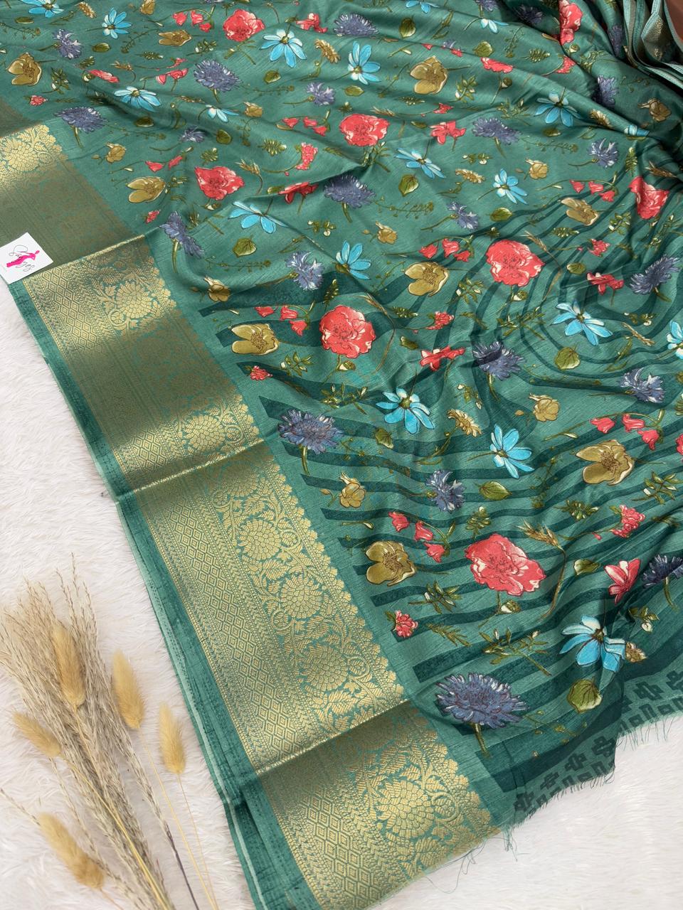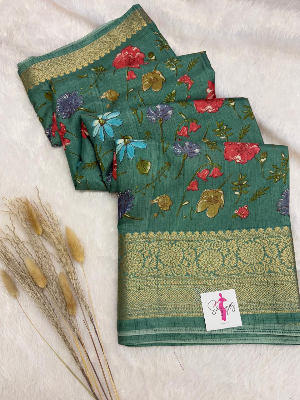 Step into the world of traditional charm with this exquisite florals printed semi dola silk saree. Enhancing the overall appeal. Crafted from semi dola silk, this saree is lightweight yet offers a luxurious sheen and a soft drape, making it perfect for festive occasions and cultural events. Pair it with ethnic jewelry to elevate your traditional look!