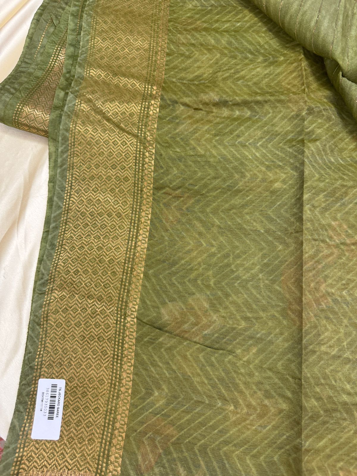 The saree features a luxurious tussar silk-cotton base with an exquisite multi-colored floral printed saree with zari woven pallu. The royal blue grey body is adorned with fine flora, offering understated elegance for any occasion.