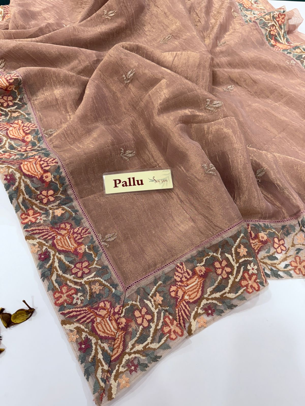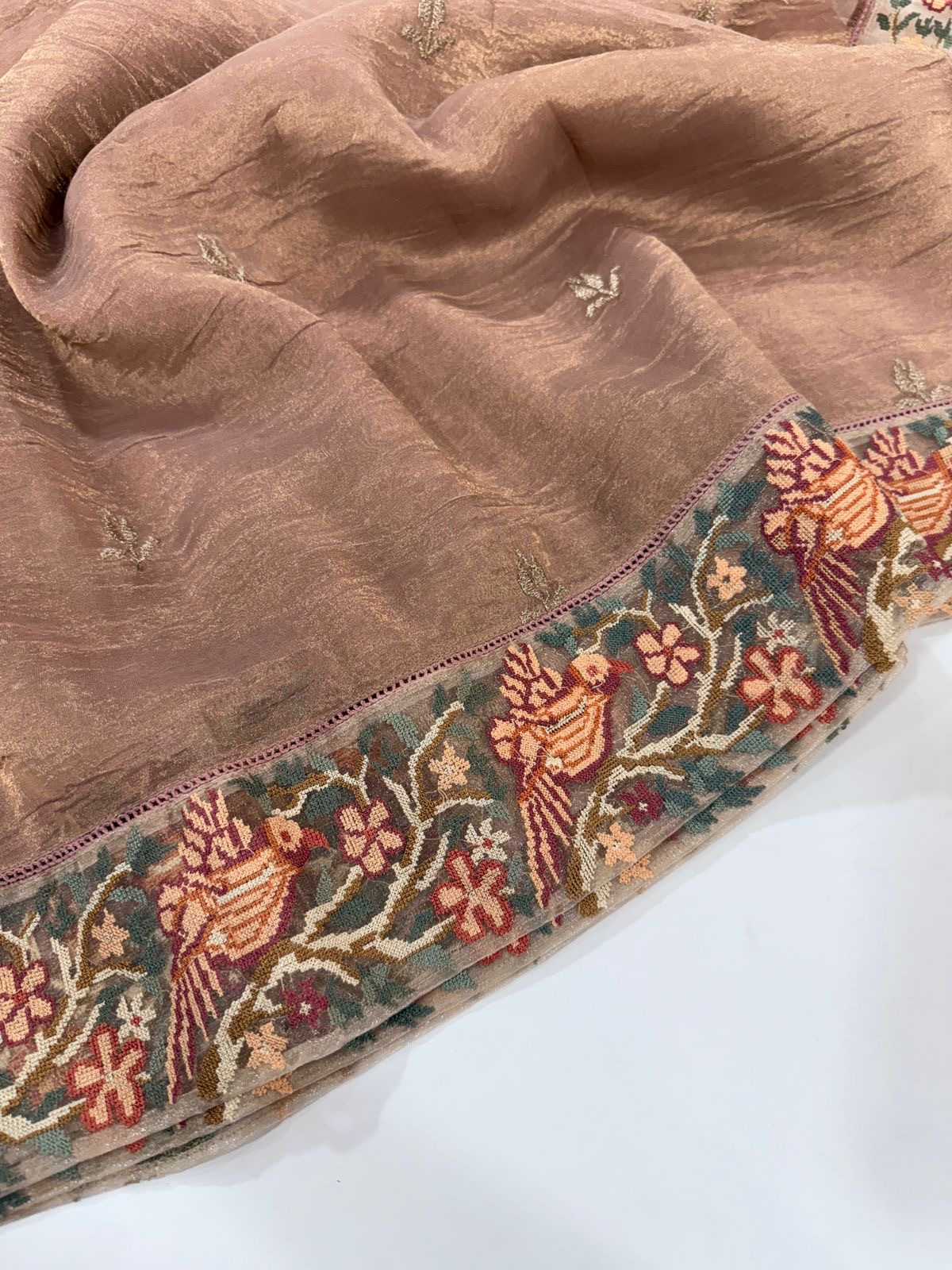 - Border & Pallu: Multicolour embroidery of birds and flowers on sheer organza base