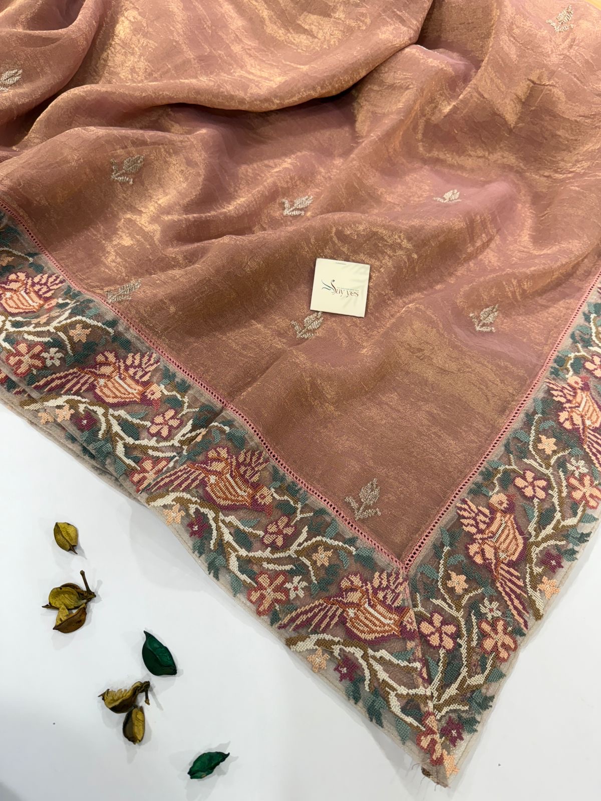 Effortlessly elegant and delightfully lightweight, this saree is crafted from pure tissue linen, lending it a natural sheen and airy drape. The muted dusty rose body is adorned with delicate silver zari buttas scattered across the length, giving it a subtle festive charm.