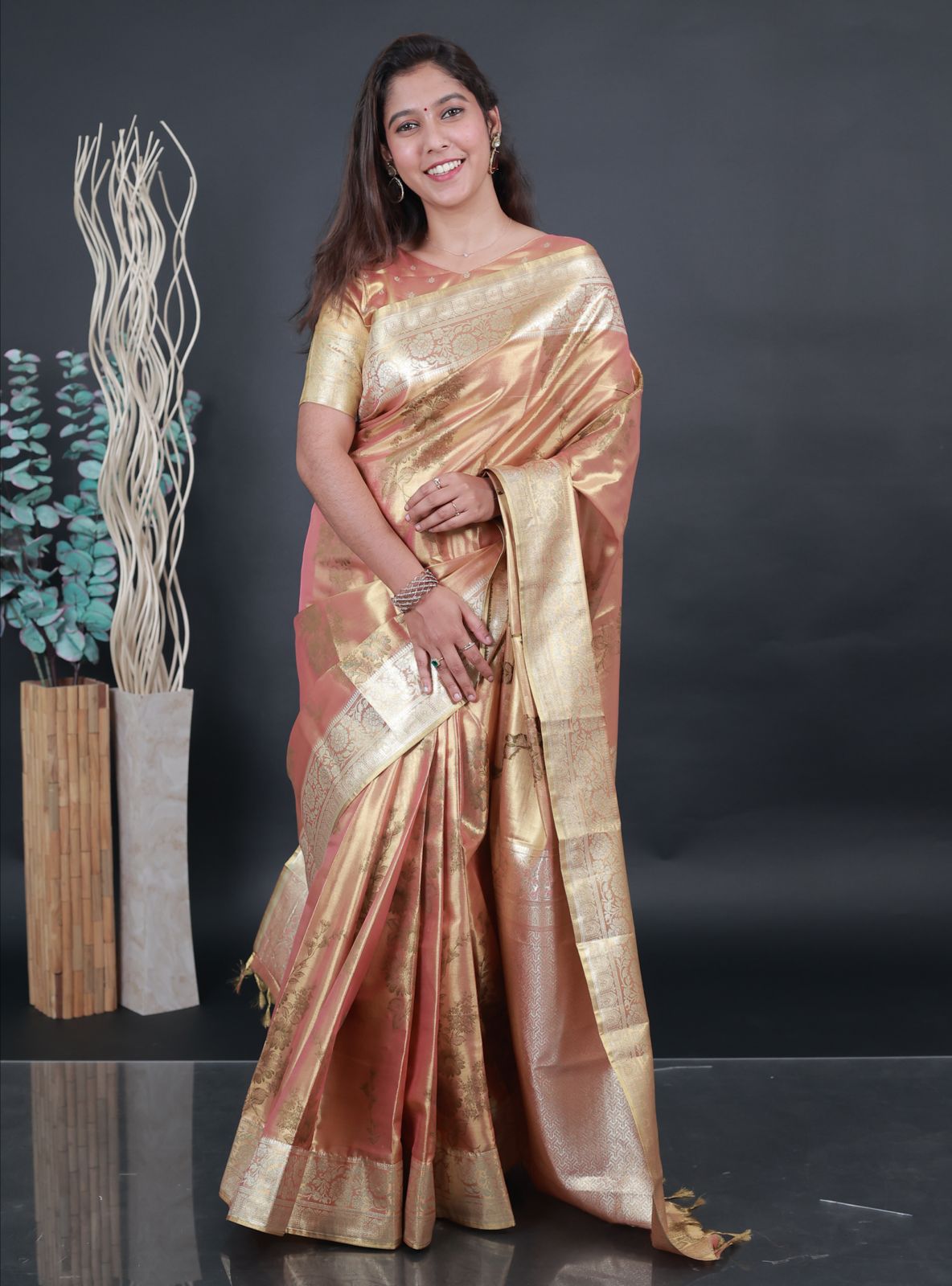 Grace meets grandeur in this opulent Kancheevaram tissue silk saree, drenched in a radiant golden hue. The body is adorned with delicate floral zari motifs, lending a regal charm to its smooth, shimmering surface. The rich tissue weave enhances its sheen, creating an almost liquid-gold effect as it drapes. The intricately woven zari border features traditional floral and temple patterns, offering a classic contrast to the soft floral motifs.