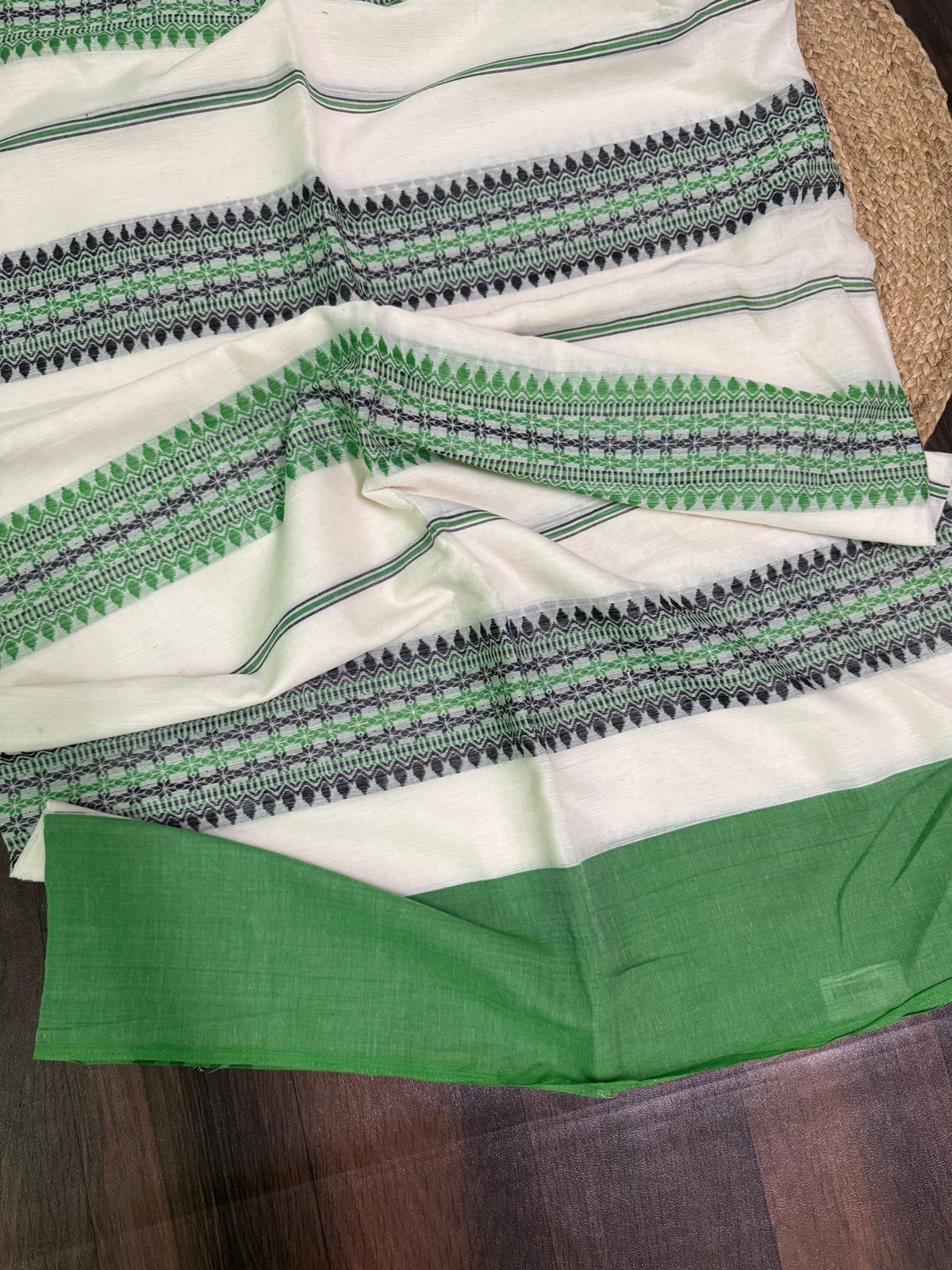 Elegant organic Mul cotton saree with a refreshing combination of white, black, and green hues. The body of the saree is predominantly white, adorned with intricate horizontal stripes featuring delicate floral and geometric patterns in black and green. The saree is accentuated by a green border, giving it a classic yet modern touch.