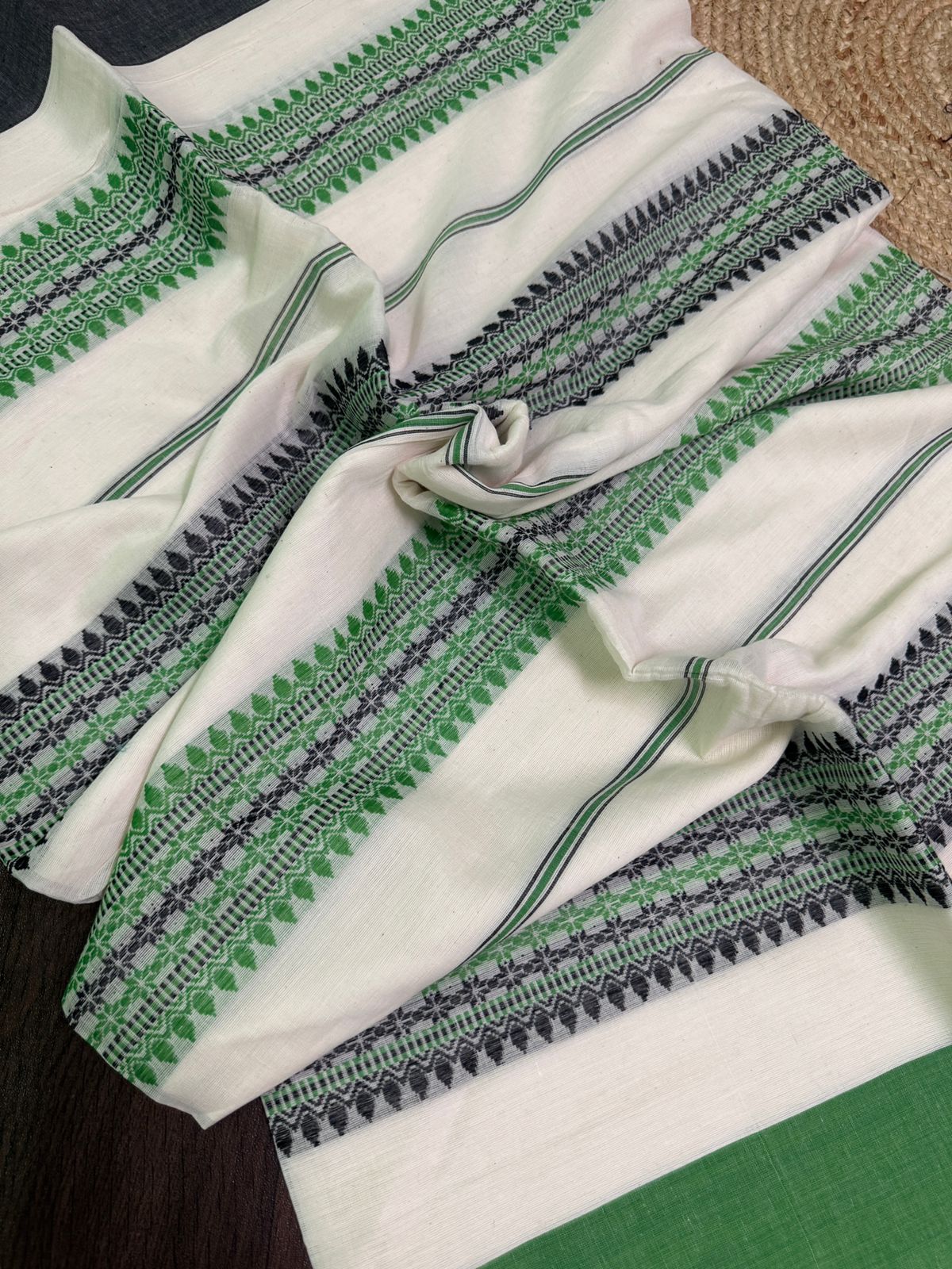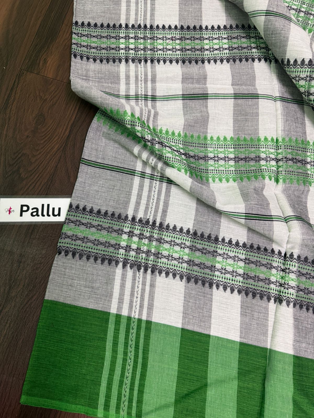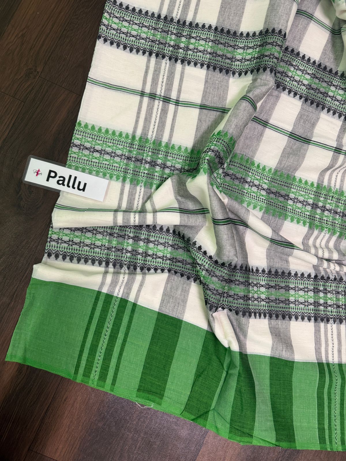 Elegant organic Mul cotton saree with a refreshing combination of white, black, and green hues. The body of the saree is predominantly grey, adorned with intricate horizontal stripes featuring delicate floral and geometric patterns in black and green. The saree is accentuated by a green border, giving it a classic yet modern touch.