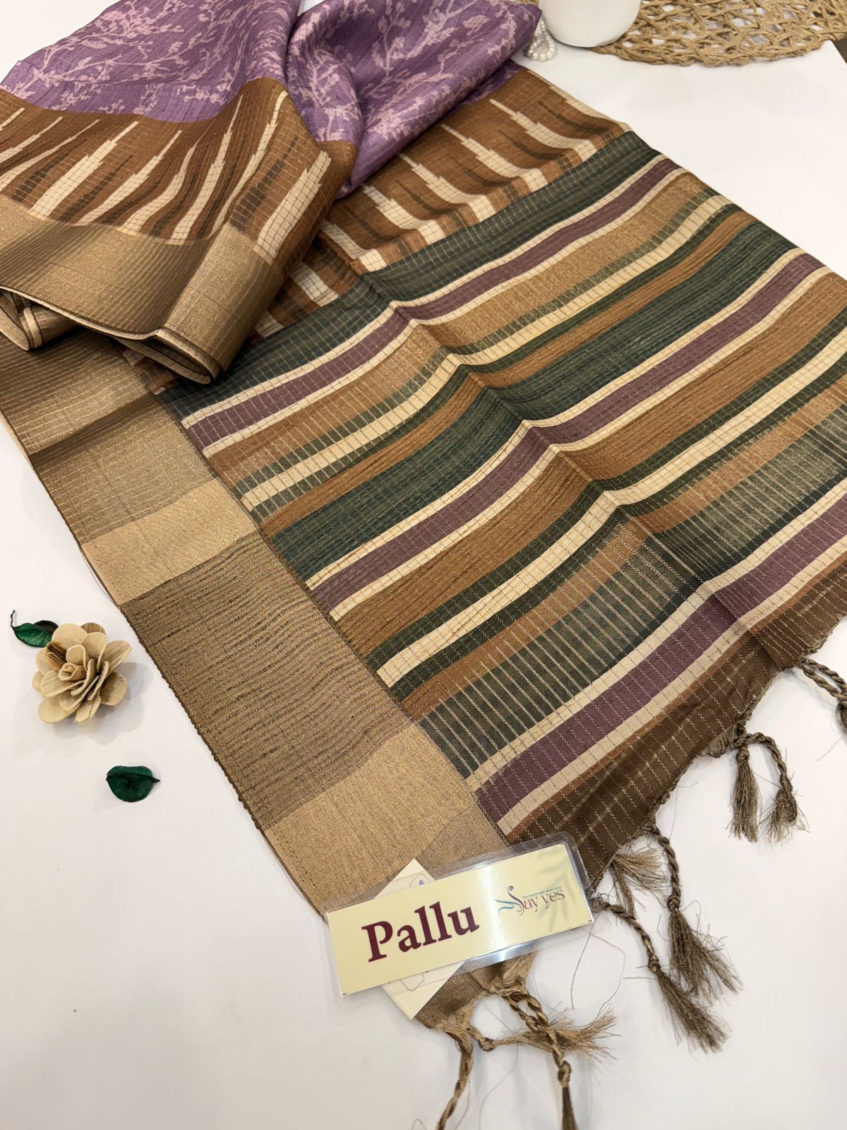Effortlessly elegant and delightfully lightweight, this saree is crafted from Kattam Tussar aill, lending it a natural sheen and airy drape. The muted mustard body is adorned with delicate zari kattams across the length, giving it a subtle festive charm.