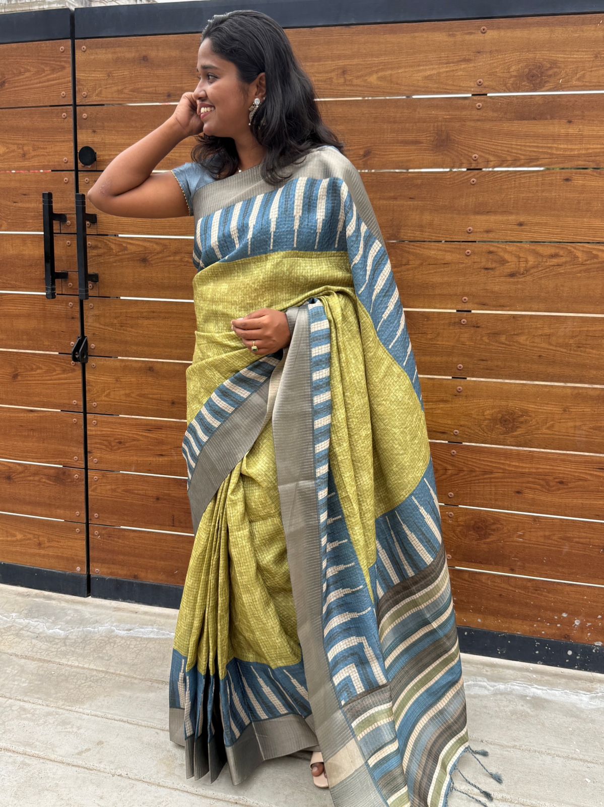 Its highlight lies in the beautifully woven Ikkat borders, adding a traditional yet sophisticated finish. The pallu continues the dreamy story making the saree perfect for daytime casual outings, gatherings, or soulful celebrations.