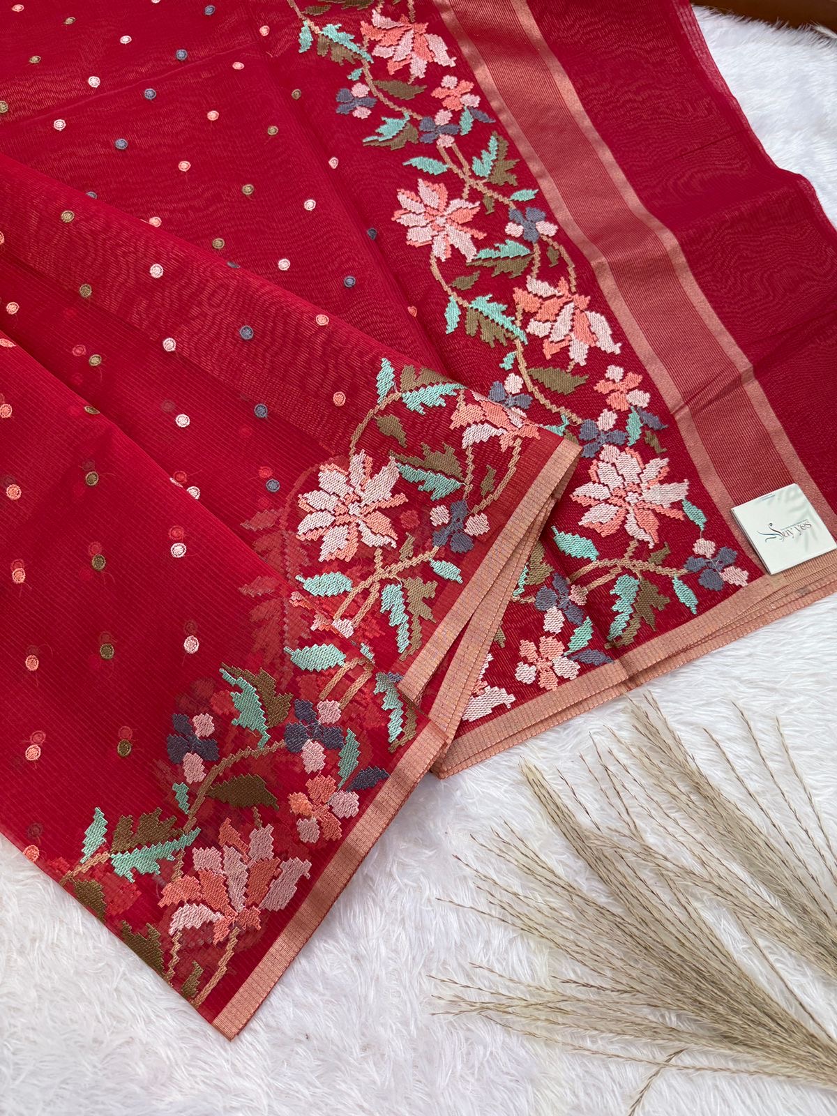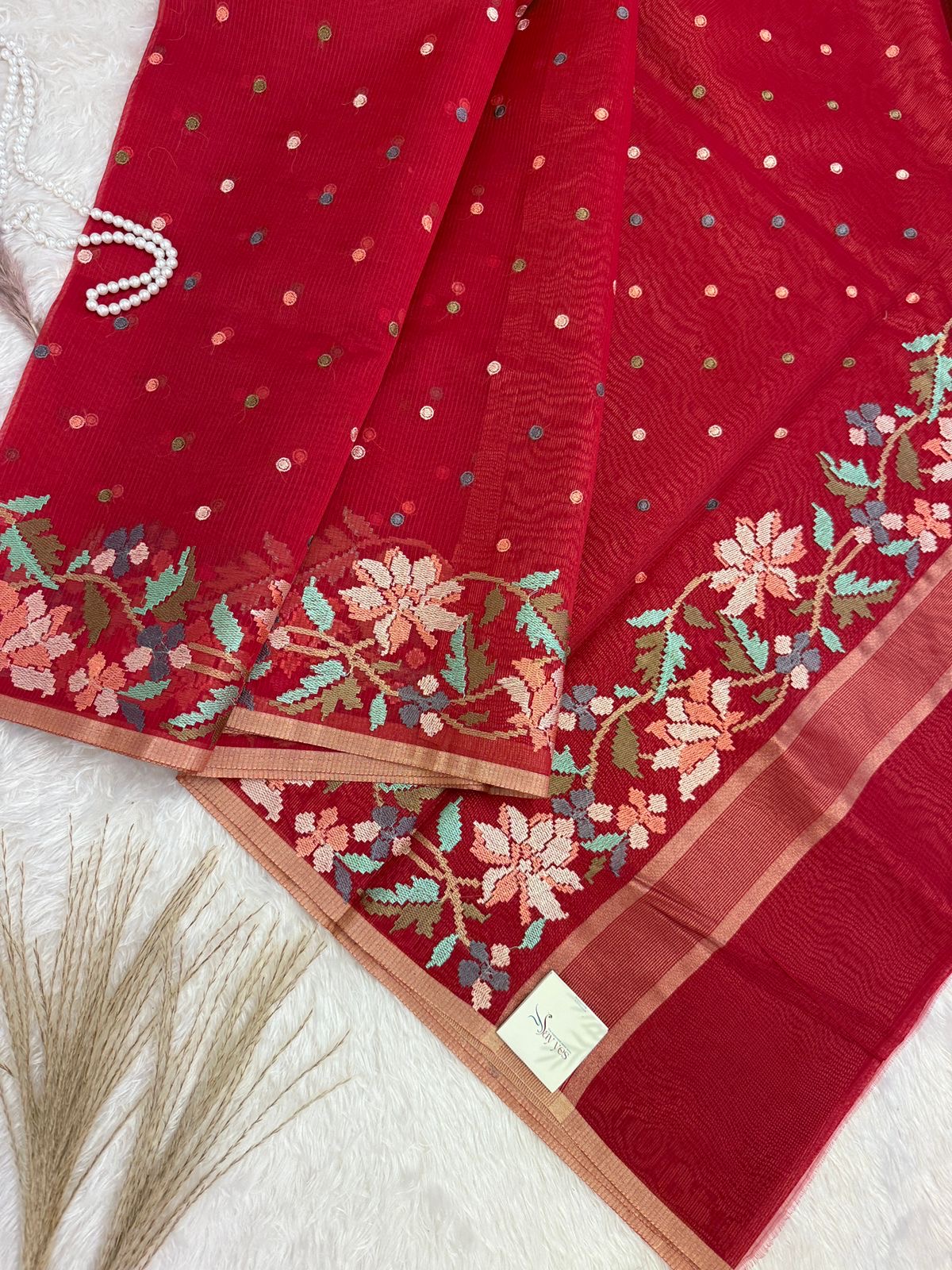 Grace and festivity meet in Phoolkanwal, a saree that exudes timeless charm with a modern twist. Draped in a rich cherry red hue, this saree is adorned with dainty woven polka dots across the body, adding a playful yet elegant texture. The real highlight lies in the floral border — delicately woven in shades of peach, lavender, sage green, and dusty pink — creating a garden-like bloom that cascades gracefully along the edge.