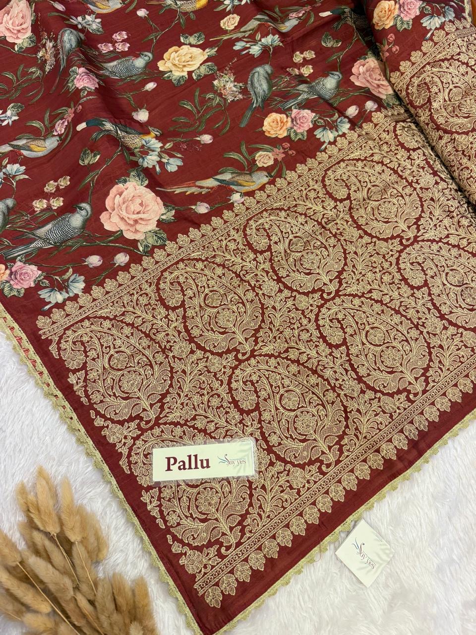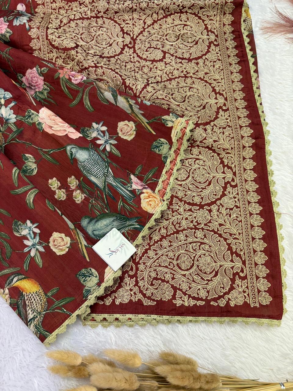 Unfold timeless sophistication with Gulmor Gatha, a saree that beautifully blends royal opulence with vintage garden aesthetics. Crafted on a deep maroon base, the saree features a tapestry of blooming roses and perched songbirds, reminiscent of an old-world botanical painting. The contrasting pallu showcases grand golden zari paisley motifs in intricate brocade work — a tribute to Mughal-inspired heritage design.