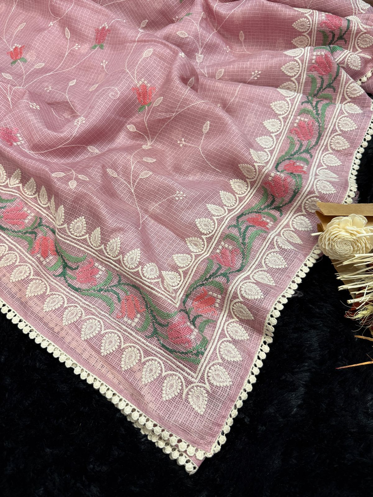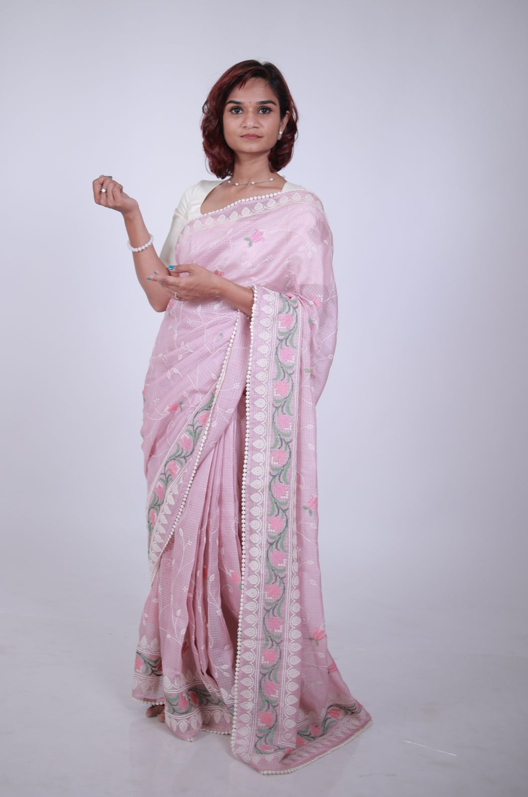 Light as a whisper and woven with charm, Hamsadhwani is a pastel pink Kota Doria saree that celebrates grace in every thread. The soft checkered weave is adorned with dainty white floral vines, adding an ethereal, hand-drawn touch across the body. The intricately embroidered border, featuring blooming pink florals and ivory leaf motifs, adds richness without overwhelming the design. Finished with a subtle crochet lace edge, this saree is perfect for serene mornings, garden get-togethers, or a graceful festive look.