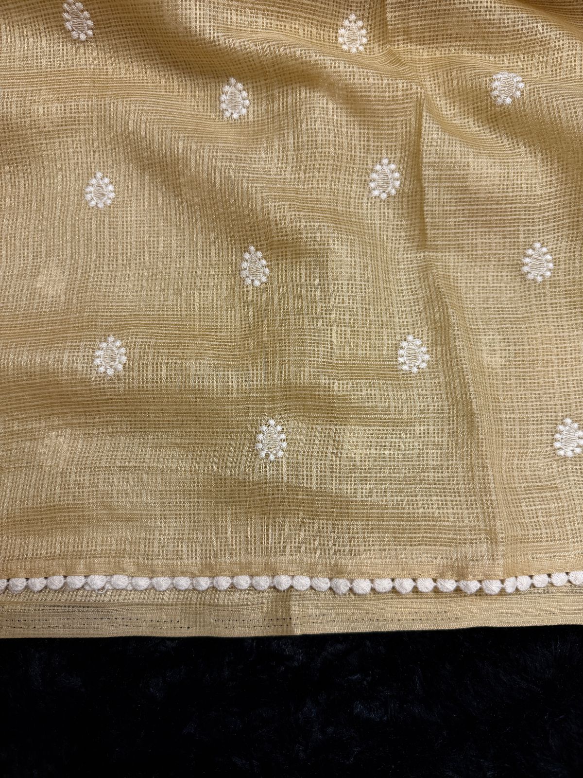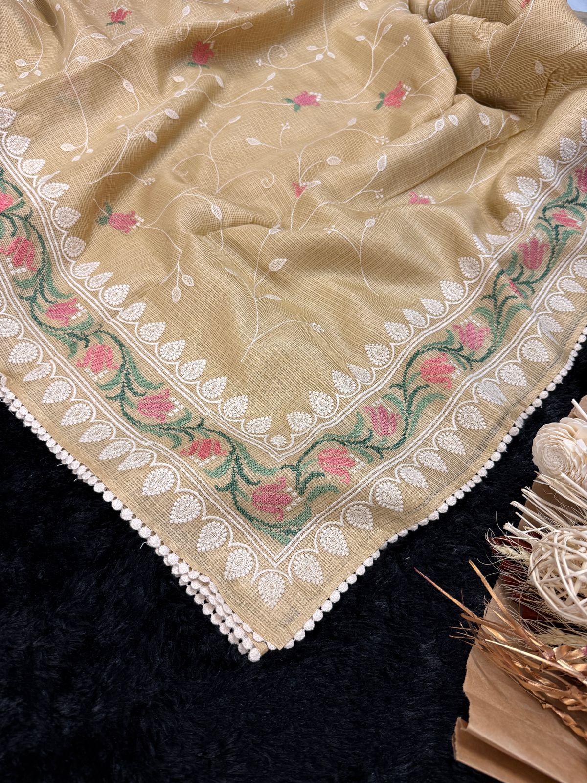 Light as a whisper and woven with charm, Hamsadhwani is a pastel pink Kota Doria saree that celebrates grace in every thread. The soft checkered weave is adorned with dainty white floral vines, adding an ethereal, hand-drawn touch across the body. The intricately embroidered border, featuring blooming pink florals and ivory leaf motifs, adds richness without overwhelming the design. Finished with a subtle crochet lace edge, this saree is perfect for serene mornings, garden get-togethers, or a graceful festive look.