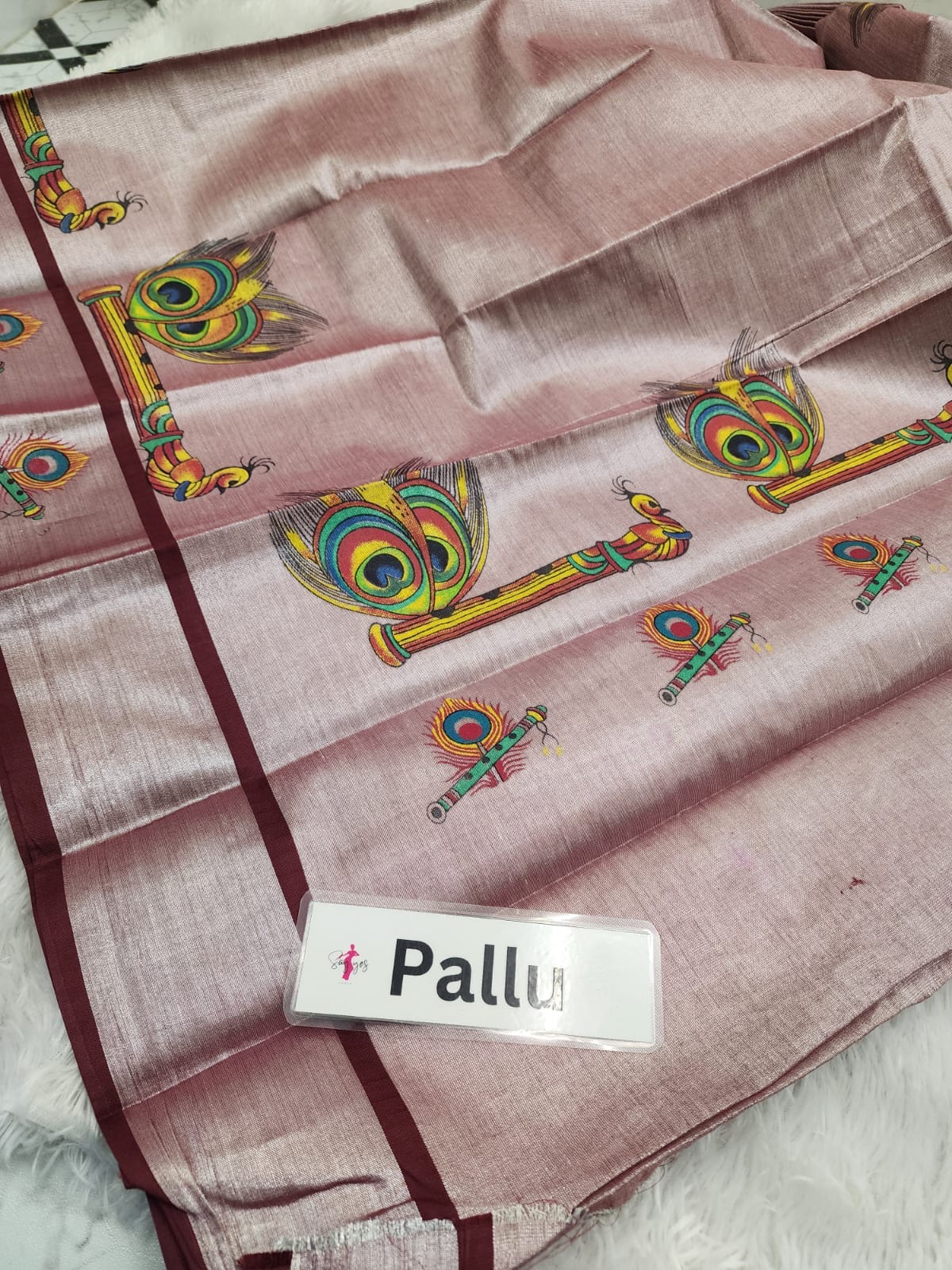 Our Soft Tissue silk sarees usher a minimalistic look with modern jari infused with saree thread . This edition, is so unique, as it has Silver jari woven on the body of the saree, and the pallu with hand-painted peacock silhouettes all over!