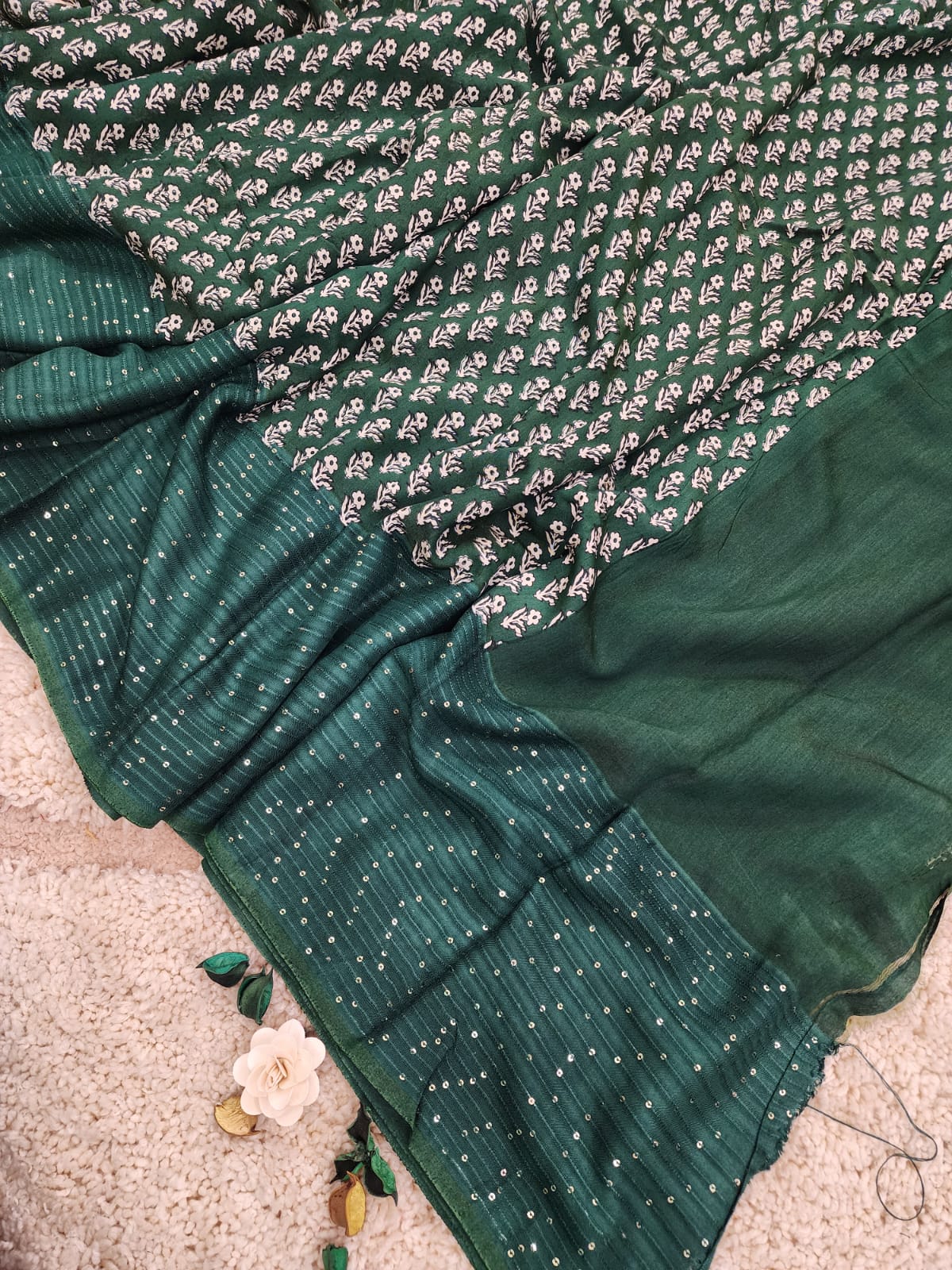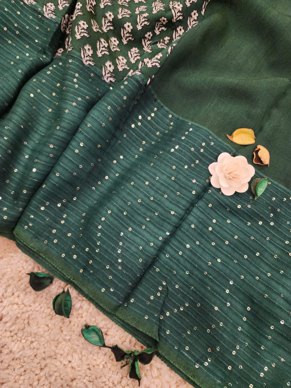Discover elegance with the Emerald Bloom Mulberry Silk Saree, a harmonious blend of sophistication and charm. The deep emerald green body is adorned with delicate sequin embellishments, offering a subtle shimmer that enhances its luxurious appeal.