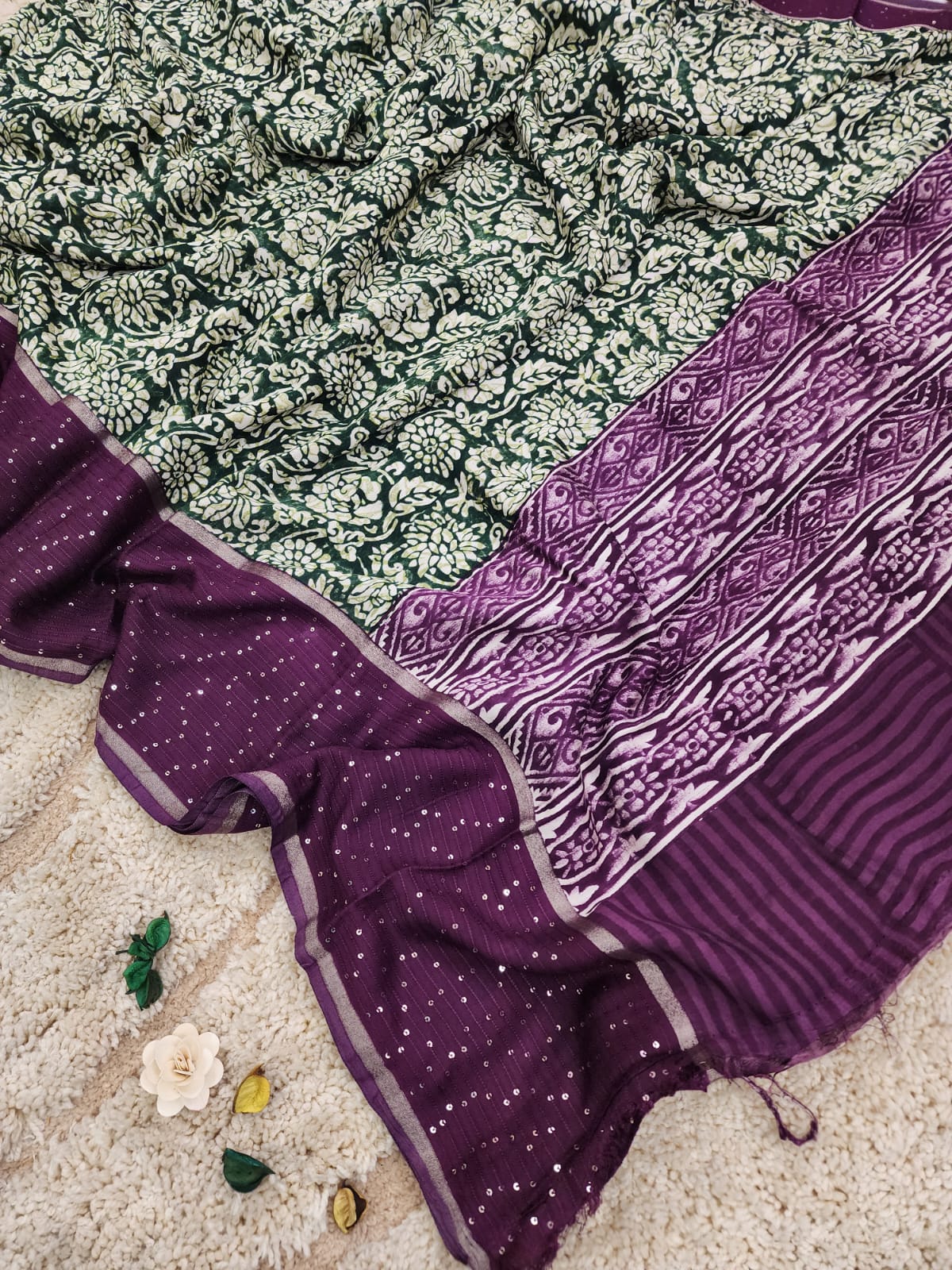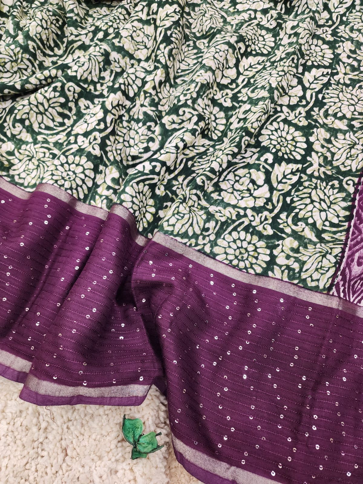 Discover elegance with the Mulberry Silk Saree, a harmonious blend of sophistication and charm. The deep emerald green body is adorned with delicate sequin embellishments, offering a subtle shimmer that enhances its luxurious appeal.