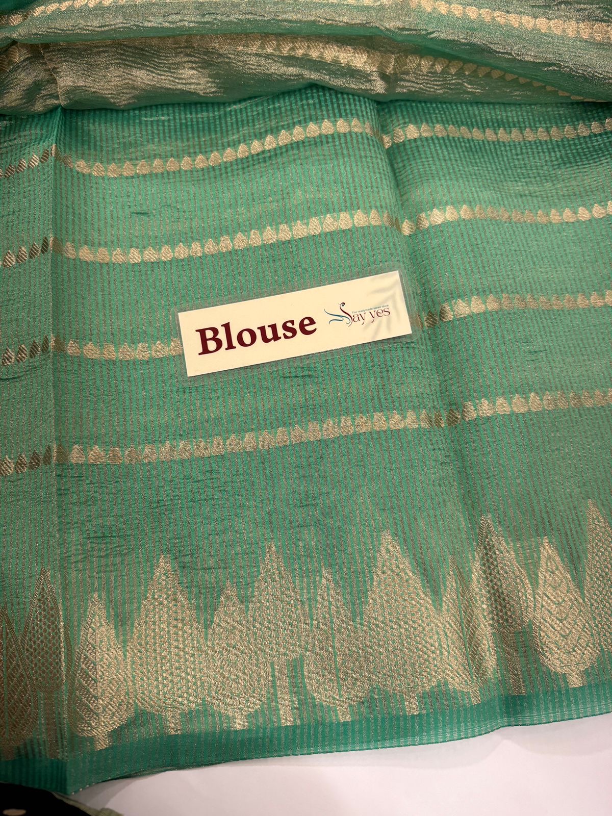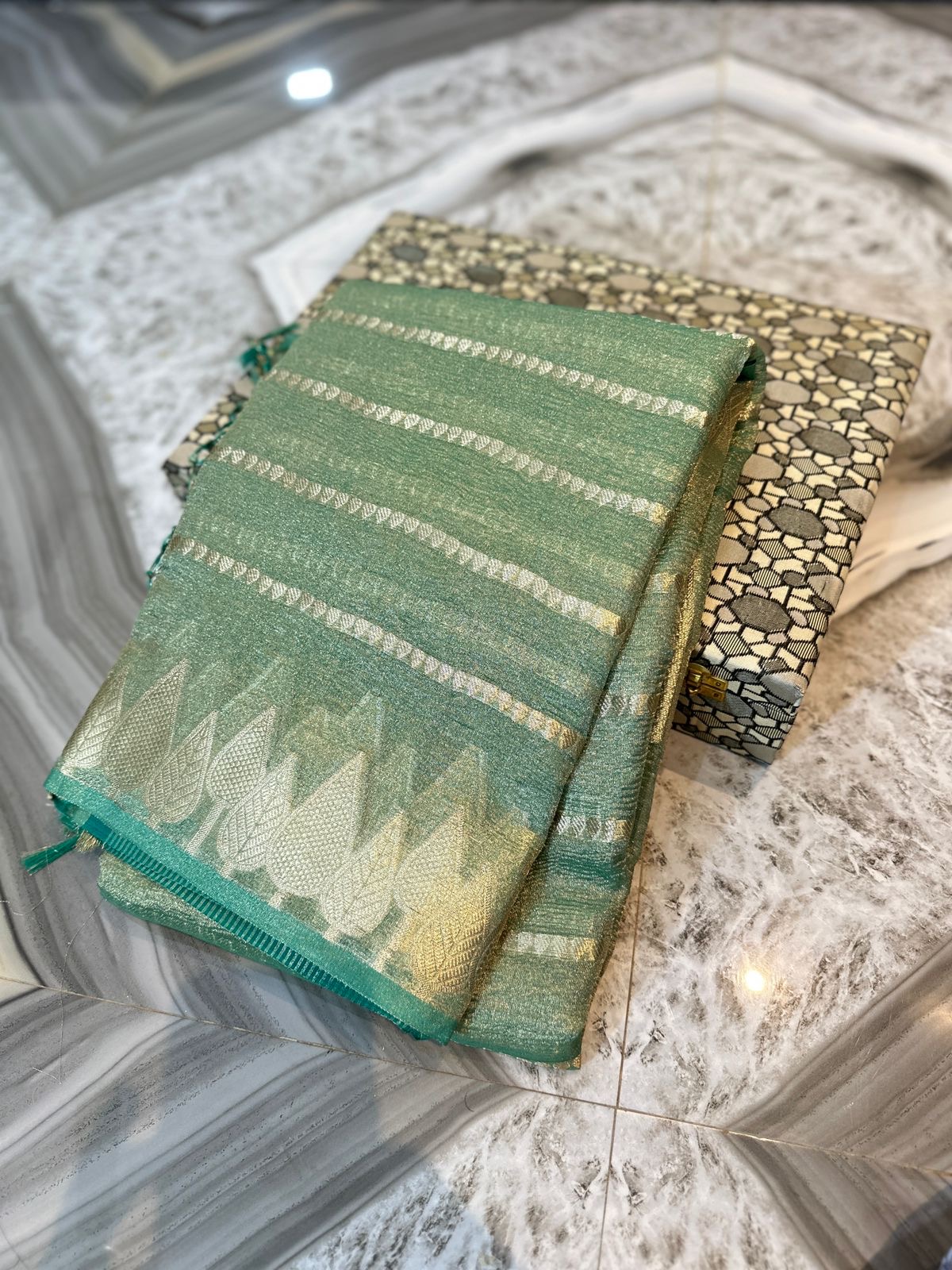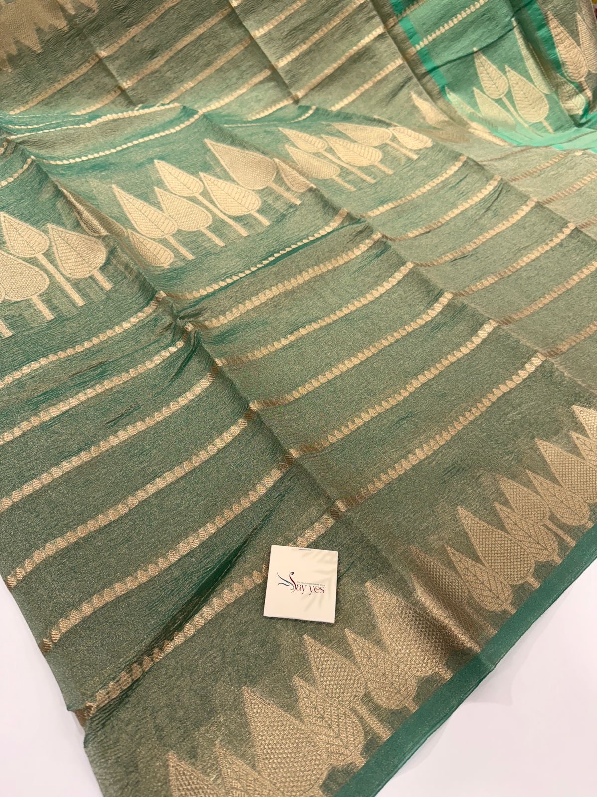 A graceful Persian green tissue silk saree adorned with a luxurious zari woven leaves on the border . The textured body offers a rich and minimal base, allowing the intricate threadwork to stand out. Lightweight and flowy, this saree drapes effortlessly, making it ideal for festive occasions, receptions, and elegant gatherings.