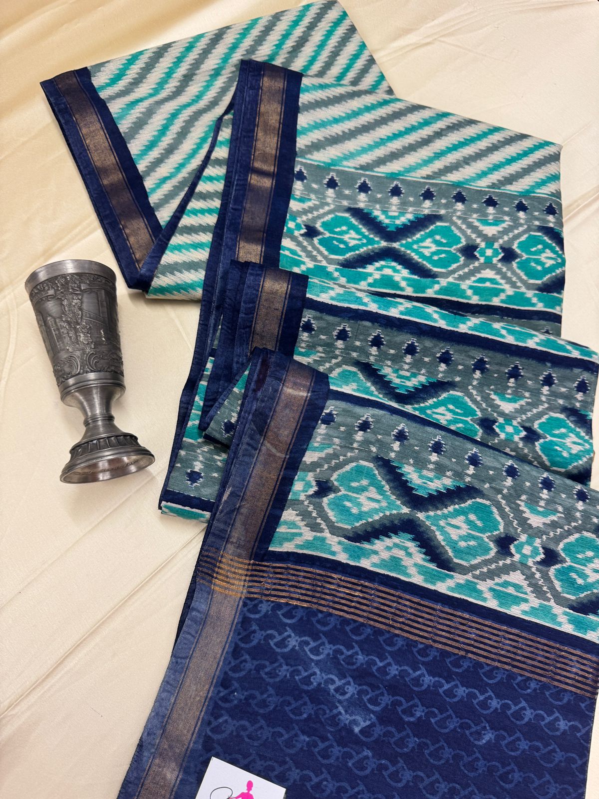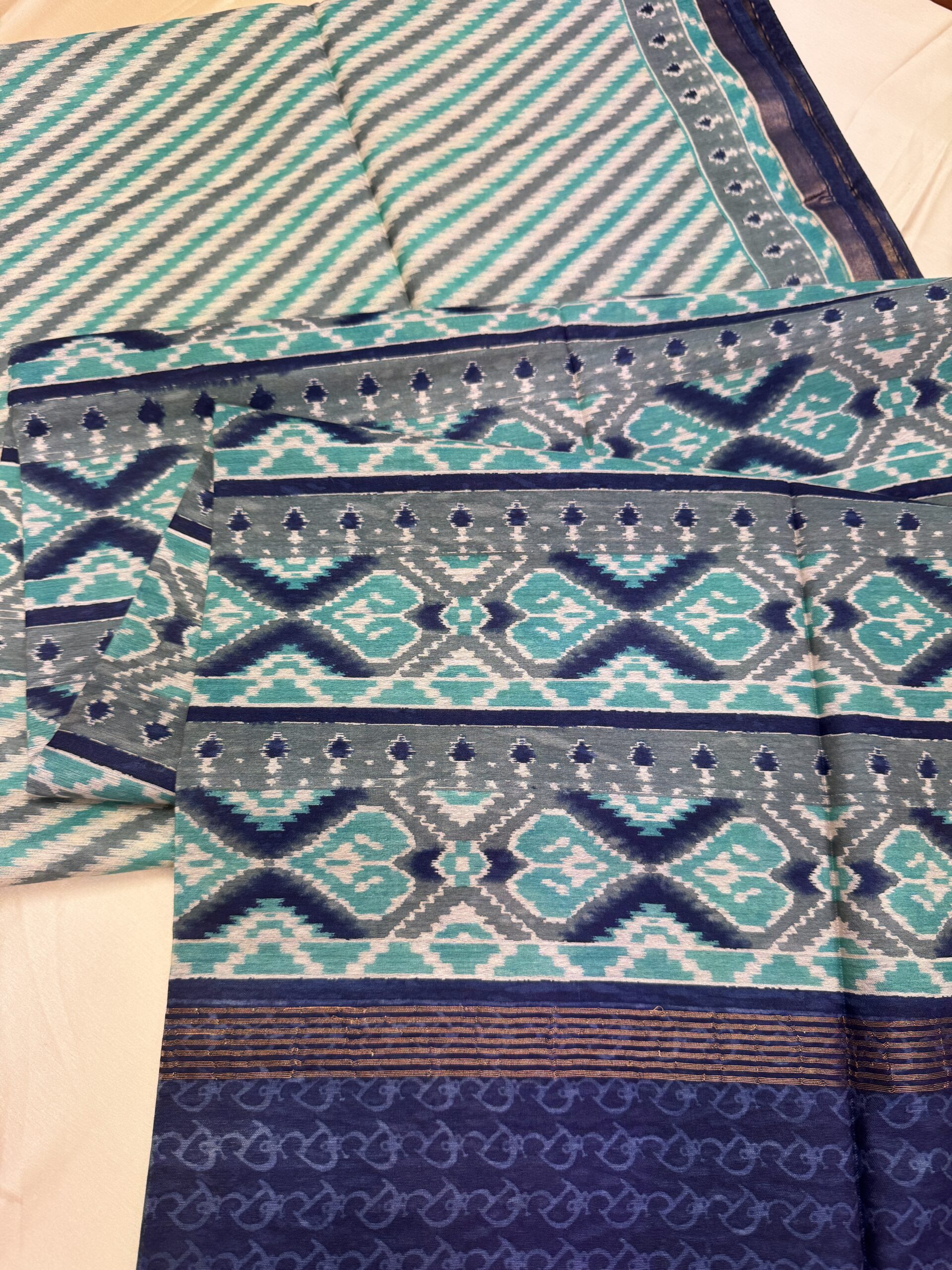 This elegant saree, woven from Tussar cotton silk, combines a lightweight feel with a luxurious sheen. Adorned with intricate ikkat prints, it features a harmonious blend of grey and blue hues, enhanced by traditional floral and geometric motifs. The saree is finished with a classic zari-inspired border and tasseled pallu, making it perfect for festive occasions or cultural events.