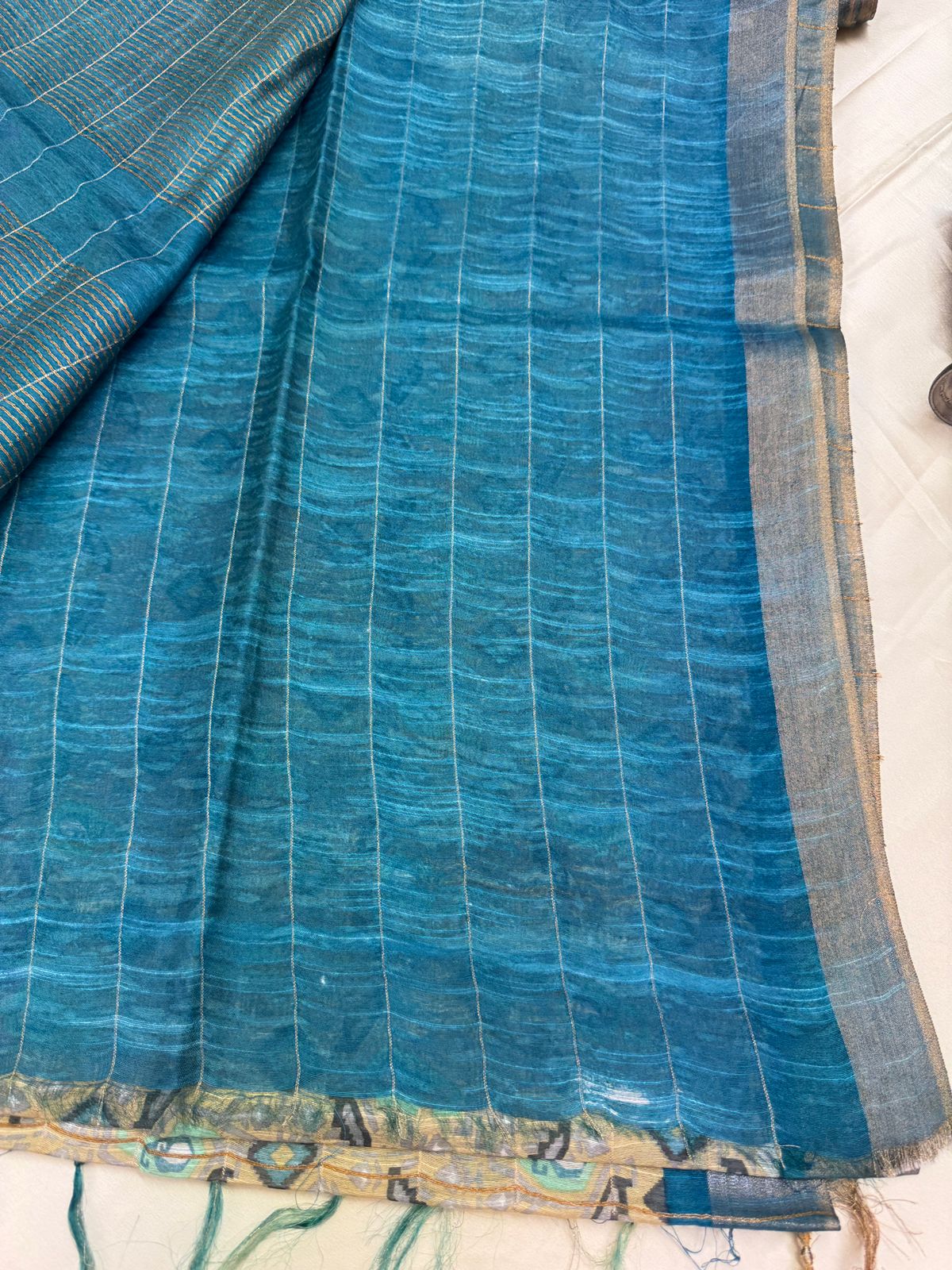 - Work: Handwoven with Ikat-Inspired Design and Gold Stripes