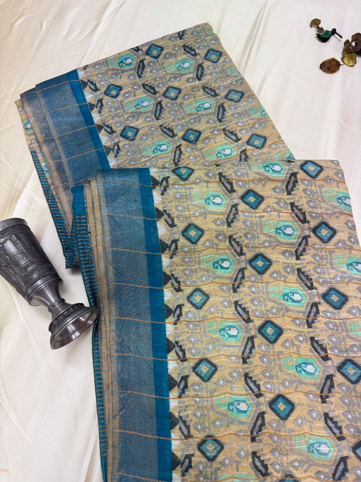 Ikkat printed Tussar cotton silk – Teal blue