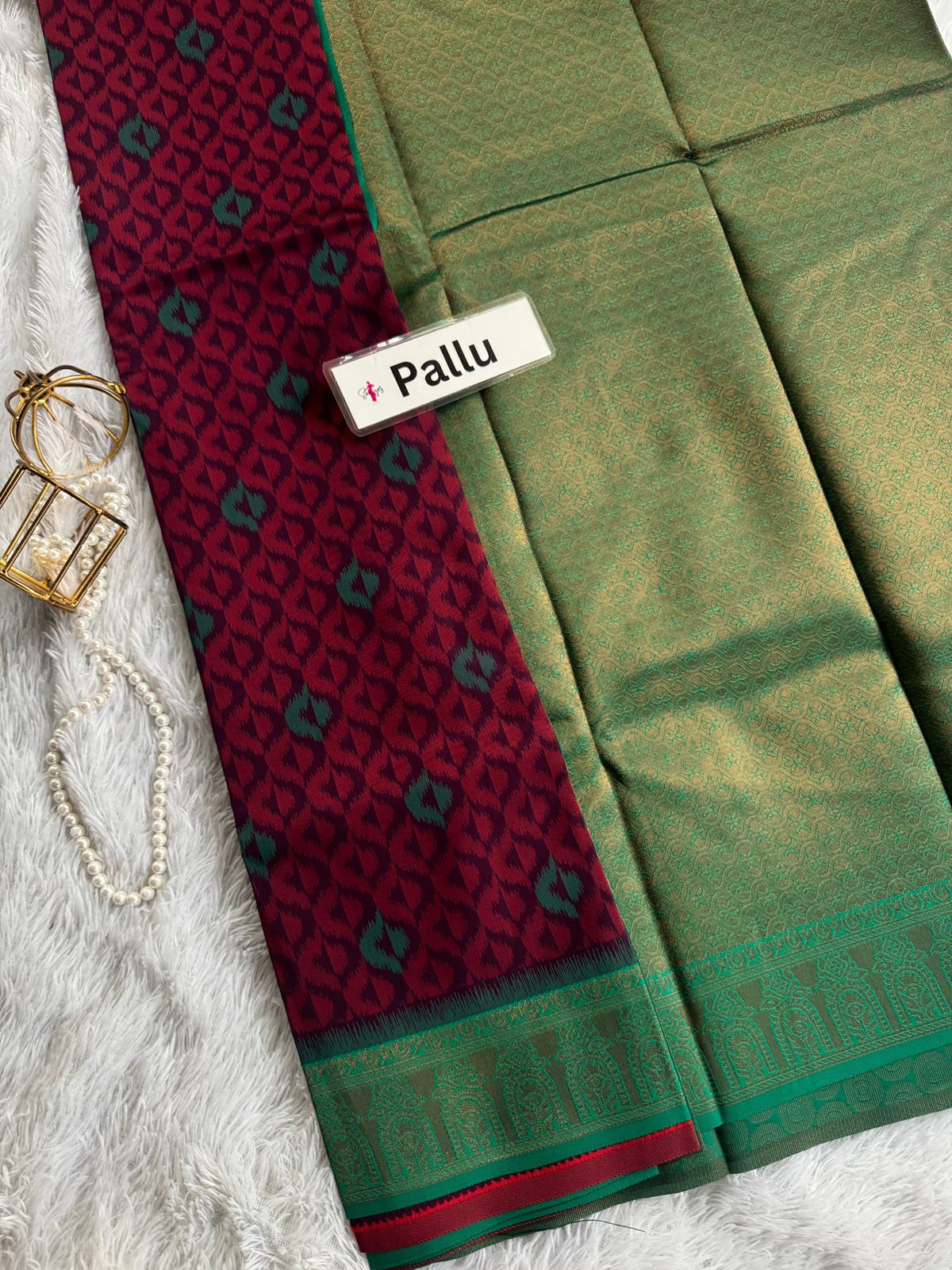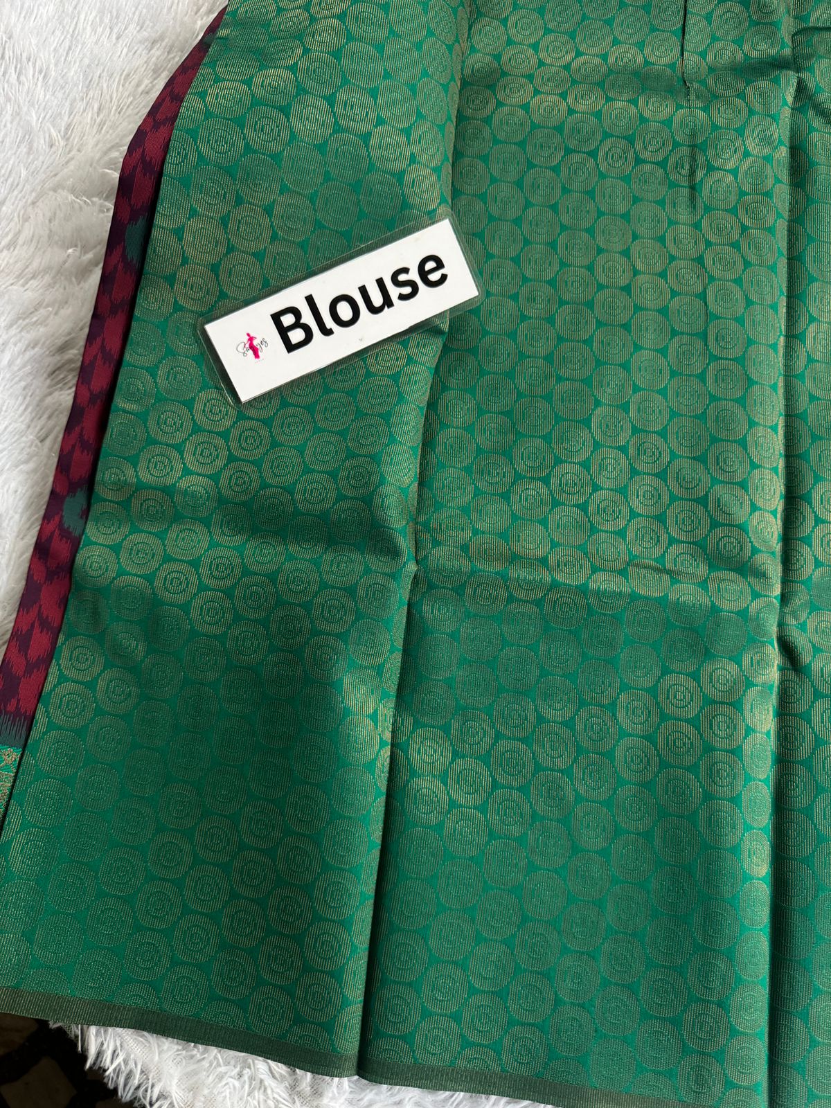 Embrace elegance with this exquisite Ikkat woven semi silk saree. The delicate pink and grey pattern, intricately woven in traditional Ikkat design, lends a sophisticated touch, making it perfect for festive occasions or traditional gatherings. The contrasting wine border is adorned with intricate temple motifs, enhancing the saree’s regal appeal. Crafted from semi silk, this saree offers a lightweight feel while providing a luxurious sheen. Pair it with statement jewelry to complete your ethnic look. Ideal for those who appreciate a blend of tradition and modernity!