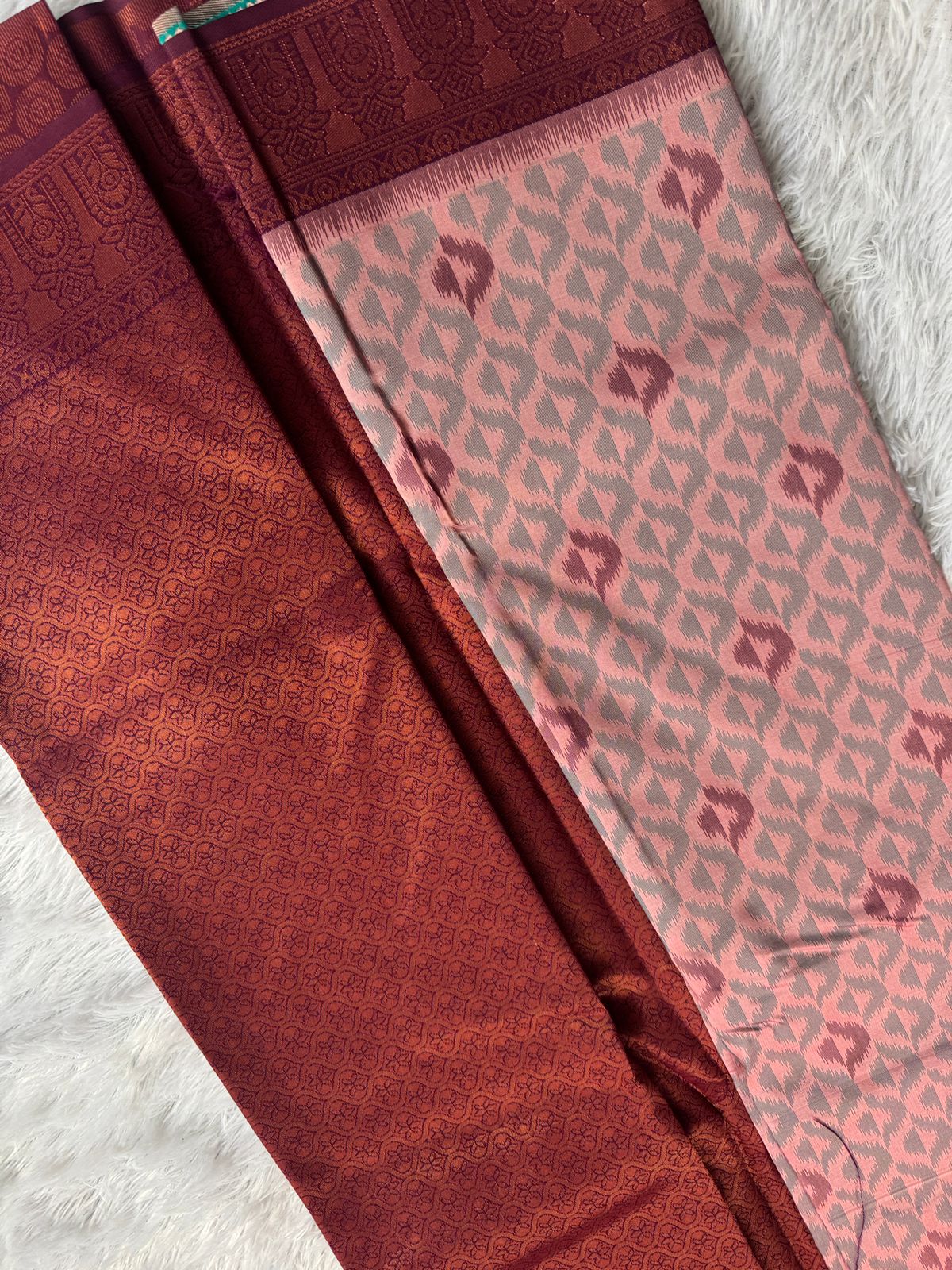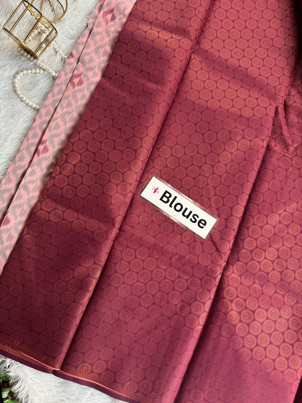 Embrace elegance with this exquisite Ikkat woven semi silk saree. The delicate pink and grey pattern, intricately woven in traditional Ikkat design, lends a sophisticated touch, making it perfect for festive occasions or traditional gatherings. The contrasting wine border is adorned with intricate temple motifs, enhancing the saree’s regal appeal. Crafted from semi silk, this saree offers a lightweight feel while providing a luxurious sheen. Pair it with statement jewelry to complete your ethnic look. Ideal for those who appreciate a blend of tradition and modernity!