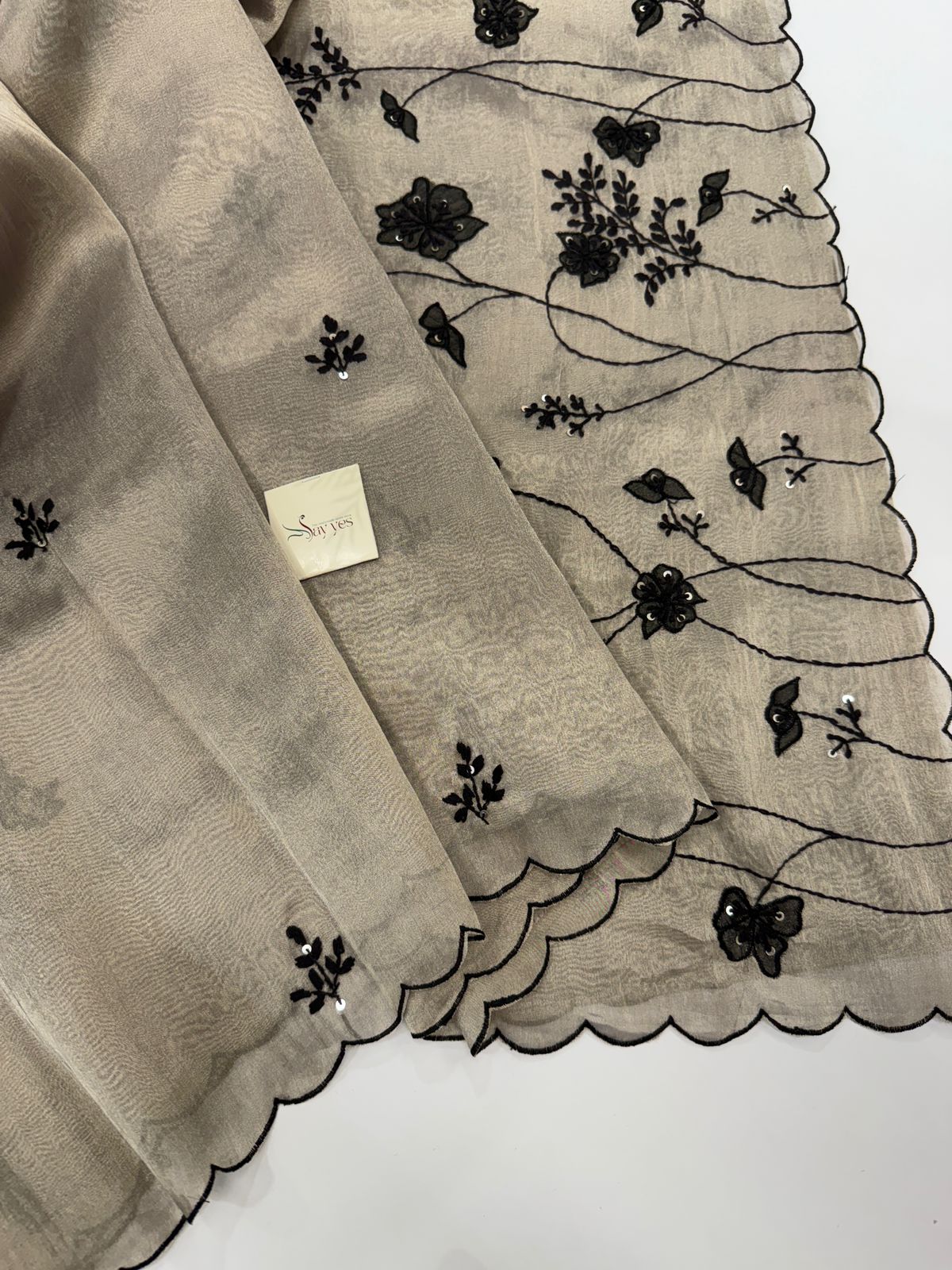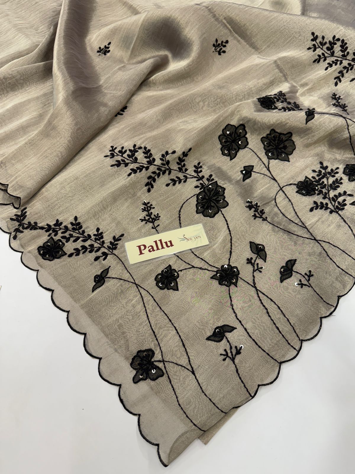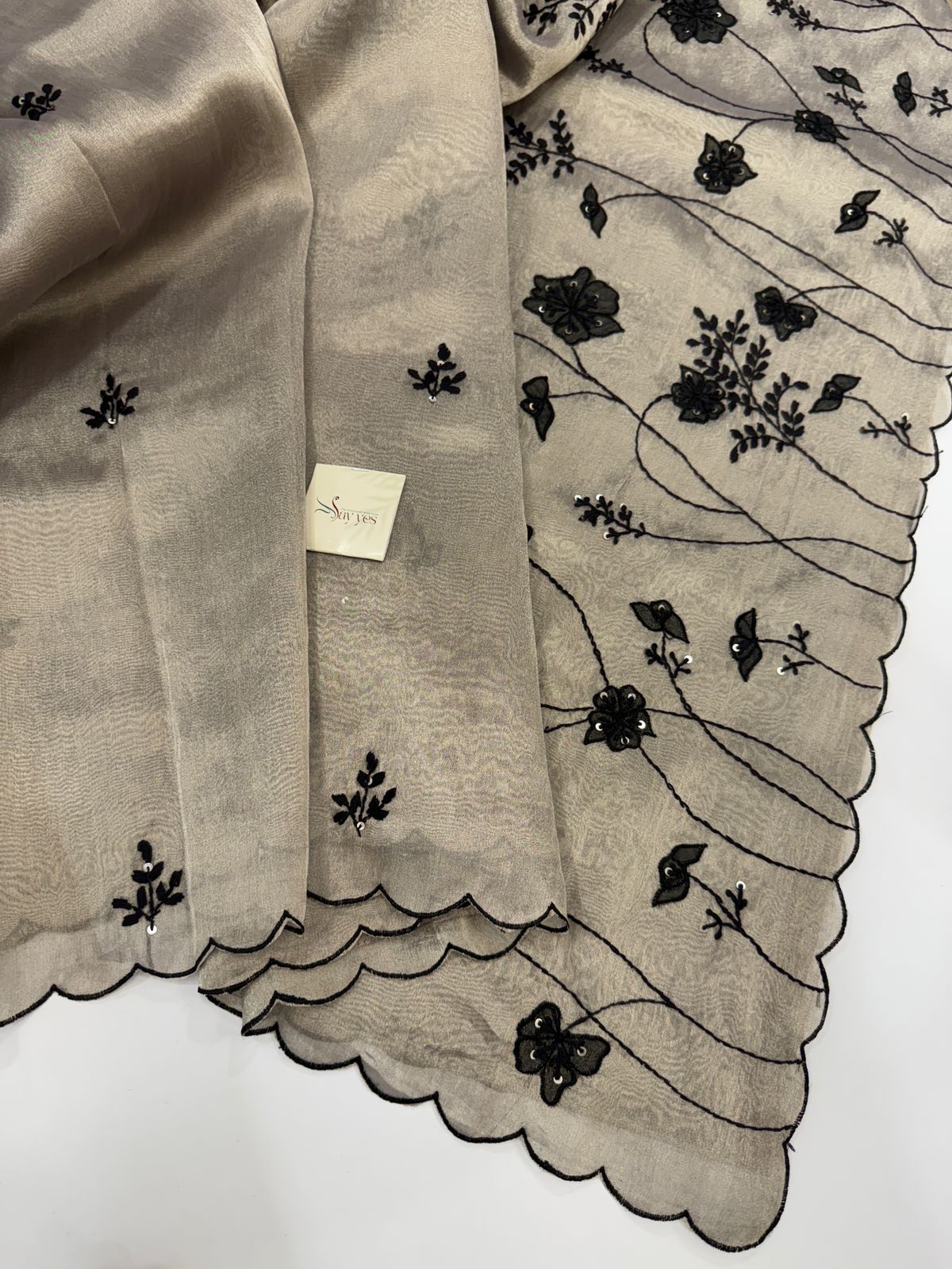 Elevate your ethnic wardrobe with this premium metallic tissue silk Ready to wear saree featuring delicate hand embroidery in contrast black floral motifs. The shimmering tissue silk base gives a luxurious sheen, while the scalloped embroidered border adds timeless elegance. Perfect for weddings, cocktail parties, and festive occasions, this designer saree blends traditional craftsmanship with contemporary sophistication.