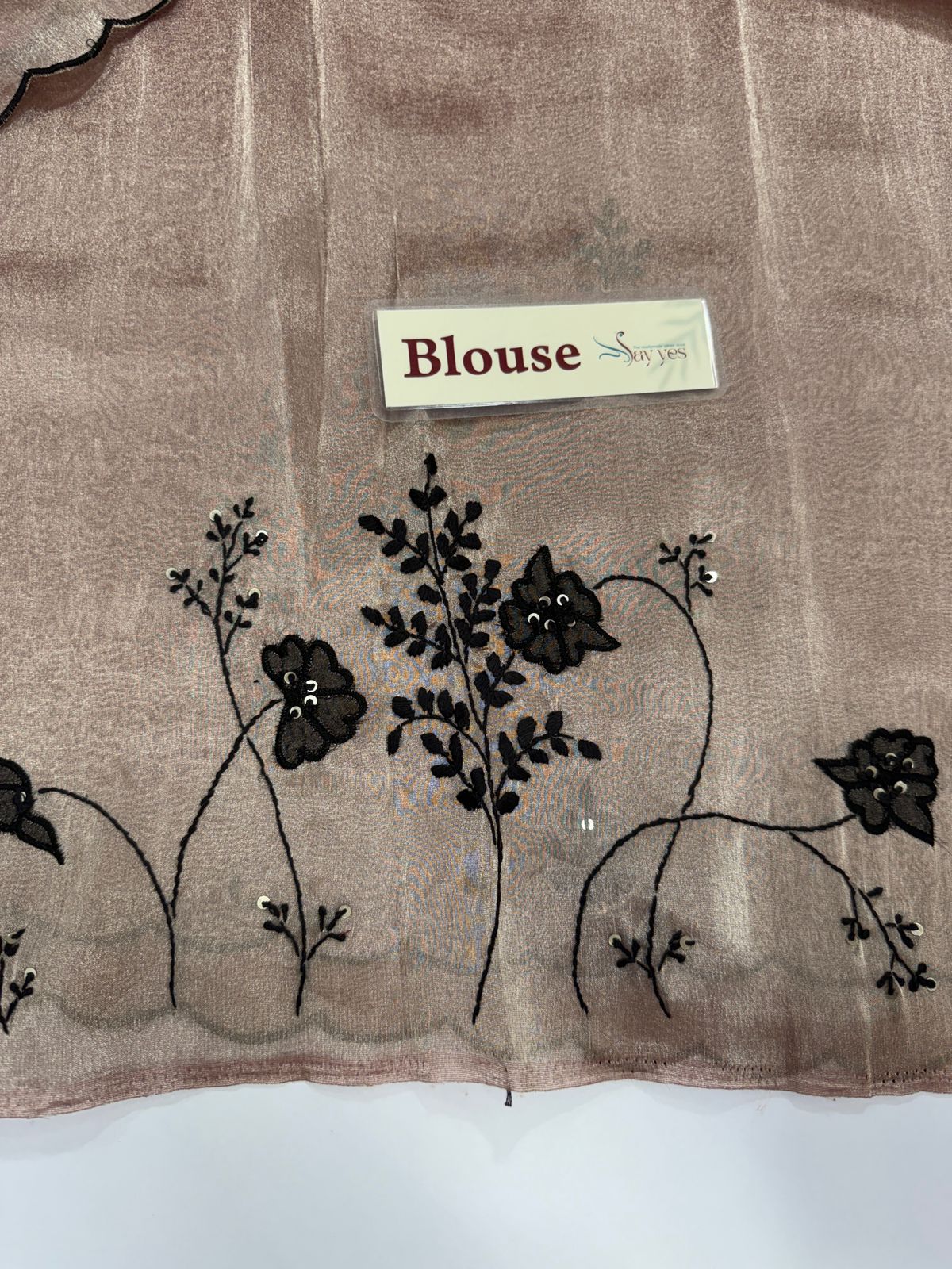 Elevate your ethnic wardrobe with this premium metallic tissue silk Ready to wear saree featuring delicate hand embroidery in contrast black floral motifs. The shimmering tissue silk base gives a luxurious sheen, while the scalloped embroidered border adds timeless elegance. Perfect for weddings, cocktail parties, and festive occasions, this designer saree blends traditional craftsmanship with contemporary sophistication.