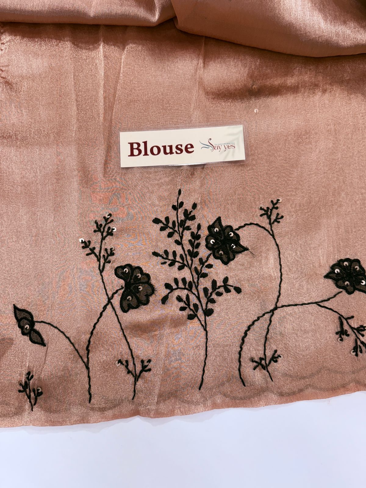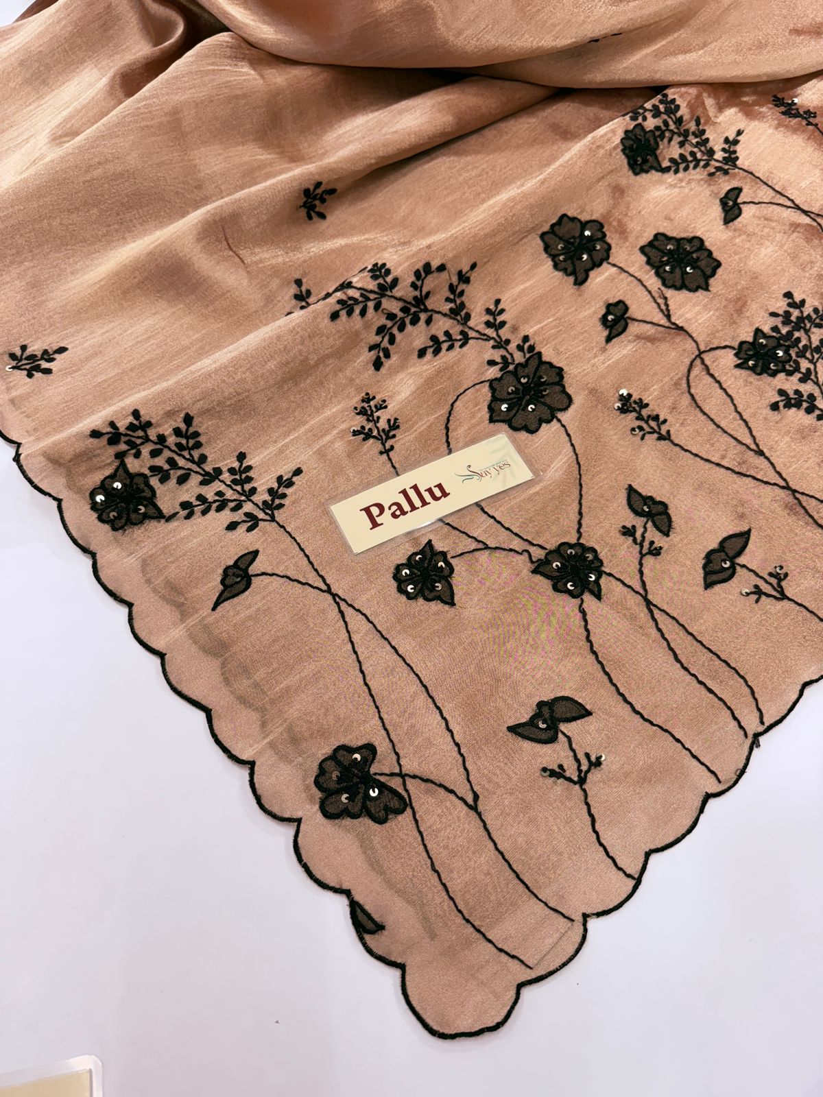 Elevate your ethnic wardrobe with this premium metallic tissue silk Ready to wear saree featuring delicate hand embroidery in contrast black floral motifs. The shimmering tissue silk base gives a luxurious sheen, while the scalloped embroidered border adds timeless elegance. Perfect for weddings, cocktail parties, and festive occasions, this designer saree blends traditional craftsmanship with contemporary sophistication.