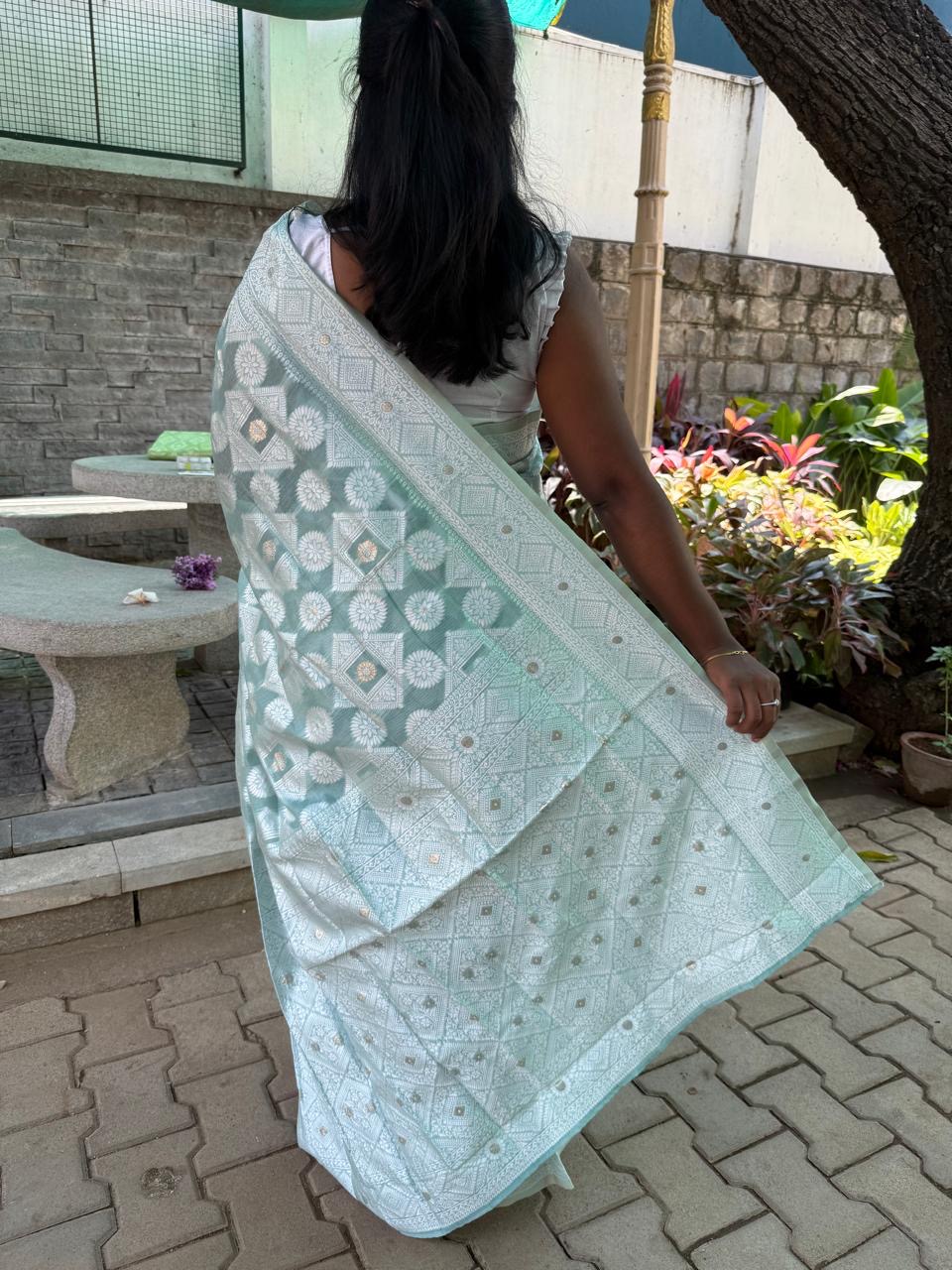 The broad zari border and pallu exude opulence, making it perfect for weddings, festive occasions, and special celebrations. Whether paired with a classic silk blouse or a modern fusion top, this saree is a statement of sophistication and charm