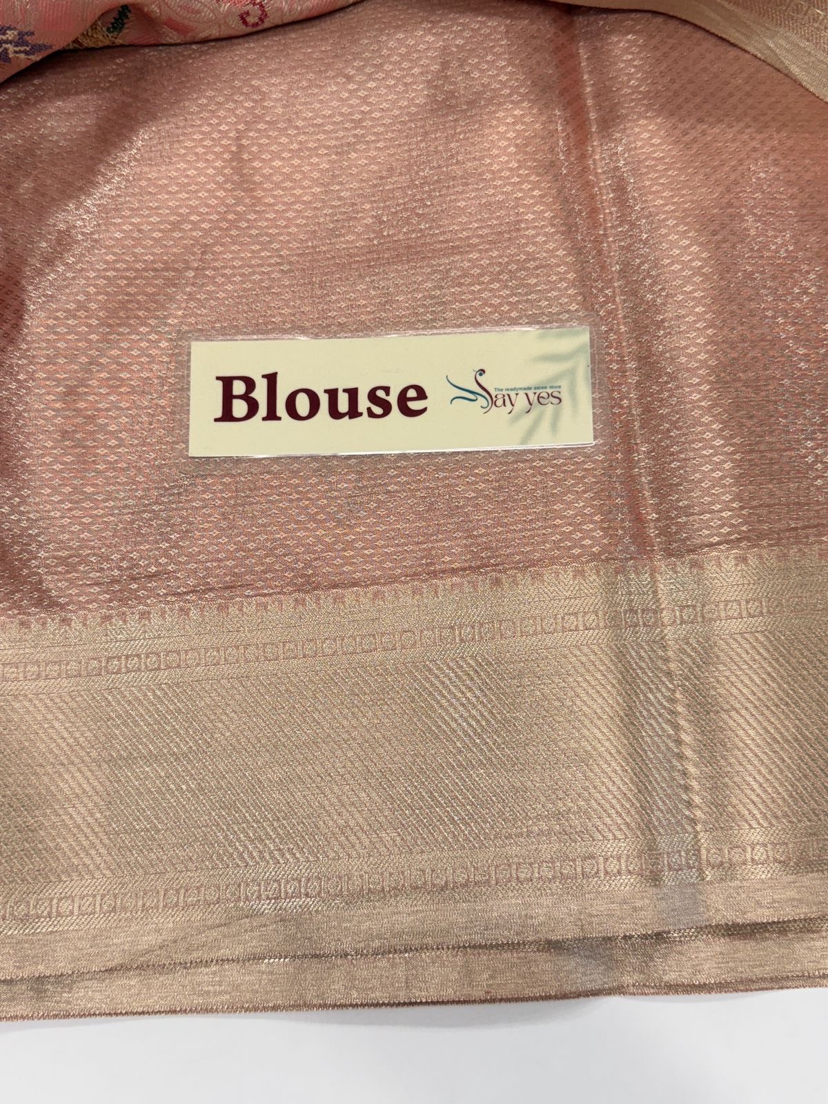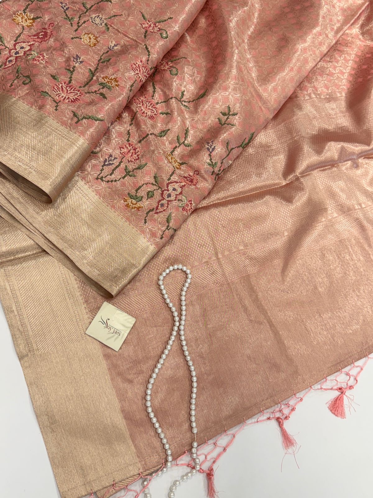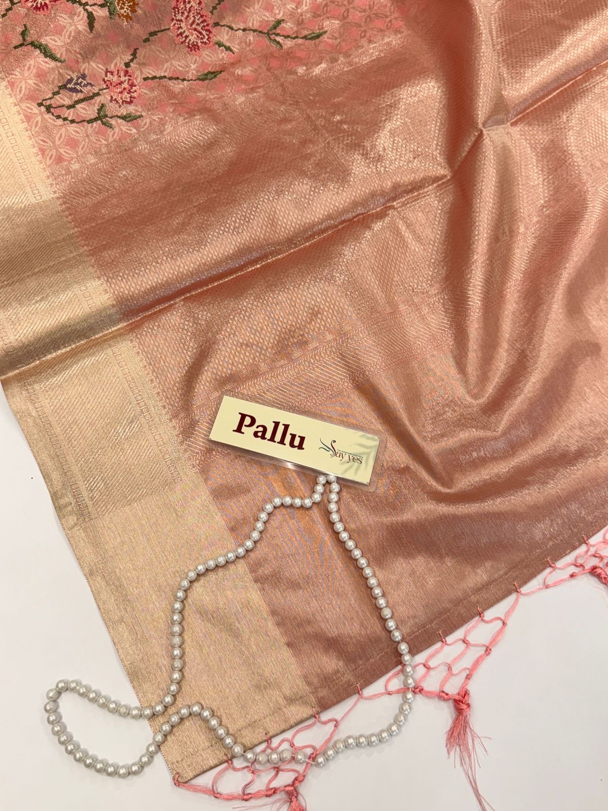 Pallu/Endpiece: Continuation of the jacquard weave, highlighted with matching blush pink tassels for a graceful finish
