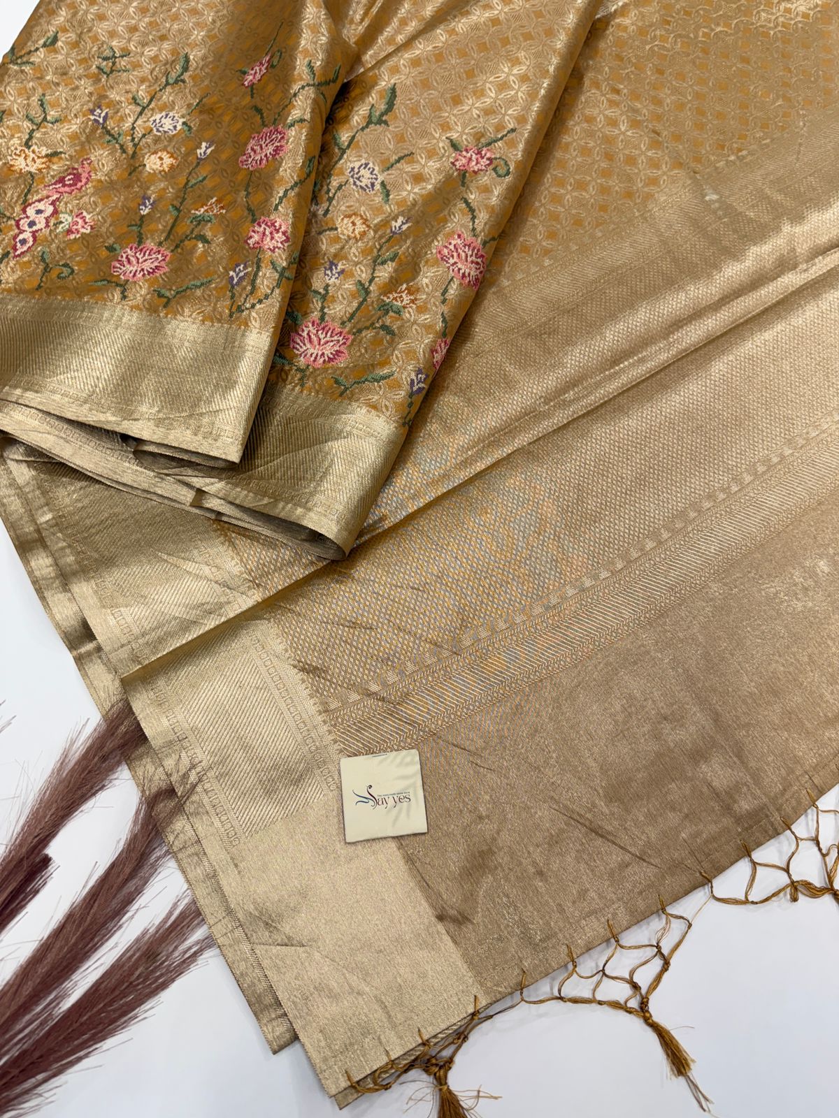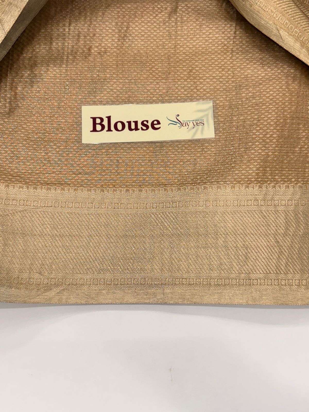 Border: Subtle champagne-gold zari border with a delicate geometric weave for understated richness