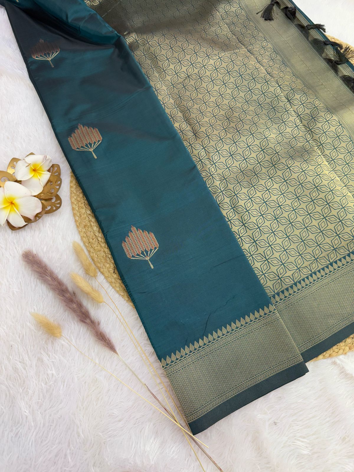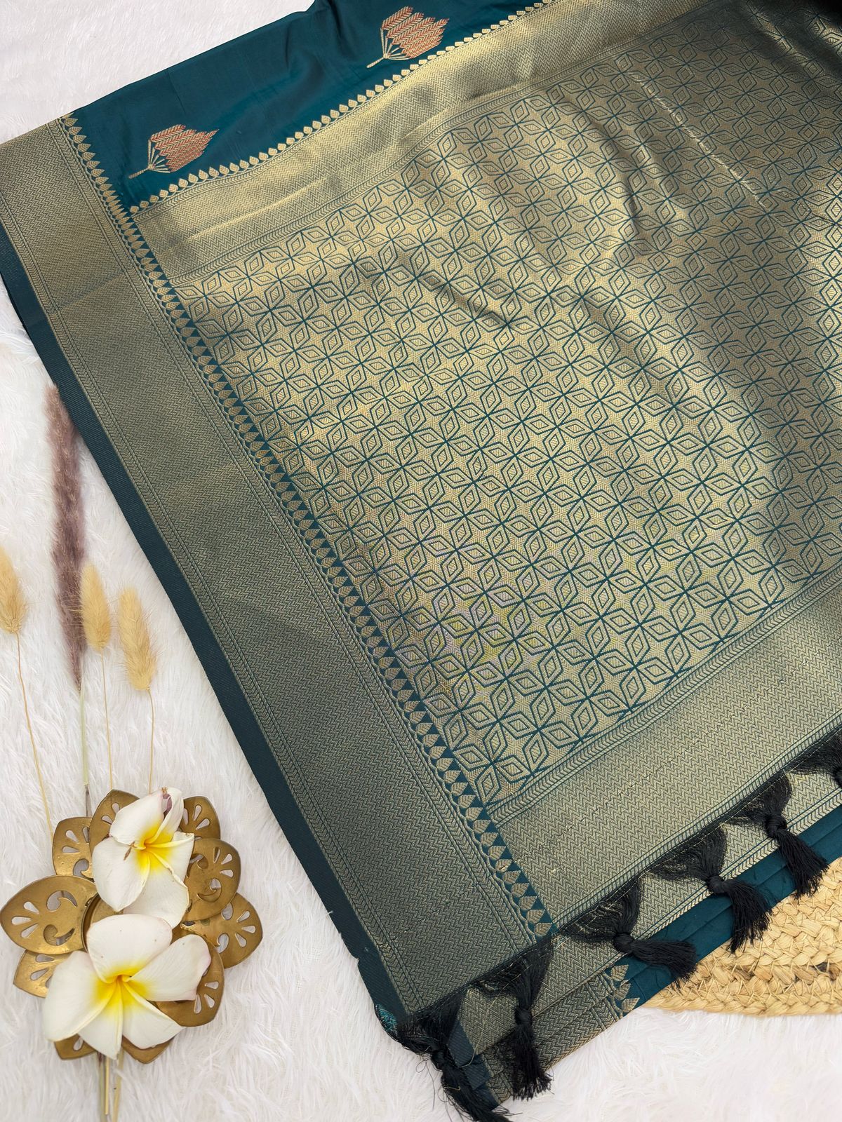 This saree is a beautifully woven piece in buttery soft silk exuding elegance and grace. The fabric is Banarasi brocade silk, featuring a delicate floral (all-over vine and flower) motifs that adds elegance and sophistication. The border and pallu are adorned with detailed paisley and geometric motifs, enhancing its traditional appeal.