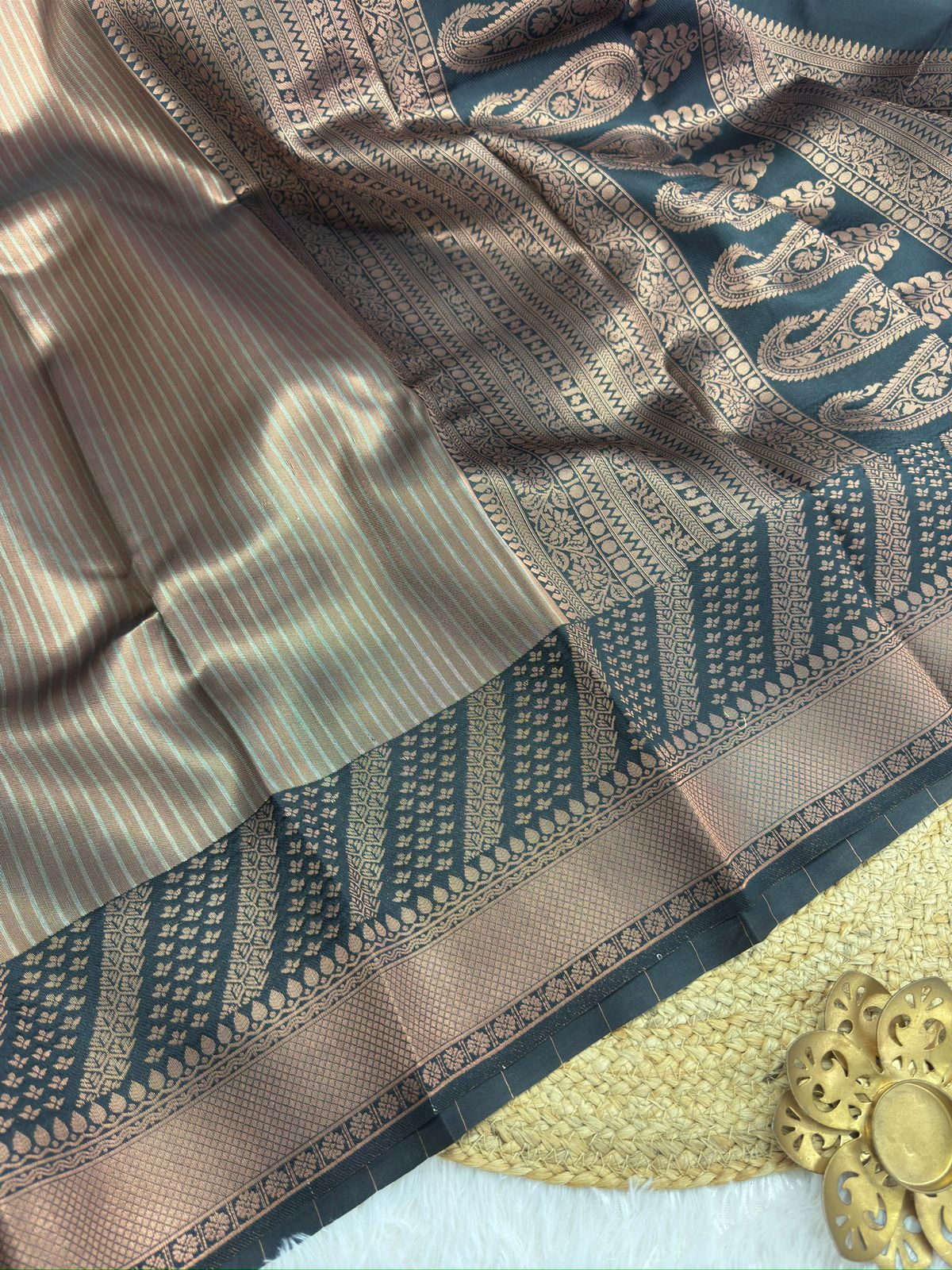 This vibrant saree is a celebration of elegance and grace. The metallic green body is adorned with zari woven stripes, exuding a fresh and radiant charm. Paired with a zari border featuring intricate floral patterns, this saree brings a delightful contrast that is both bold and beautiful. The pallu extends the rich zari detailing, adding a touch of opulence to the design.