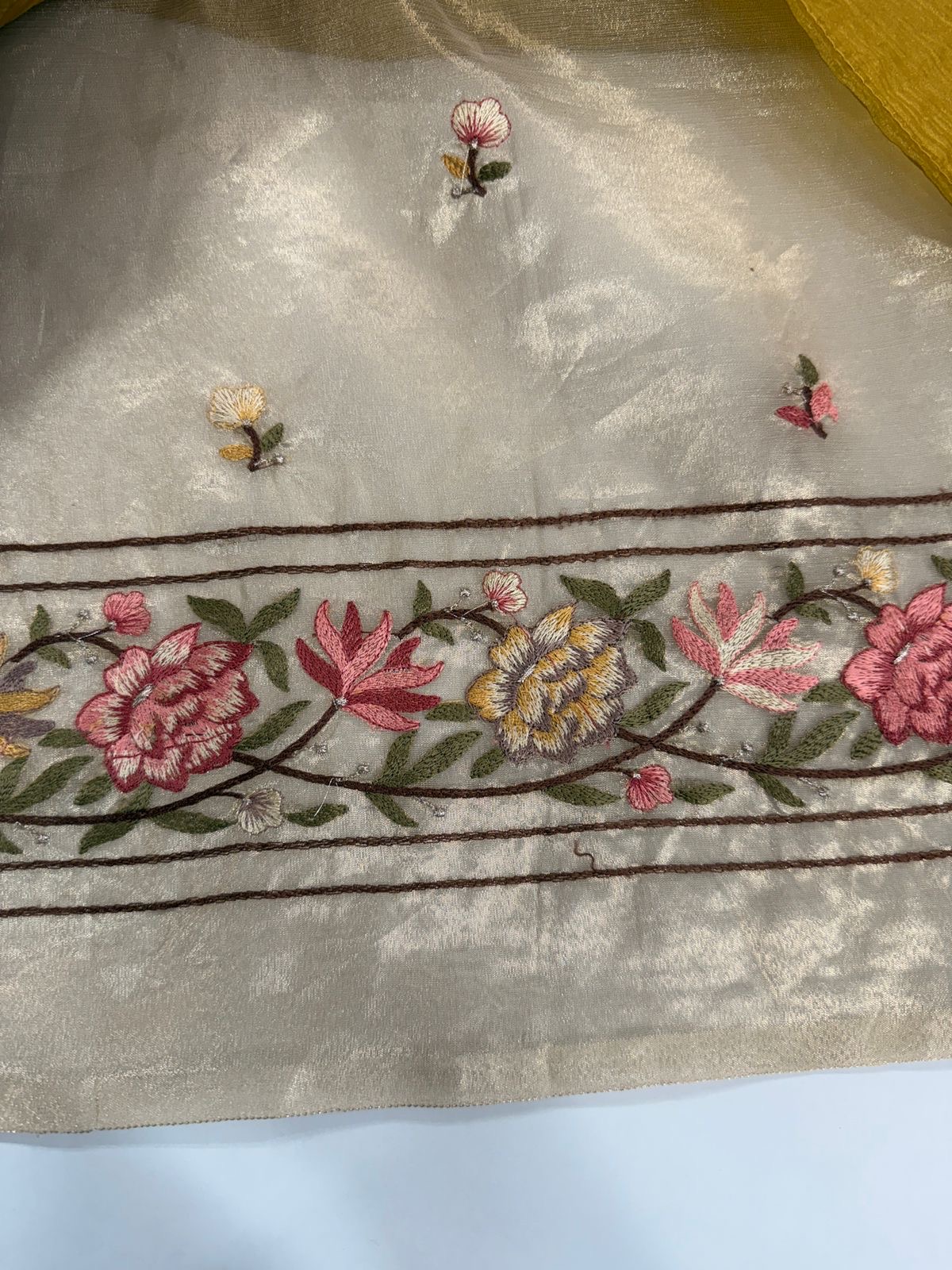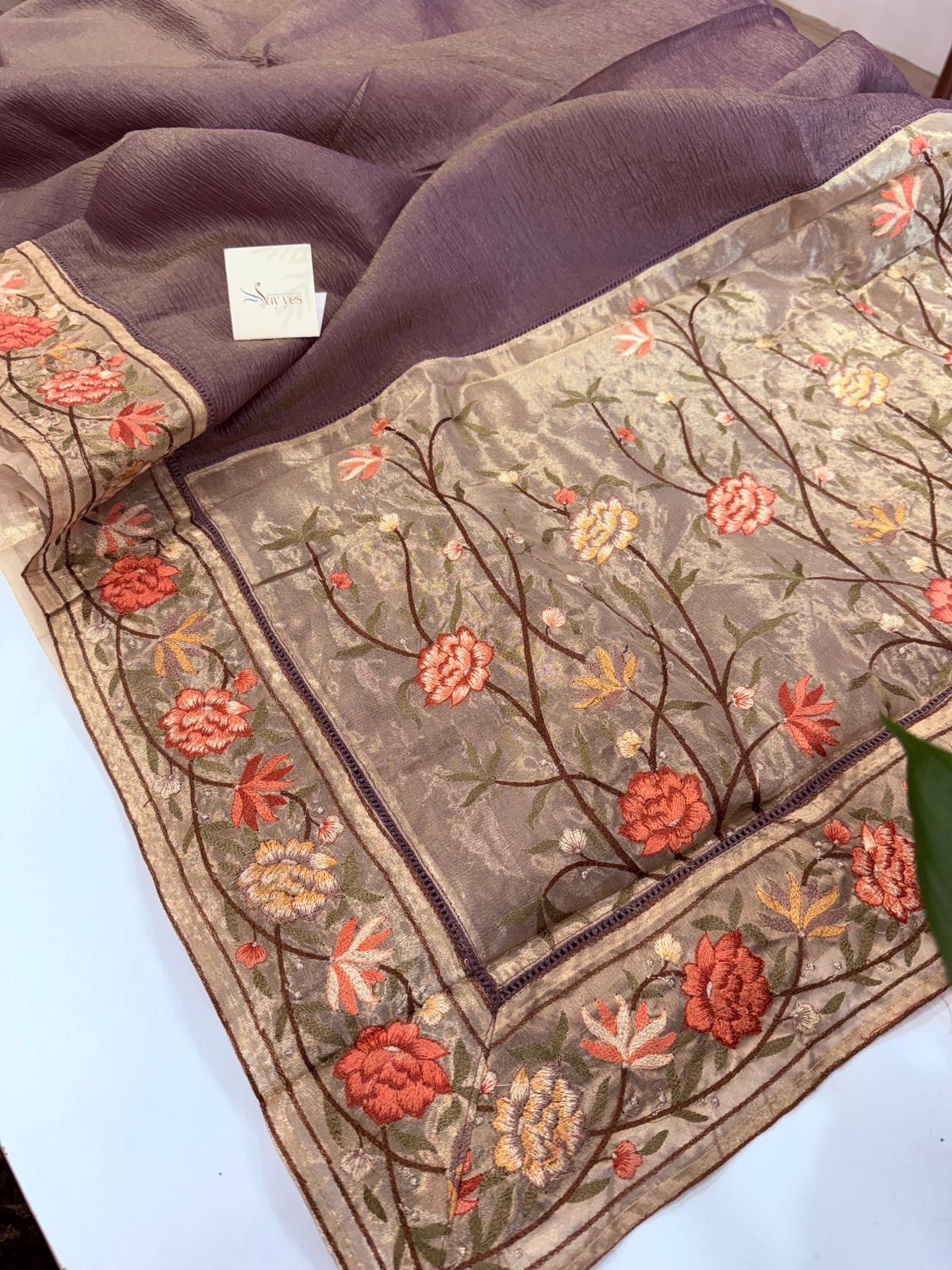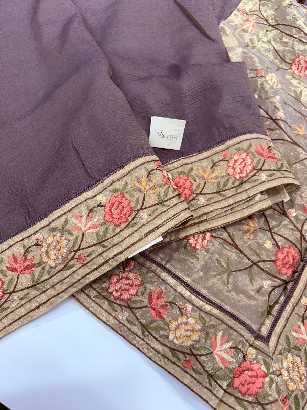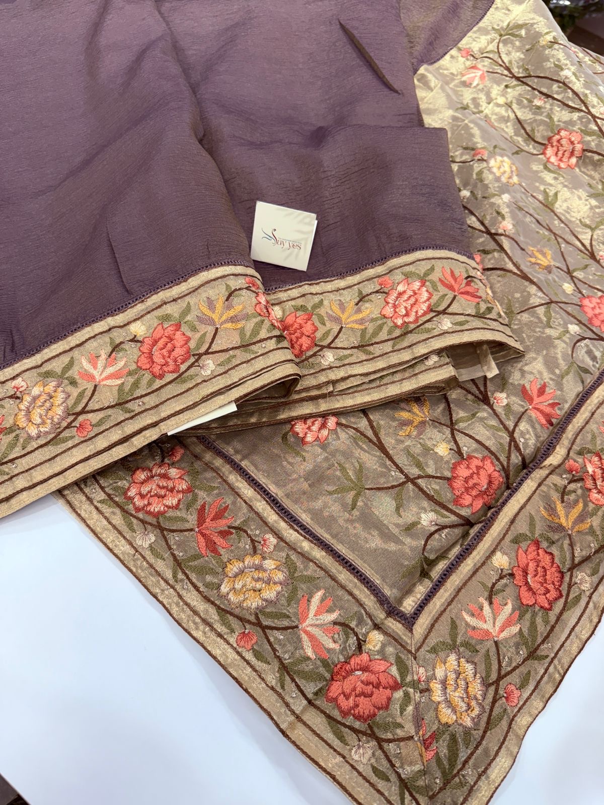 A graceful purple tissue organza saree adorned with a luxurious floral embroidered border. The plain textured body in deep mustard offers a rich and minimal base, allowing the intricate threadwork to stand out. The border features finely detailed multicolor floral embroidery in shades of pink, yellow, and peach with leafy vines on a muted beige base, adding a timeless, handcrafted charm. Lightweight and flowy, this saree drapes effortlessly, making it ideal for festive occasions, receptions, and elegant gatherings.
