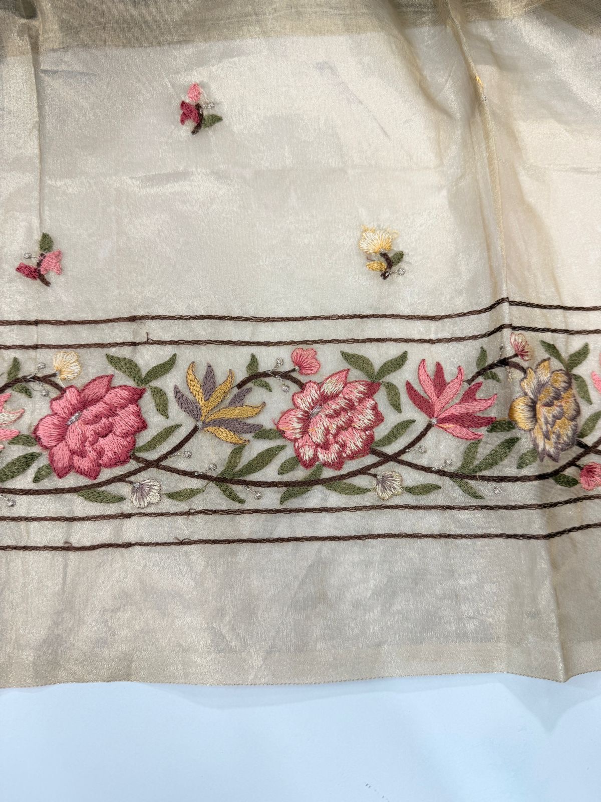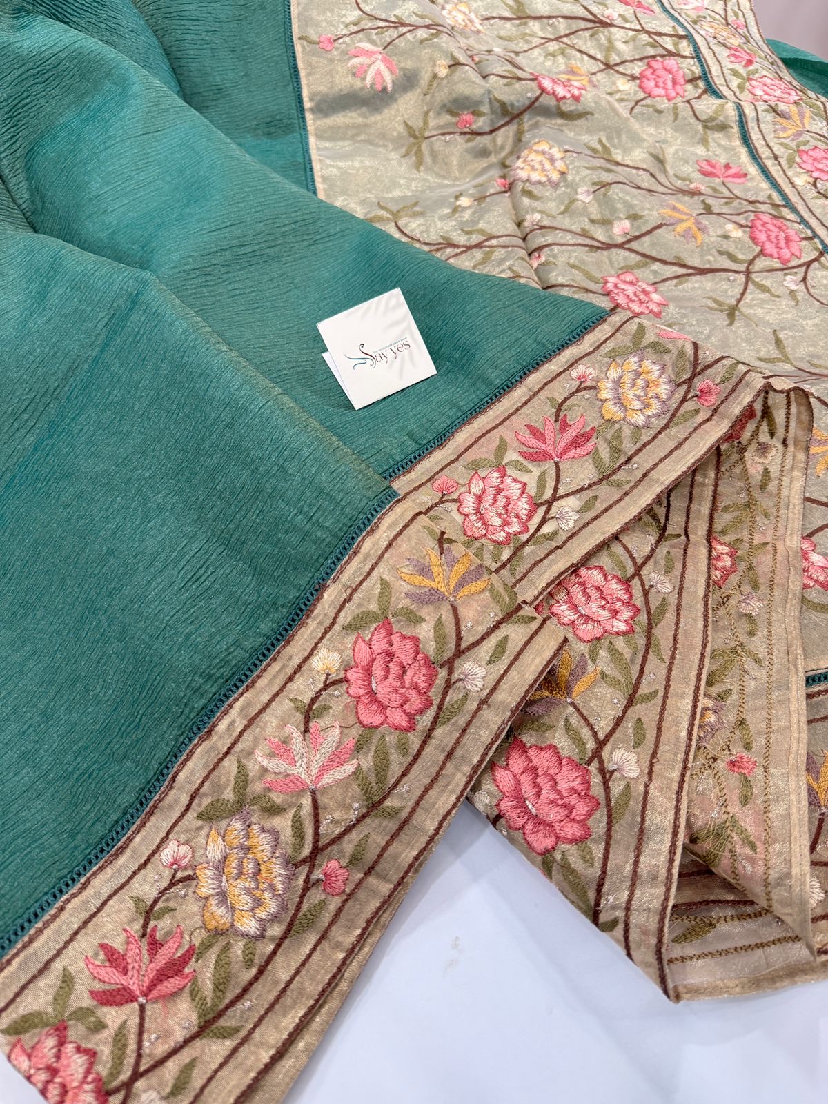 A graceful Forest Green tissue organza saree adorned with a luxurious floral embroidered border. The plain textured body in deep mustard offers a rich and minimal base, allowing the intricate threadwork to stand out. The border features finely detailed multicolor floral embroidery in shades of pink, yellow, and peach with leafy vines on a muted beige base, adding a timeless, handcrafted charm. Lightweight and flowy, this saree drapes effortlessly, making it ideal for festive occasions, receptions, and elegant gatherings.