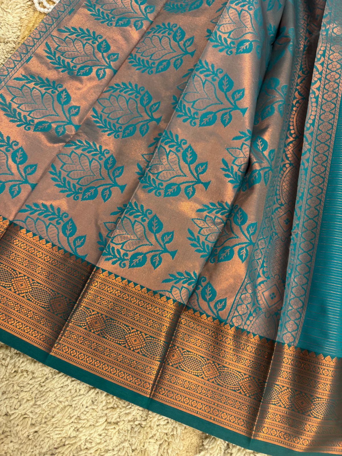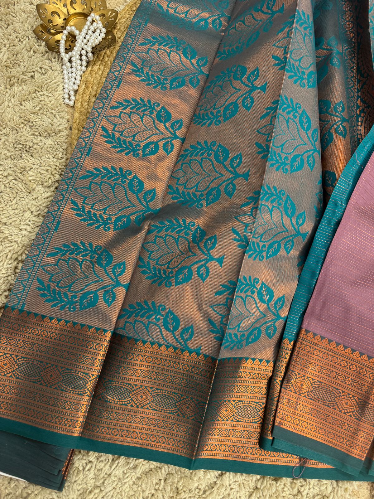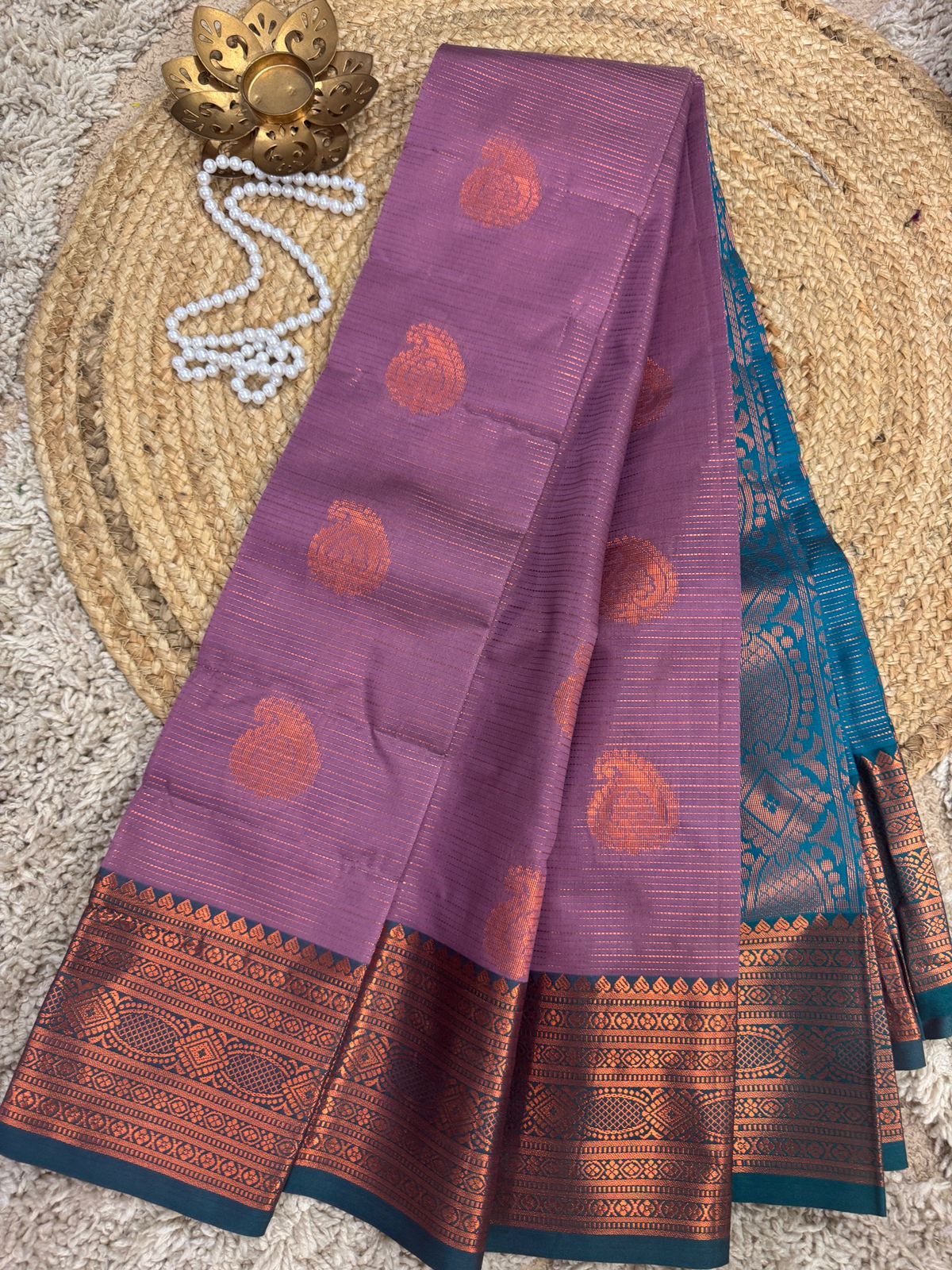 We have ingeniously chosen this piece of Kanchipuram Semi silk to suit every Indian Occasion. Neither too flashy, not too plain, perfect to wear for Weddings and auspicious days.
