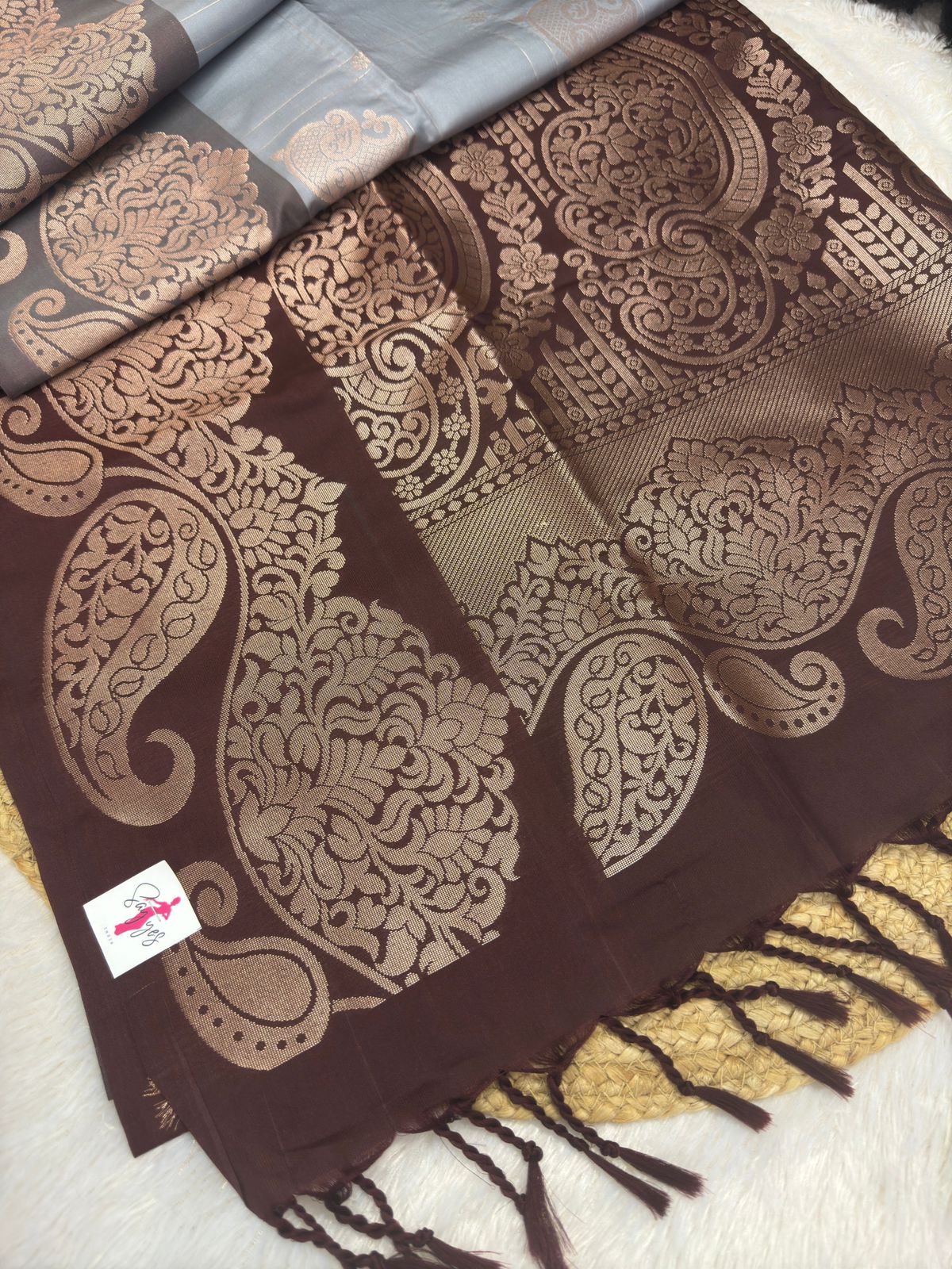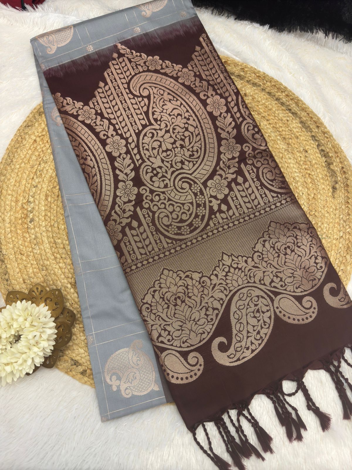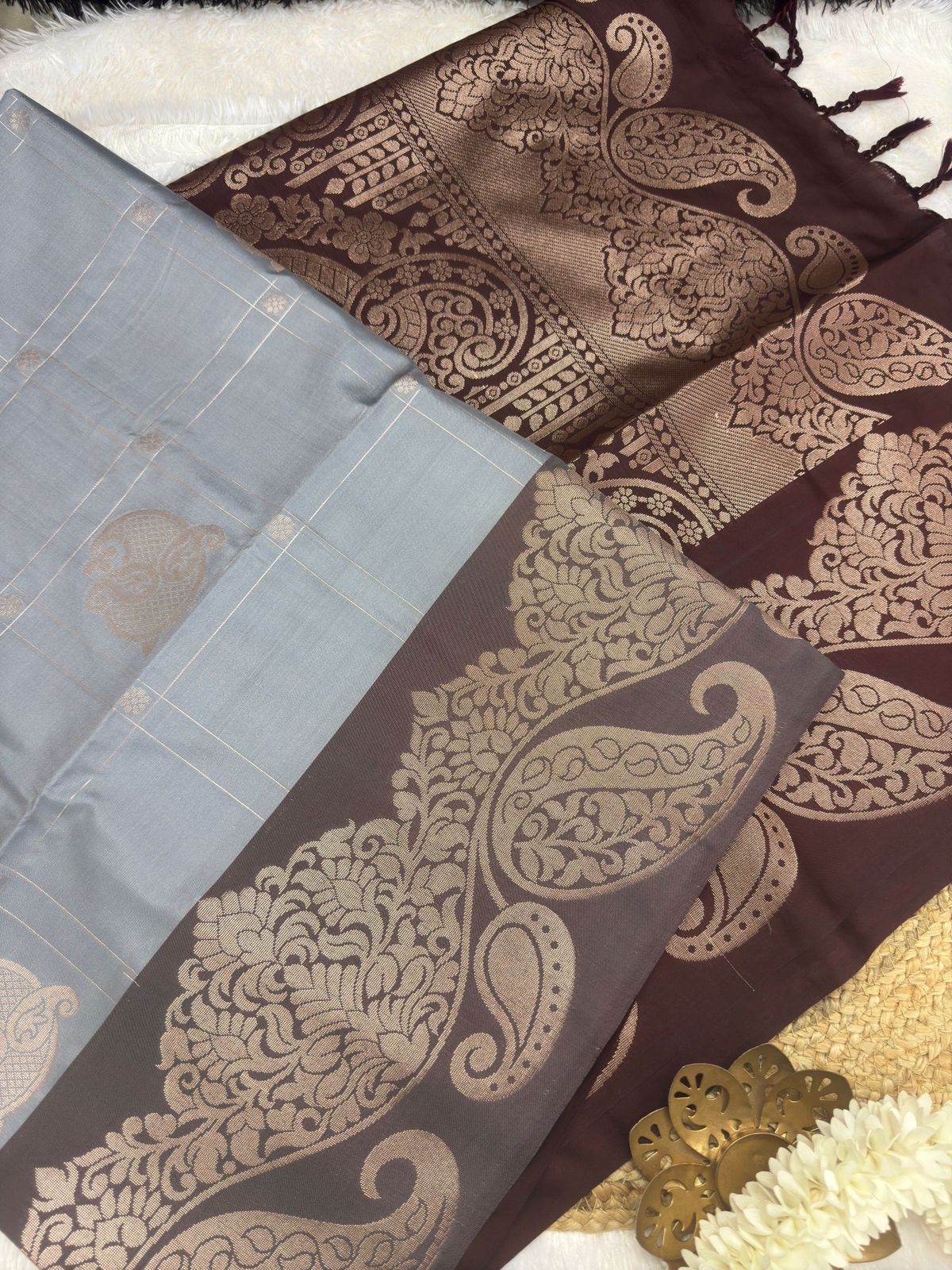 We have ingeniously chosen this piece of Kanchipuram soft silk to suit every Indian Occasion. Neither too flashy, not too plain, perfect to wear for Weddings and auspicious days.