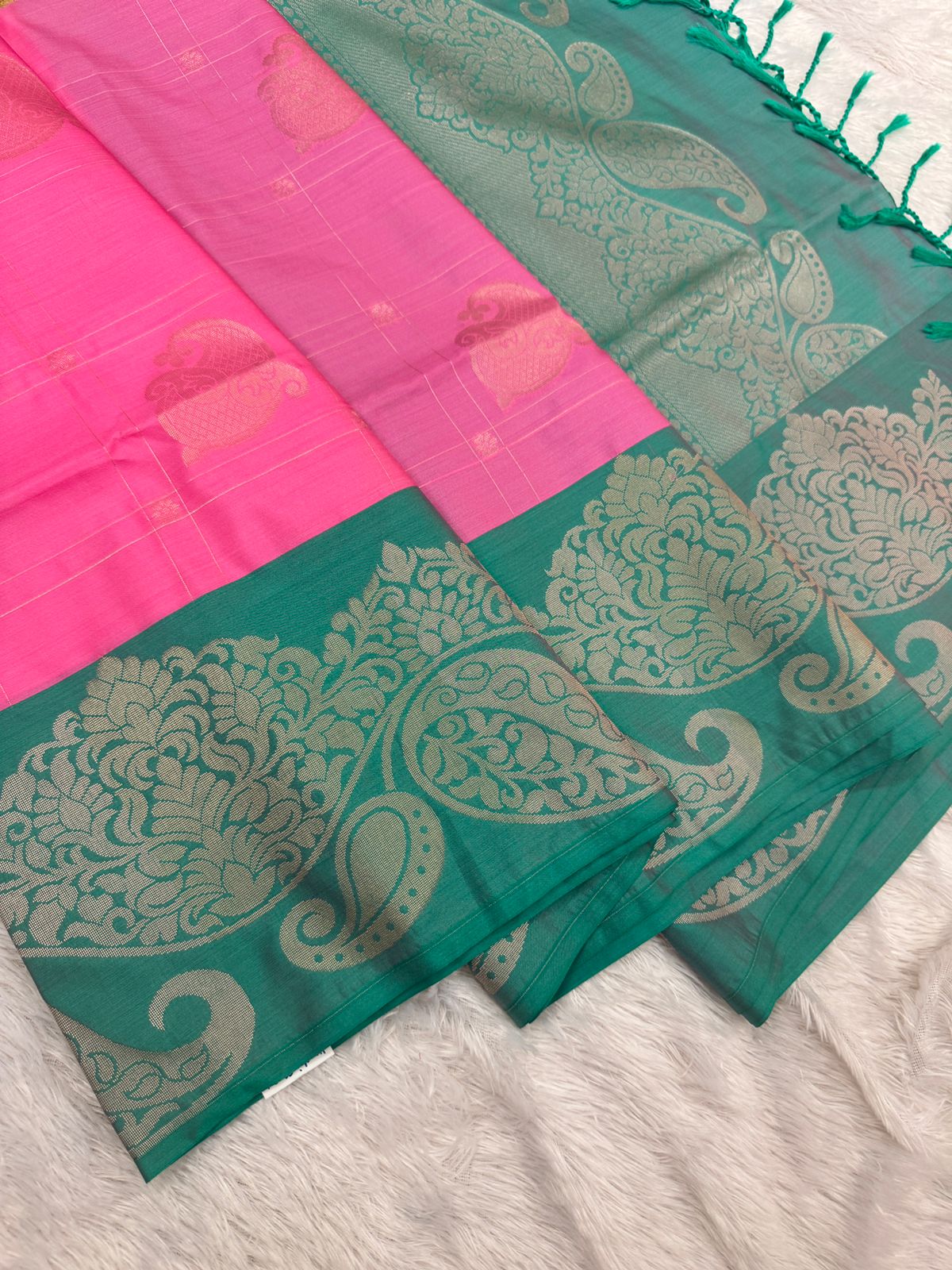 We have ingeniously chosen this piece of Kanchipuram soft silk to suit every Indian Occasion. Neither too flashy, not too plain, perfect to wear for Weddings and auspicious days.