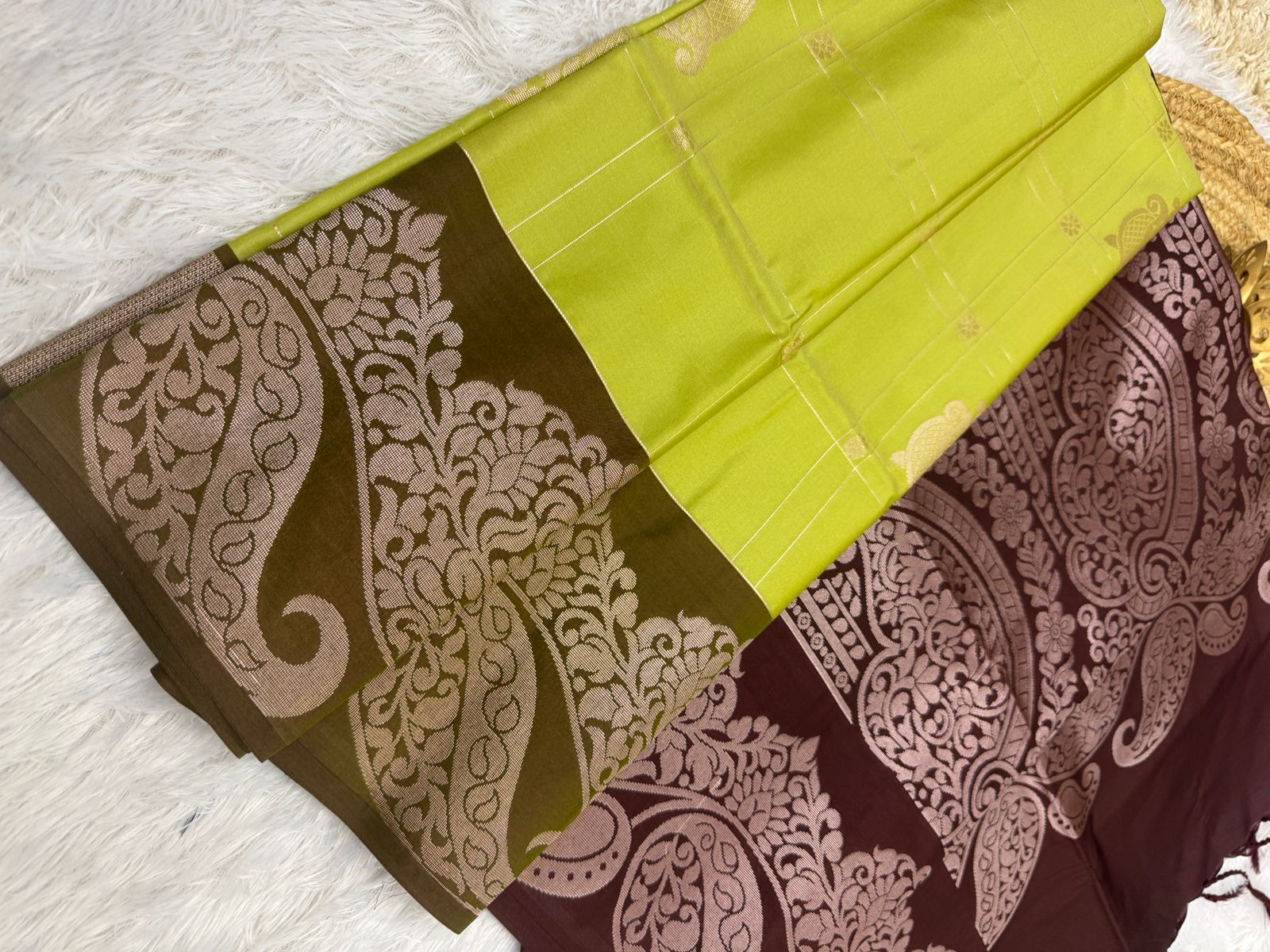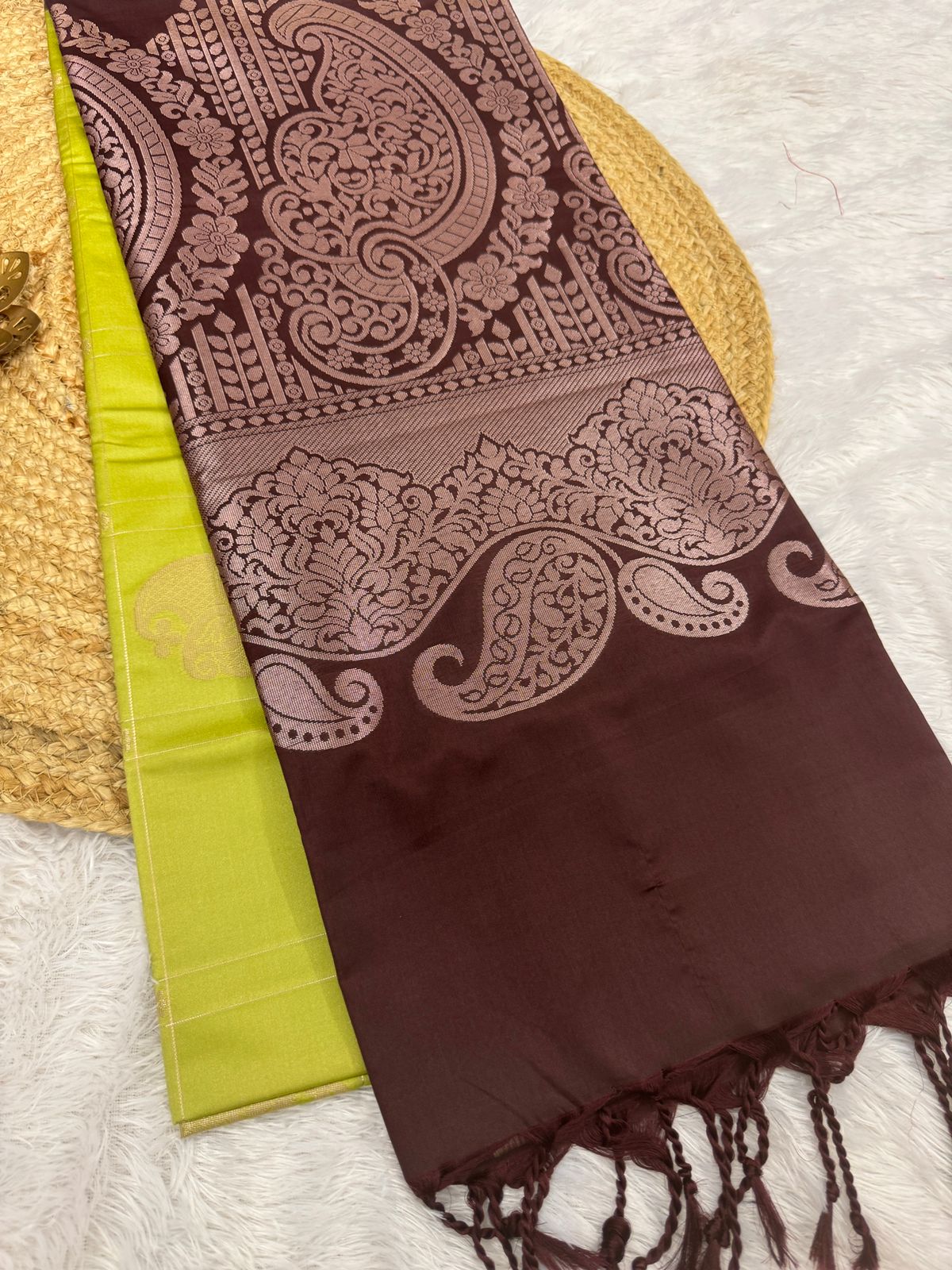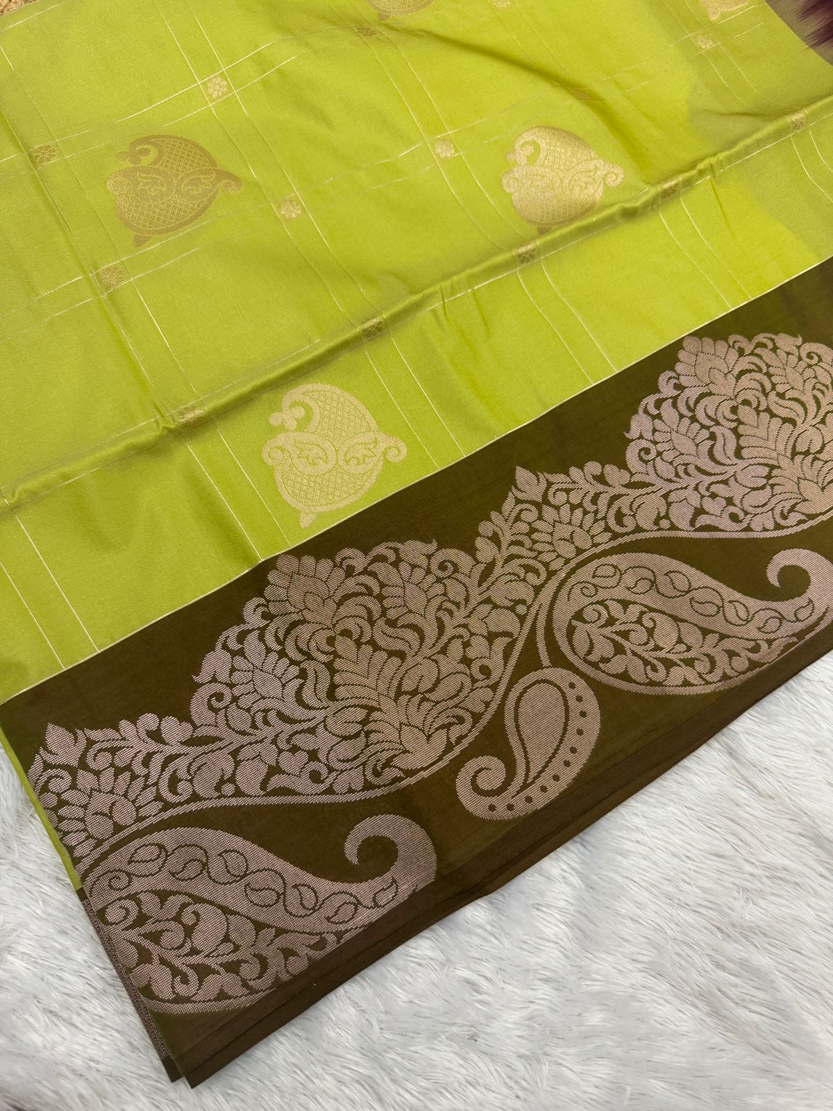 We have ingeniously chosen this piece of Kanchipuram soft silk to suit every Indian Occasion. Neither too flashy, not too plain, perfect to wear for Weddings and auspicious days.