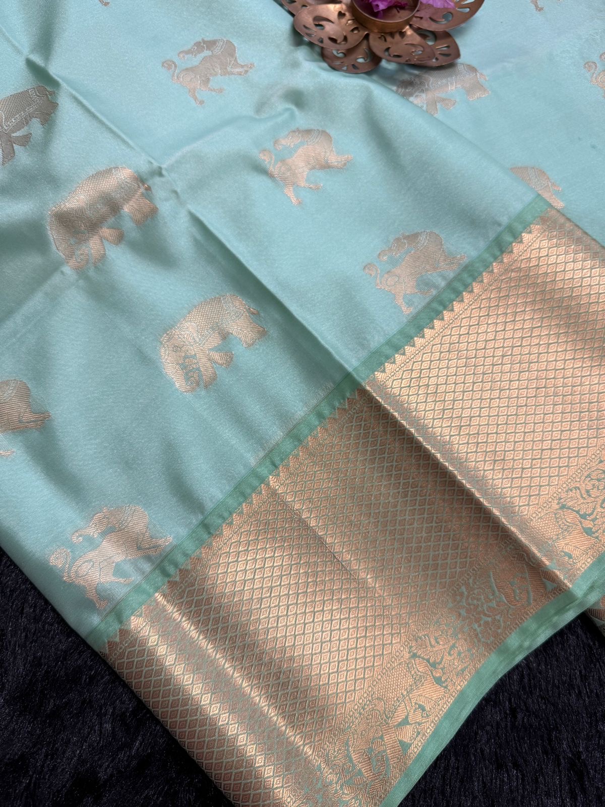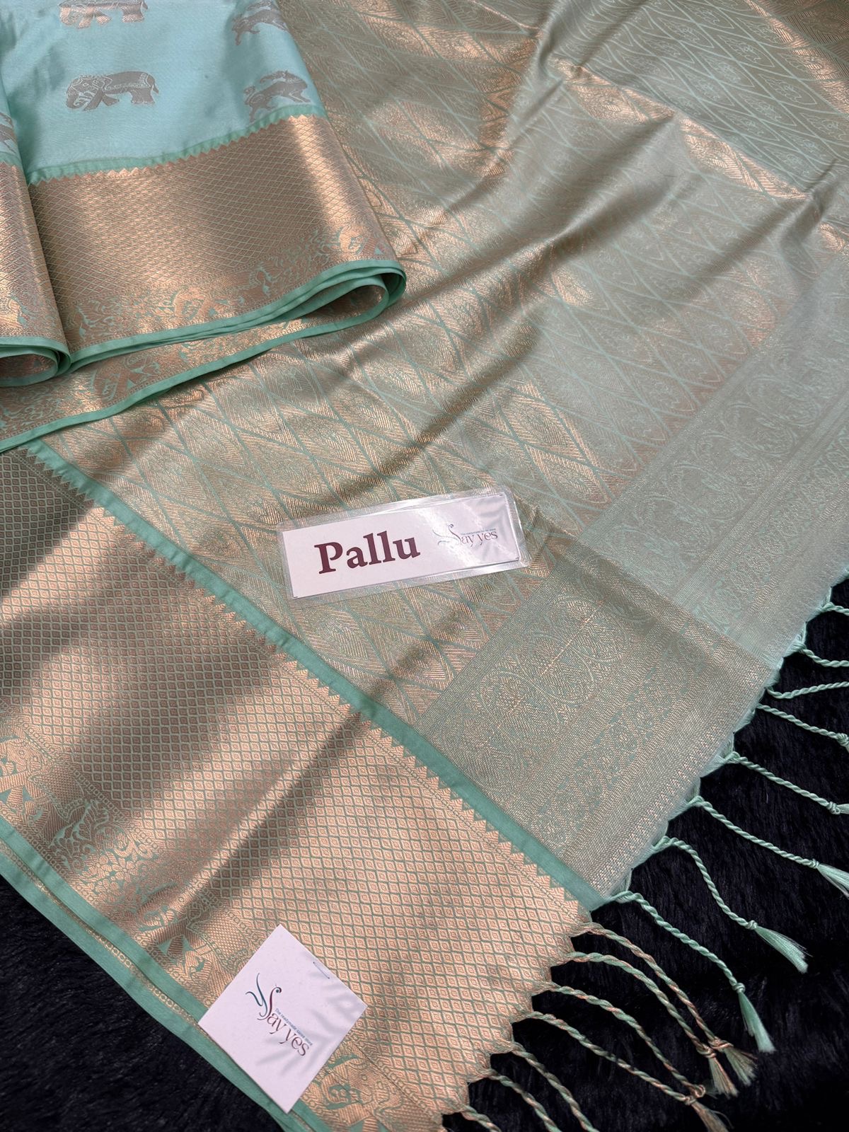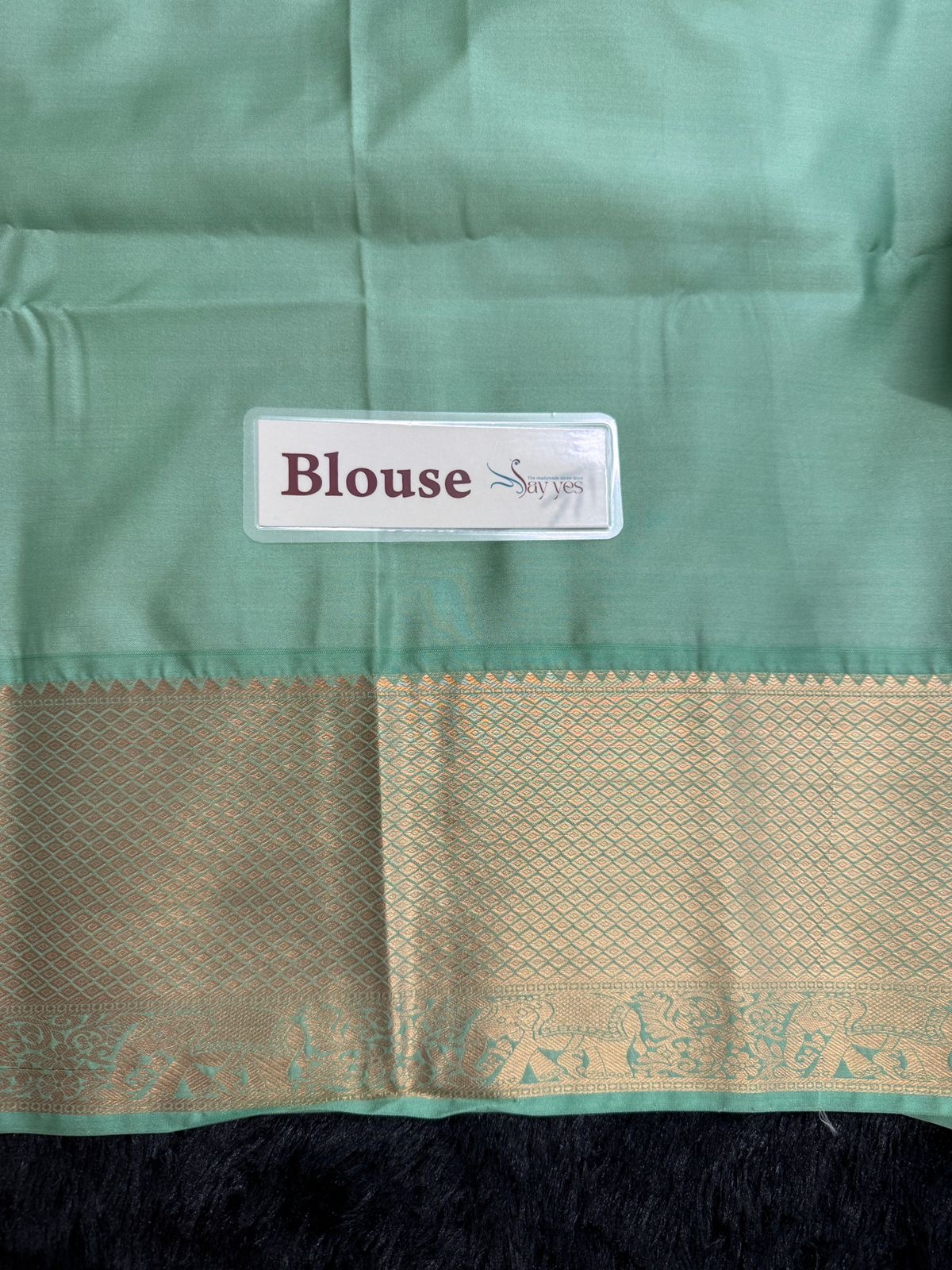 This is a Kanjivaram silk saree featuring a dual-tone combination of pastel green body with antique gold zari motifs and a contrasting deep violet pallu and border richly woven with intricate jacquard floral and peacock patterns. The wide zari border with traditional geometric and floral motifs in copper-silver zari enhances the grandeur, making it ideal for weddings, festive occasions, and cultural events. The weave showcases the finesse of South Indian craftsmanship, blending tradition with regal aesthetics.