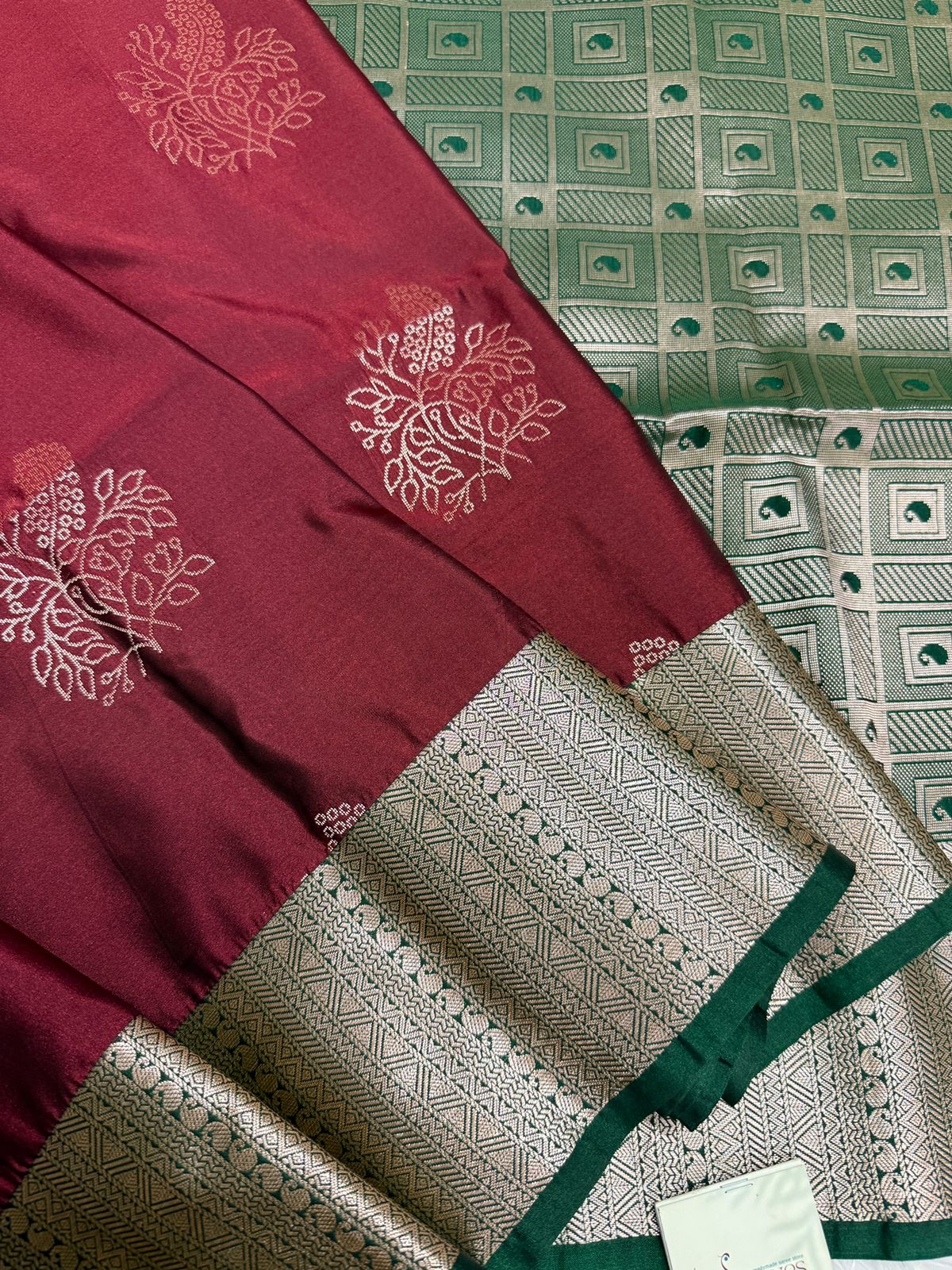This is a Kanjivaram silk saree featuring a dual-tone combination of pastel green body with antique gold zari motifs and a contrasting deep violet pallu and border richly woven with intricate jacquard floral and peacock patterns. The wide zari border with traditional geometric and floral motifs in copper-silver zari enhances the grandeur, making it ideal for weddings, festive occasions, and cultural events. The weave showcases the finesse of South Indian craftsmanship, blending tradition with regal aesthetics.
