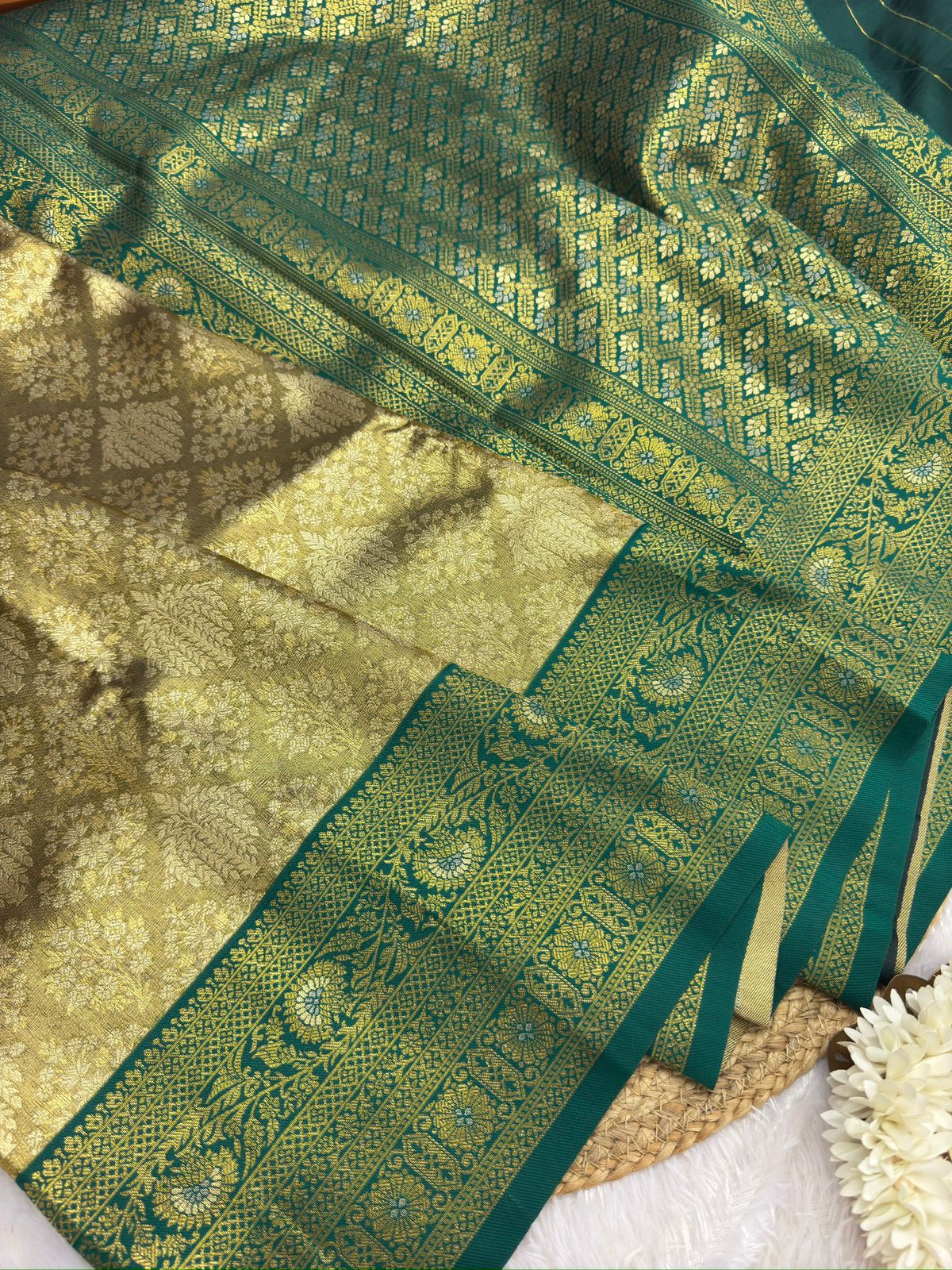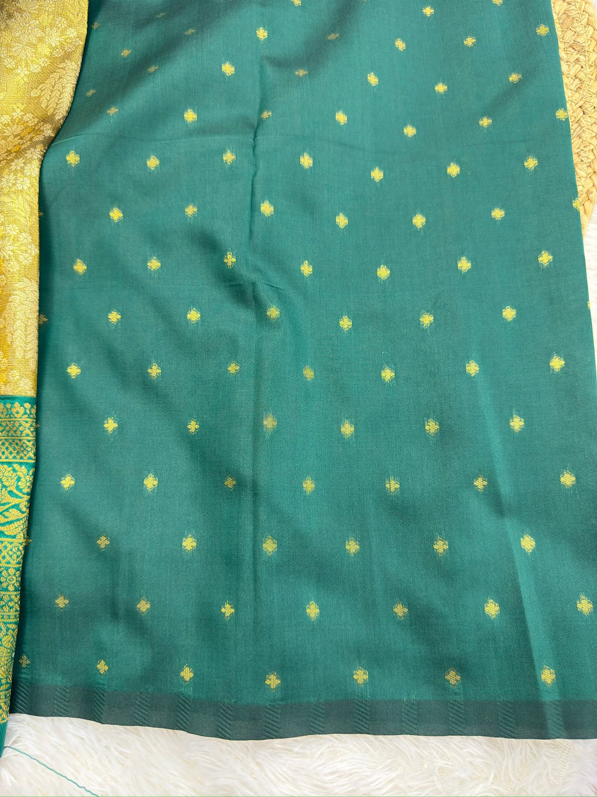 We have ingeniously chosen this piece of Kanchipuram soft silk to suit every Indian Occasion. Neither too flashy, not too plain, perfect to wear for Weddings and auspicious days.