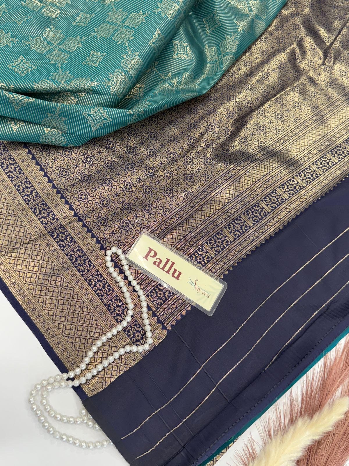 An exquisite Peacock green semi silk saree featuring intricate floral and vine motifs woven in fine zari work. The saree’s body is adorned with delicate buttas in gold, contrasted beautifully against the rich blue base. Its border showcases a refined geometric weave with a subtle green selvedge, adding a refreshing touch of elegance. Perfect for weddings, festive occasions, or grand celebrations, this drape radiates timeless sophistication and charm.