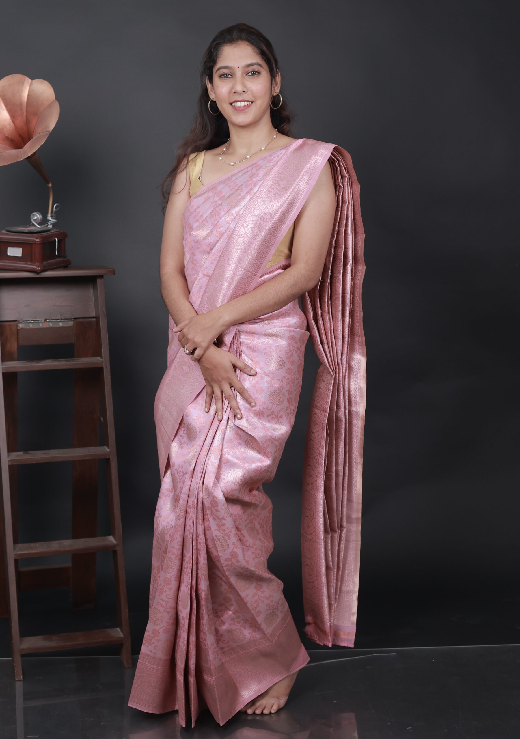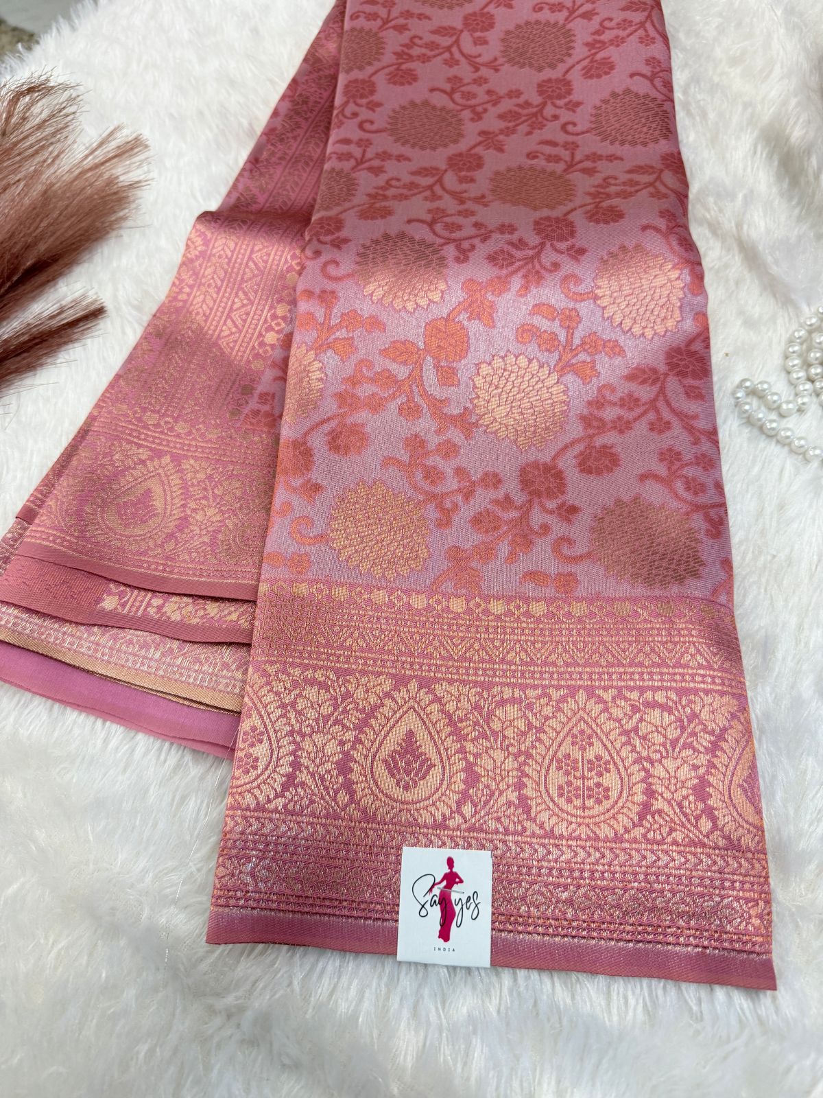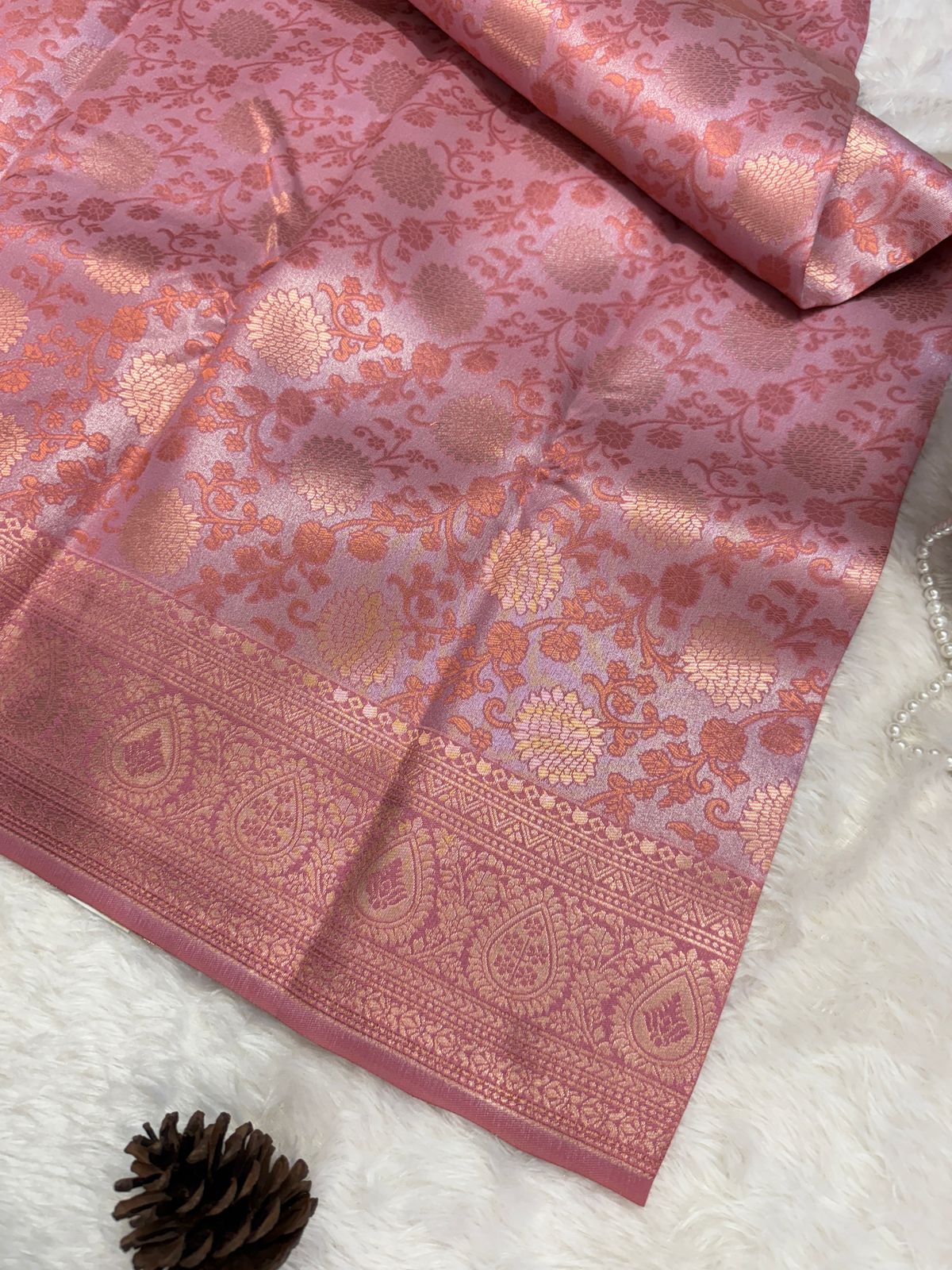 A classic with a romantic twist – Rosé Reverie is your go-to for effortless grace. This soft Banarasi-inspired saree in dusty rose pink features intricate floral zari weaving in golden and copper tones, finished with a delicately detailed border. Lightweight yet rich in tradition, this piece balances elegance with wearability, making it perfect for intimate weddings, festive gatherings, or evening elegance.