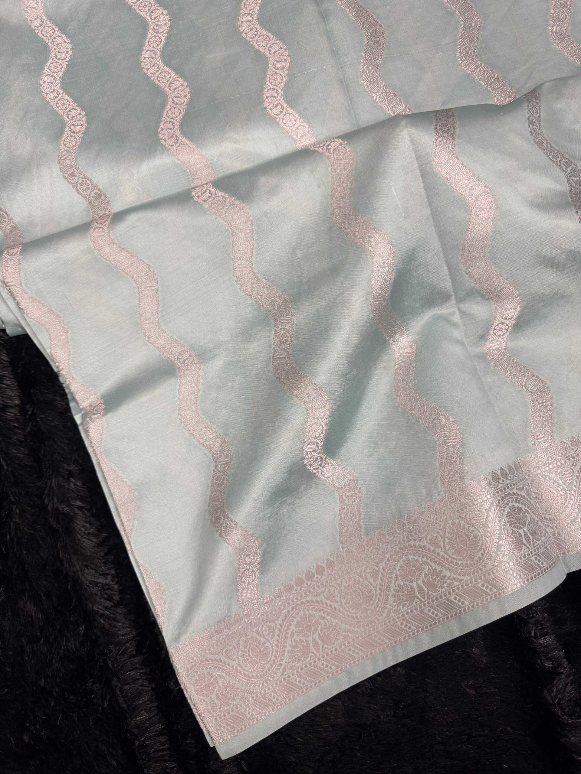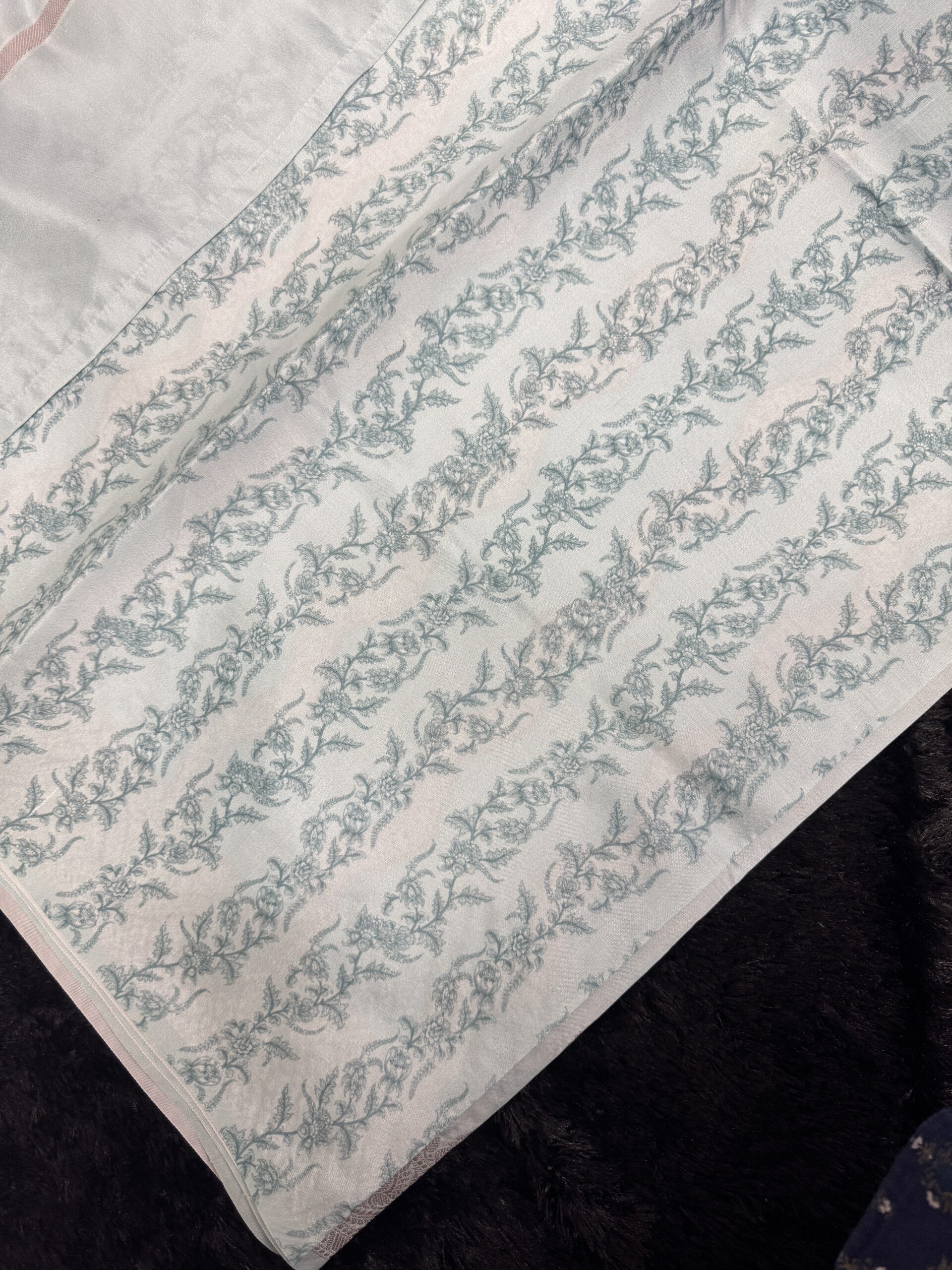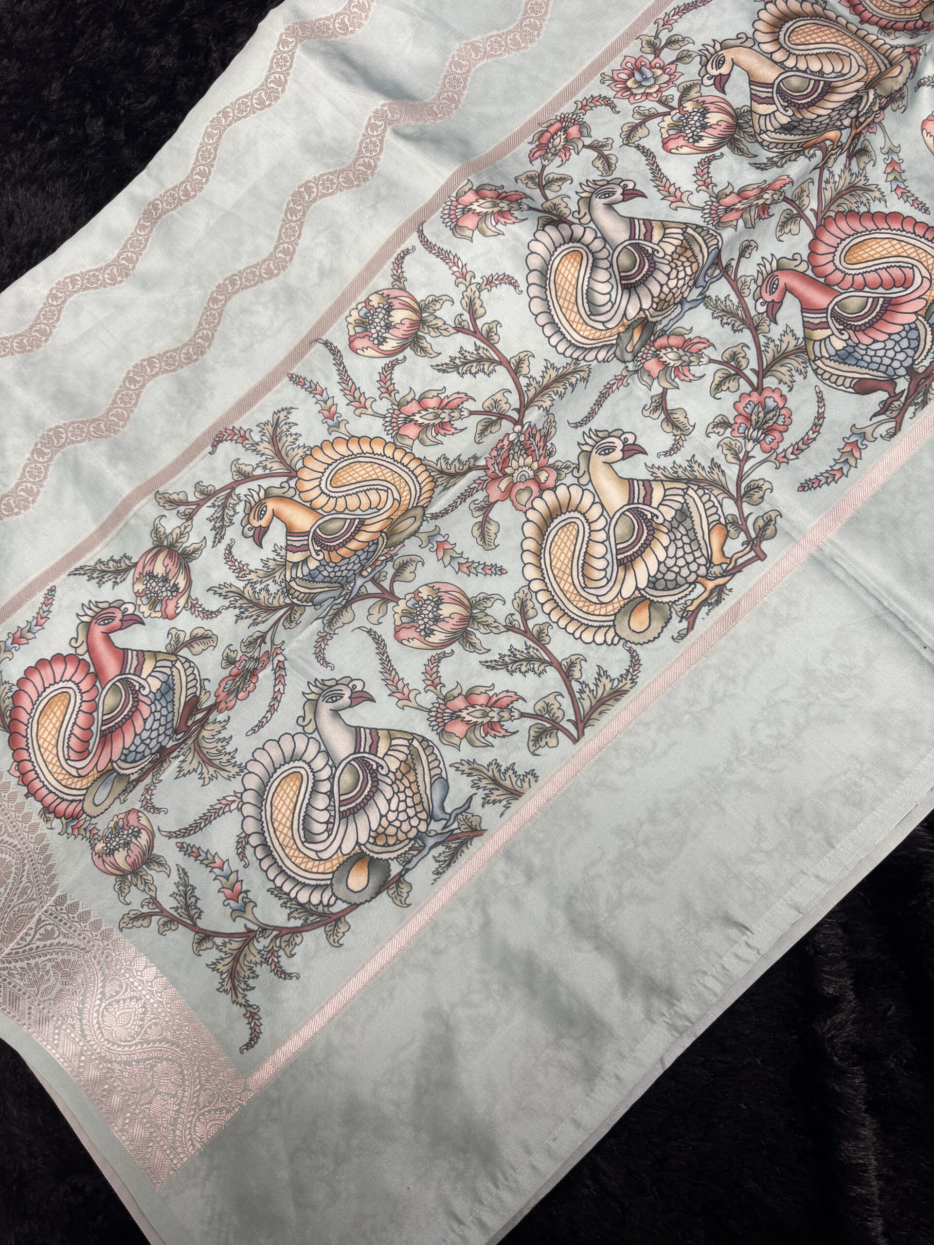 This is a beautifully crafted Tussar silk saree in a soft peach shade. It features intricate woven patterns along the borders, adding elegance to the overall look. The saree showcases traditional motifs with vibrant floral designs and a peacock motif on the pallu, highlighting fine craftsmanship. Its light texture and graceful sheen make it suitable for festive occasions and celebrations.