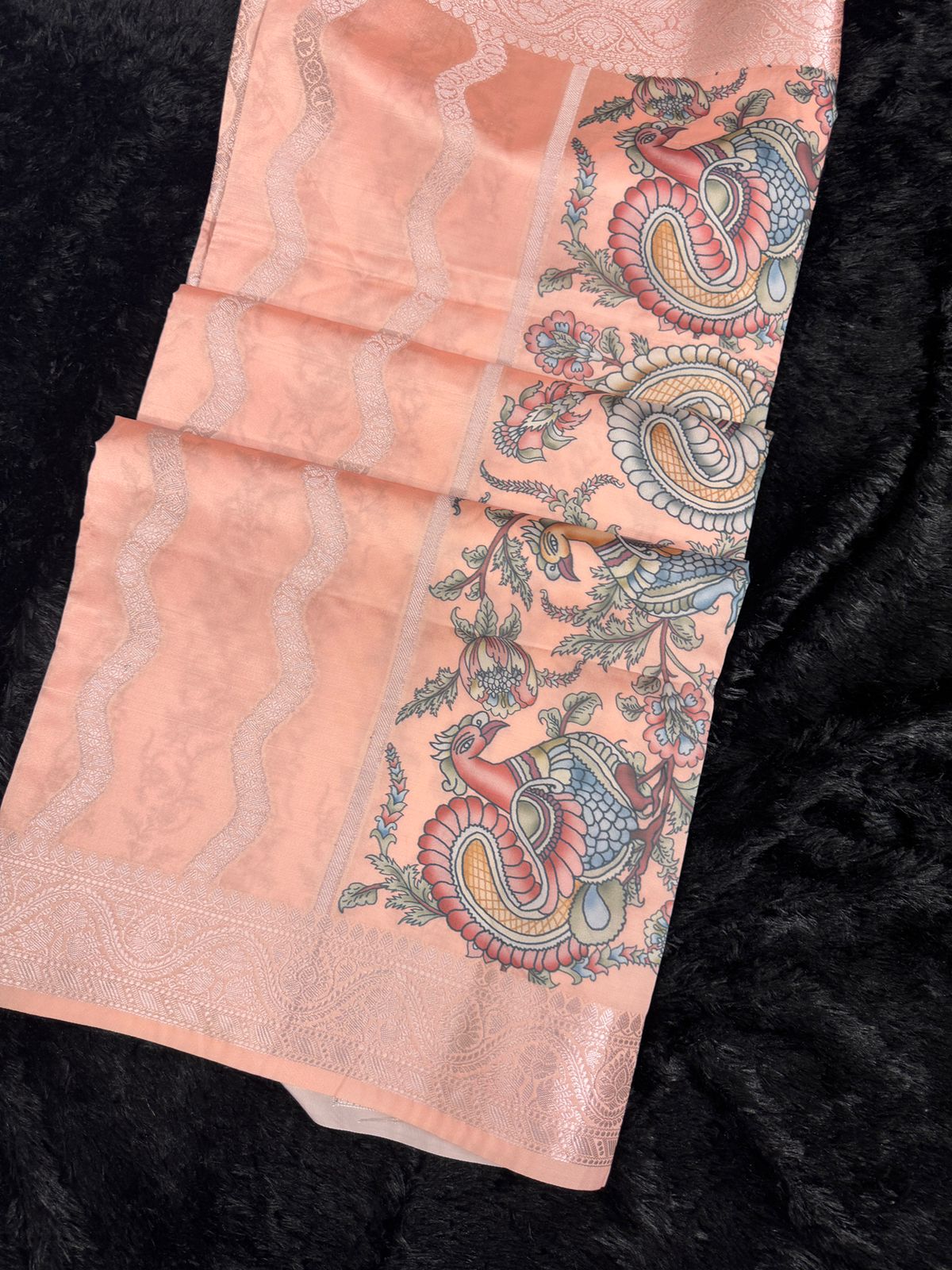 This is a beautifully crafted Tussar silk saree in a soft peach shade. It features intricate woven patterns along the borders, adding elegance to the overall look. The saree showcases traditional motifs with vibrant floral designs and a peacock motif on the pallu, highlighting fine craftsmanship. Its light texture and graceful sheen make it suitable for festive occasions and celebrations.