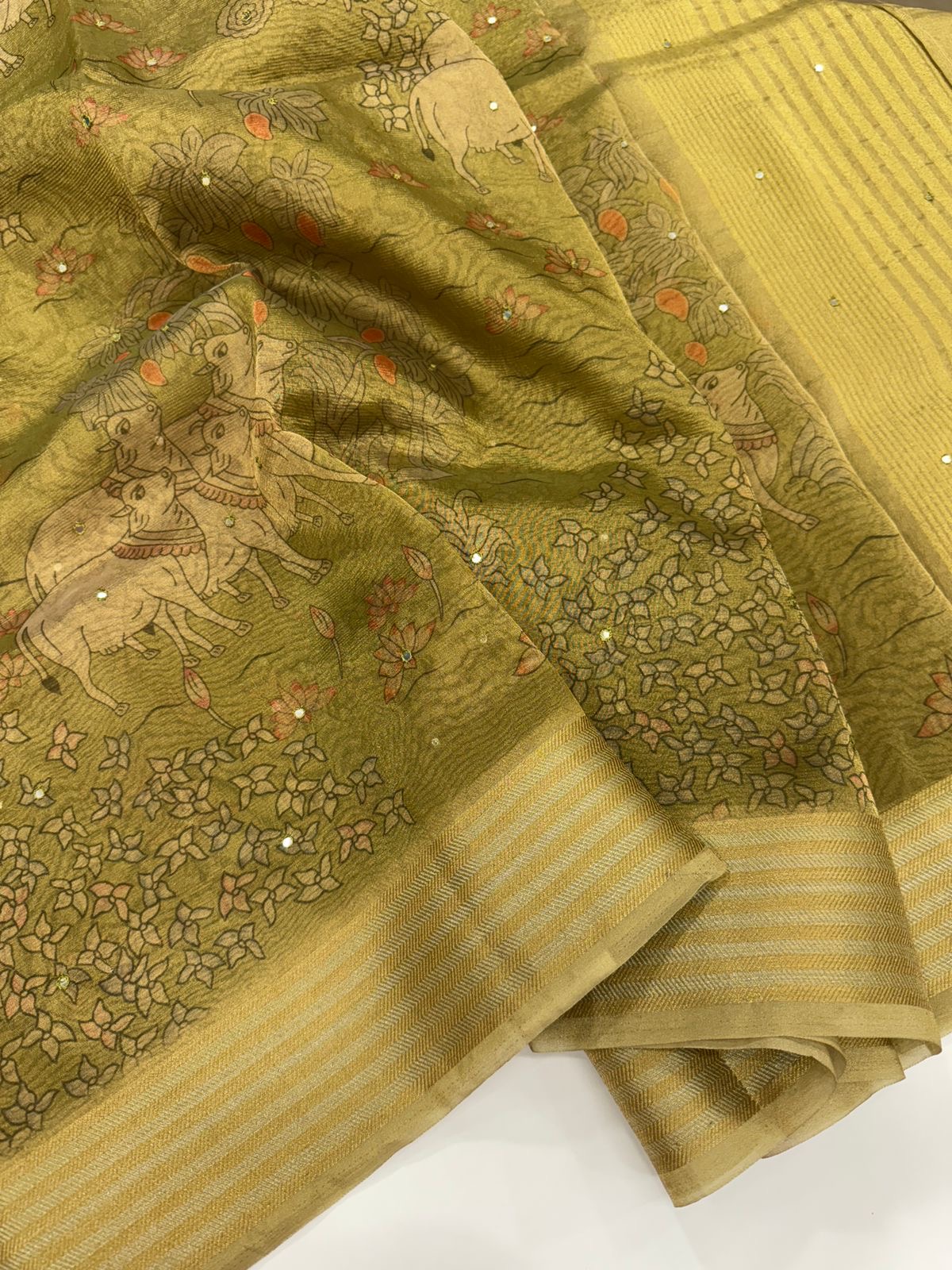 This exquisitely woven Banarasi saree in antique olive green features intricate printed motifs of cows, florals, and foliage, symbolizing prosperity and tradition. Crafted in fine silk with delicate zari stripes on the border and subtle sequin embellishments, it beautifully balances heritage artistry with contemporary elegance. Ideal for festive occasions, weddings, and cultural celebrations.
